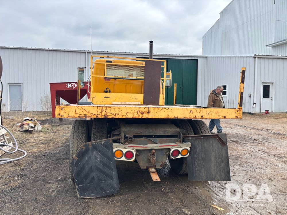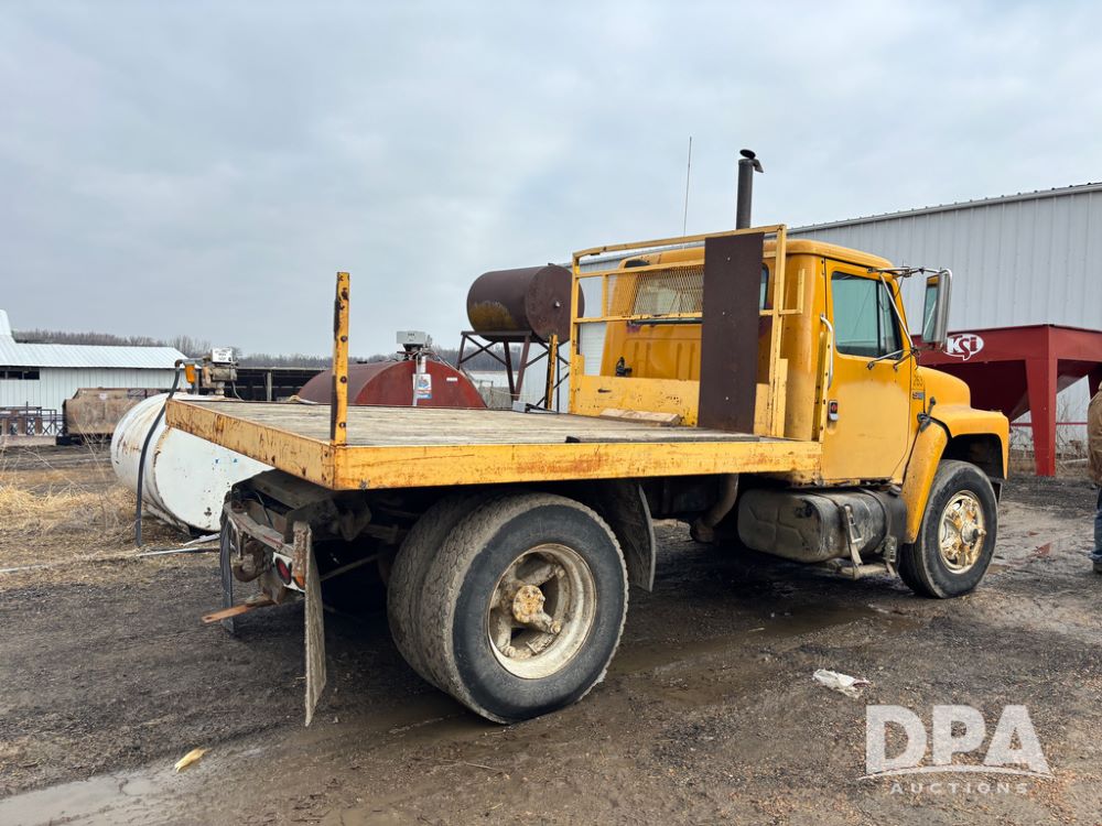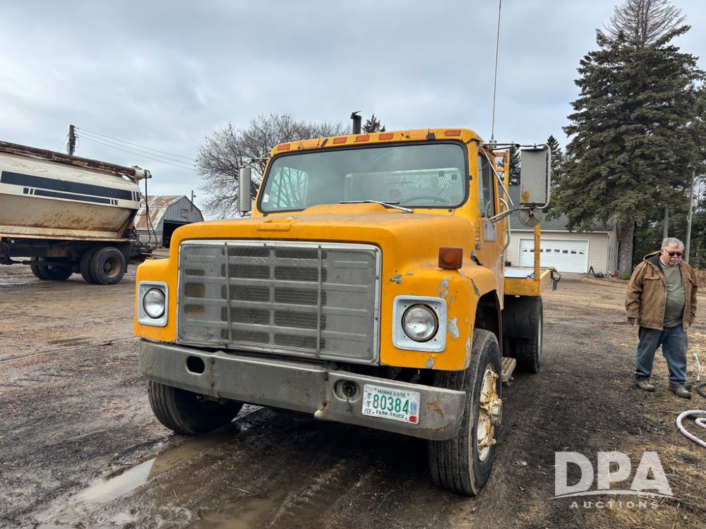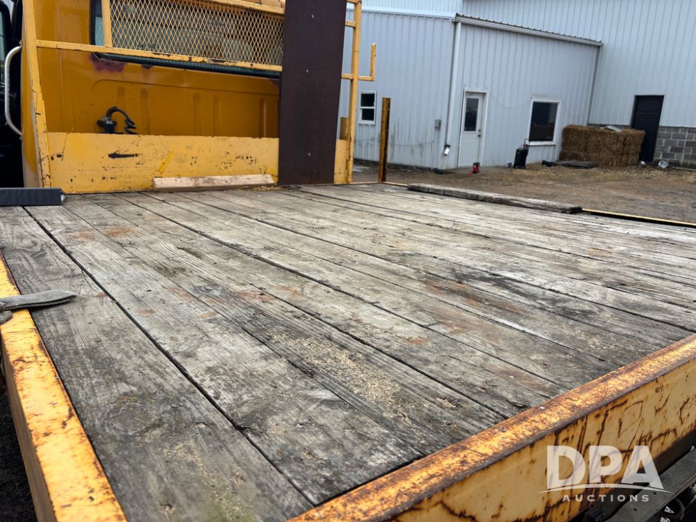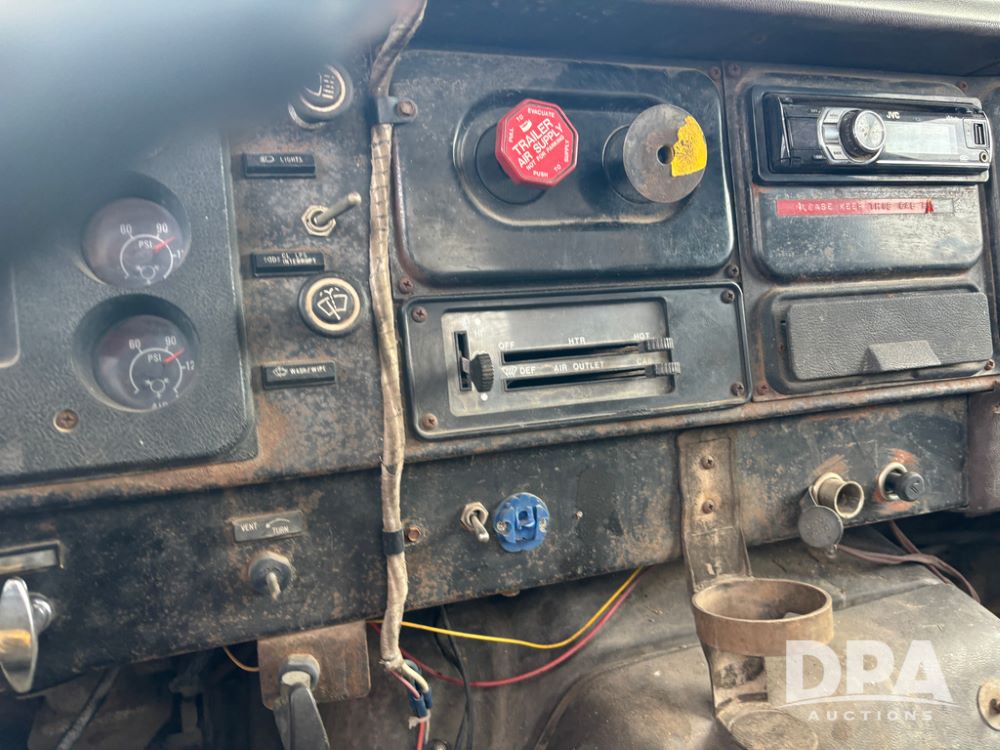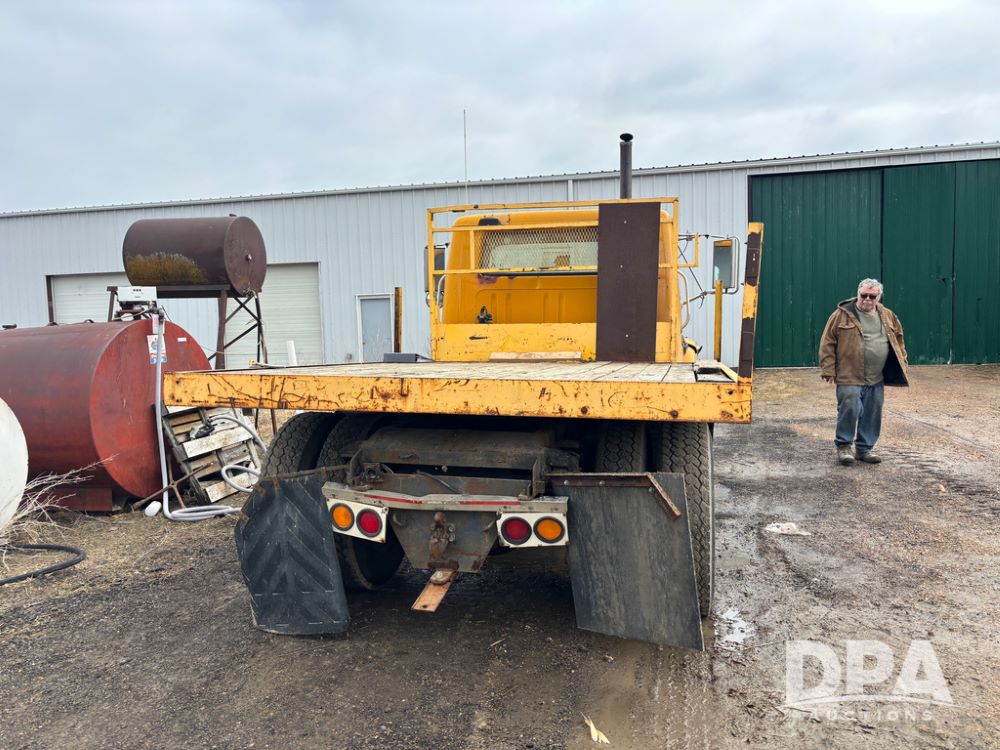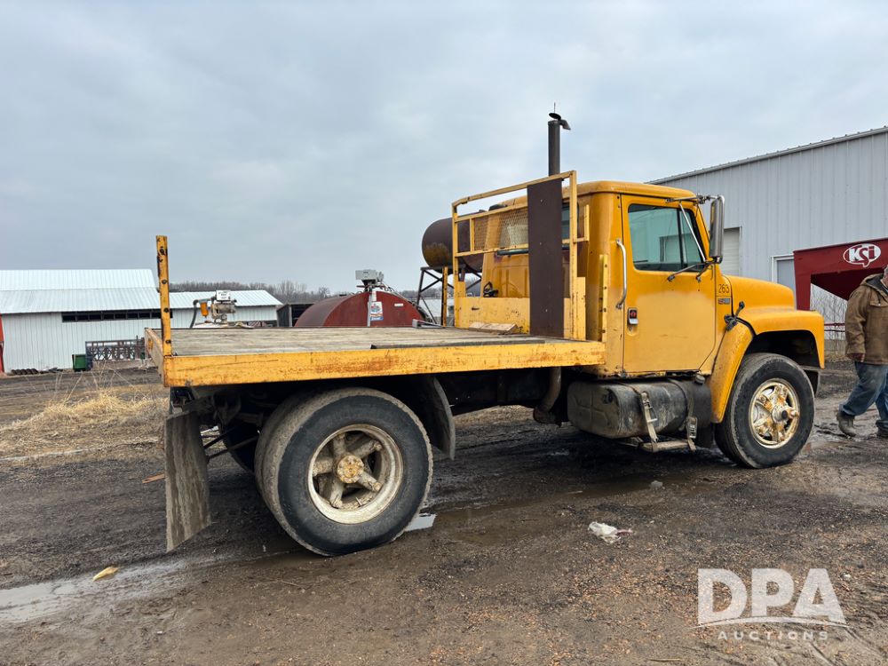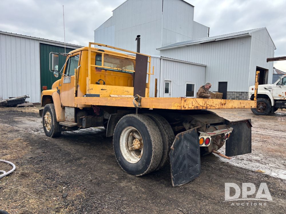 1989 International S Series (DR13412), DT diesel engine, 4 speed transmission, single axle, air brakes, 5th plate, 9' wood deck flatbed hooks on 5th wheel, glad hand air brakes, rear pintle hitch, odometer reads 456,077 miles.