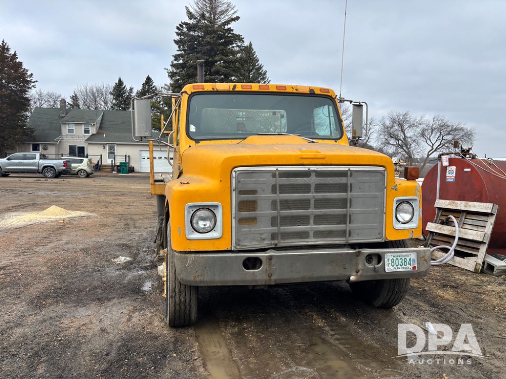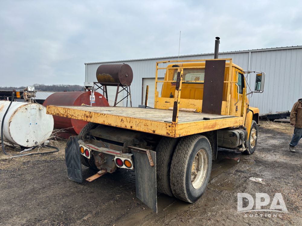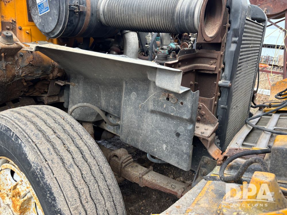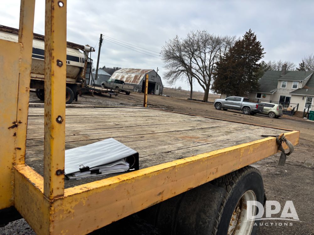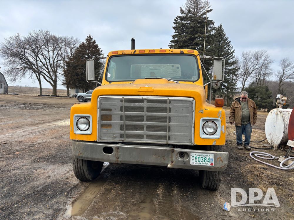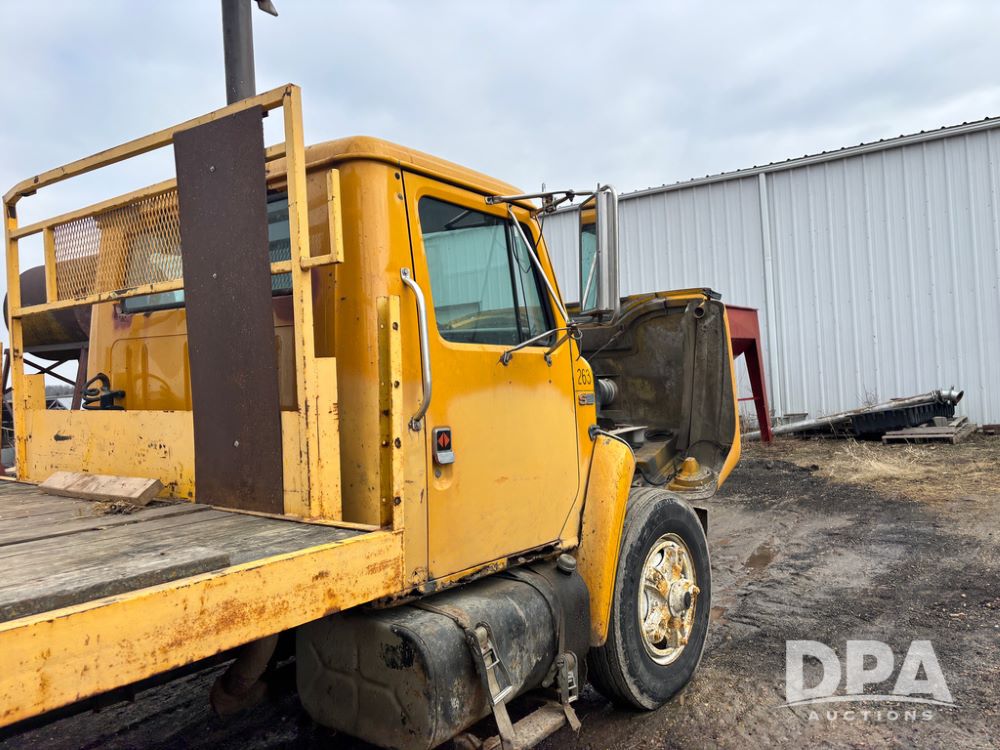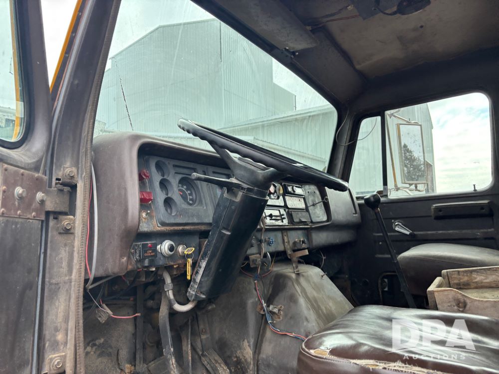 1989 International S Series (DR13412), DT diesel engine, 4 speed transmission, single axle, air brakes, 5th plate, 9' wood deck flatbed hooks on 5th wheel, glad hand air brakes, rear pintle hitch, odometer reads 456,077 miles.