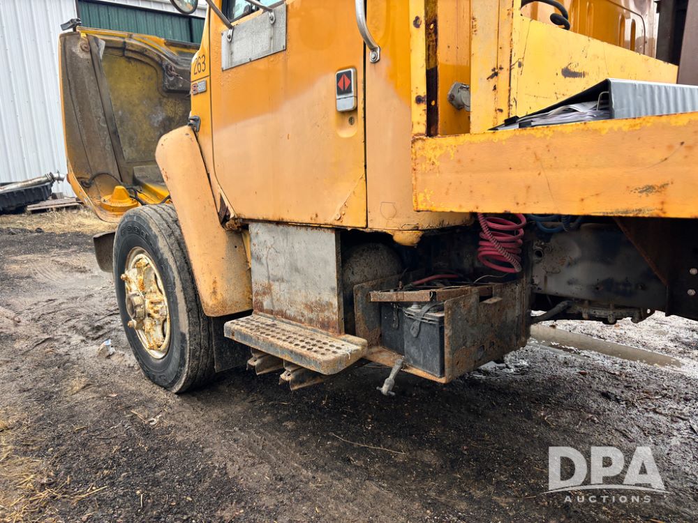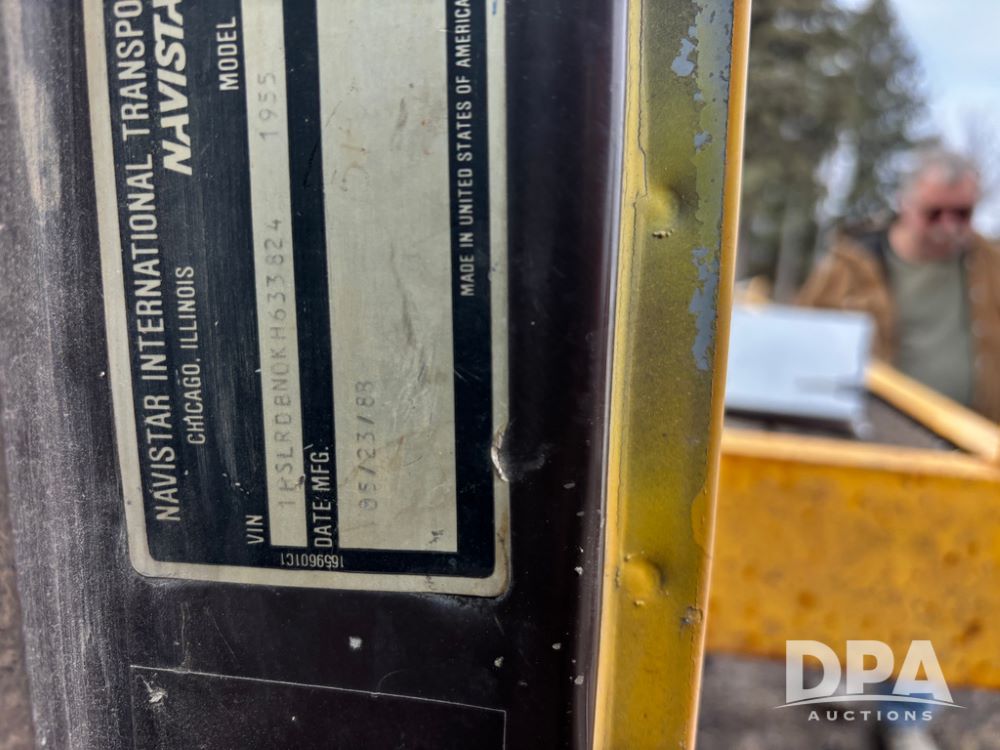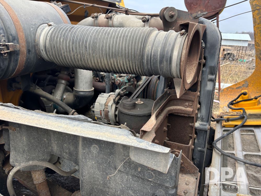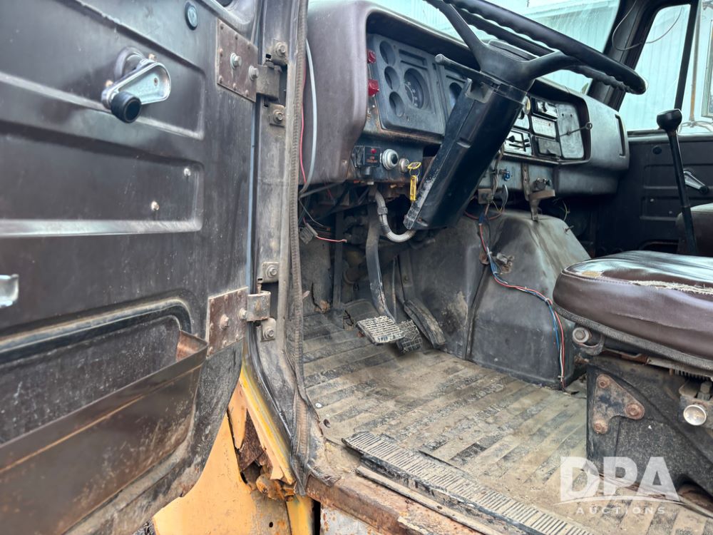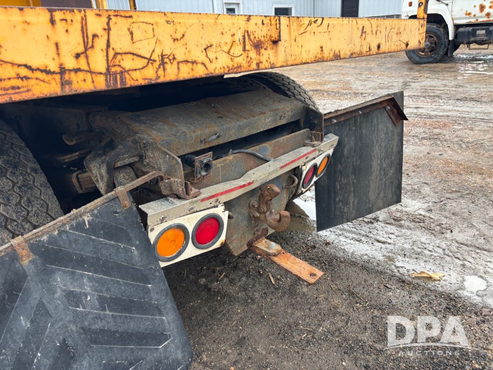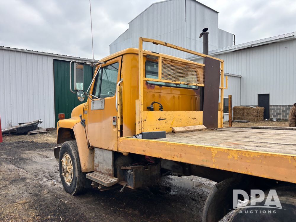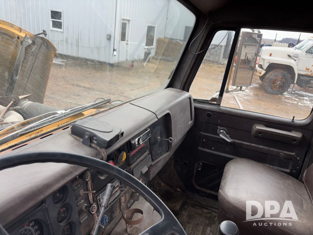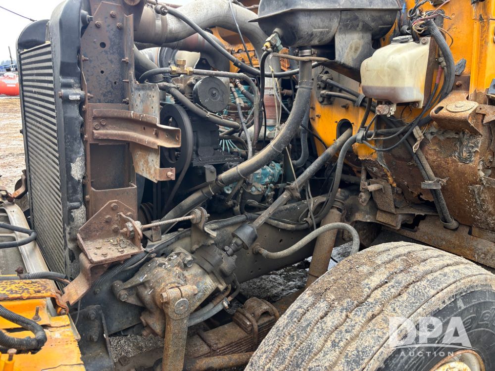 1989 International S Series (DR13412), DT diesel engine, 4 speed transmission, single axle, air brakes, 5th plate, 9' wood deck flatbed hooks on 5th wheel, glad hand air brakes, rear pintle hitch, odometer reads 456,077 miles.