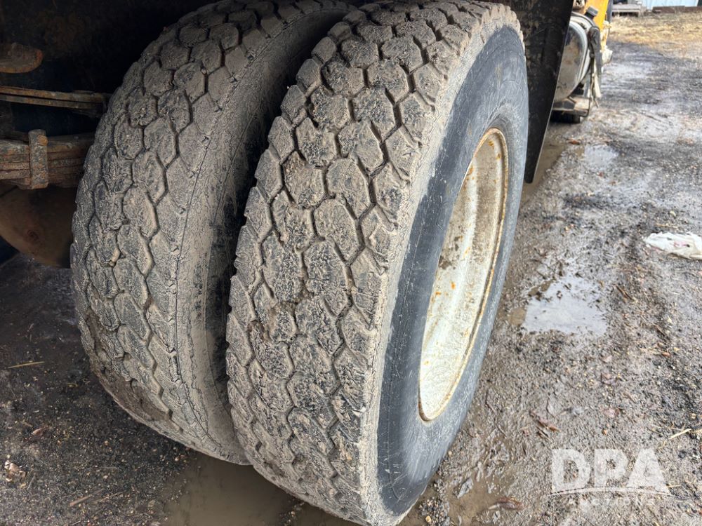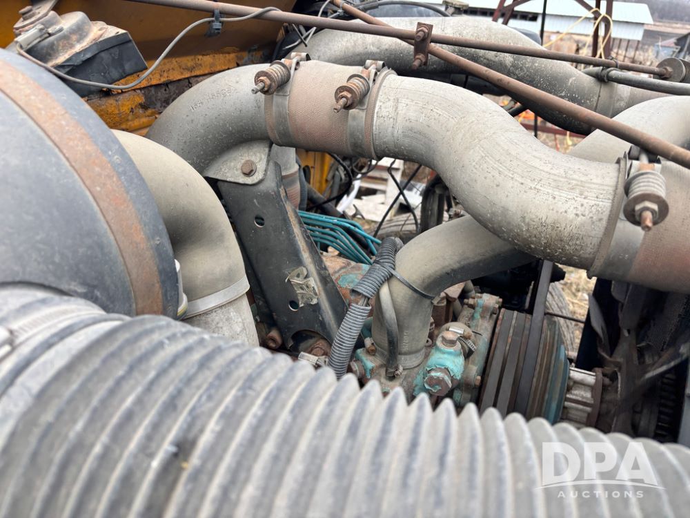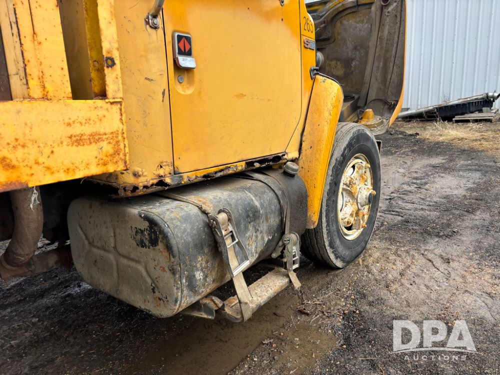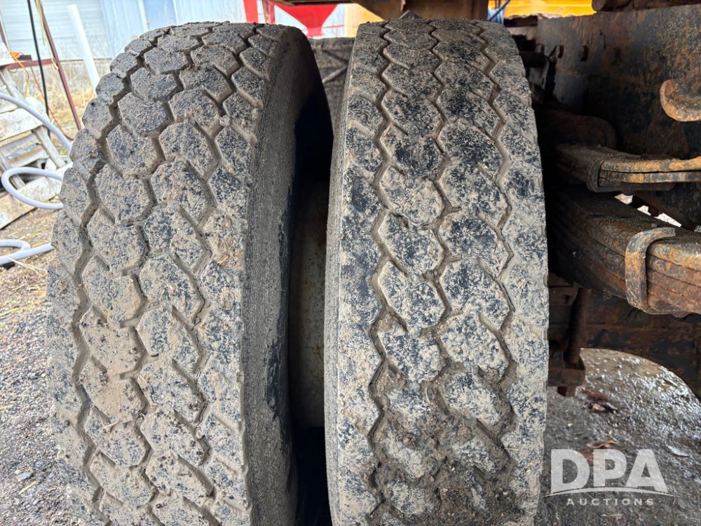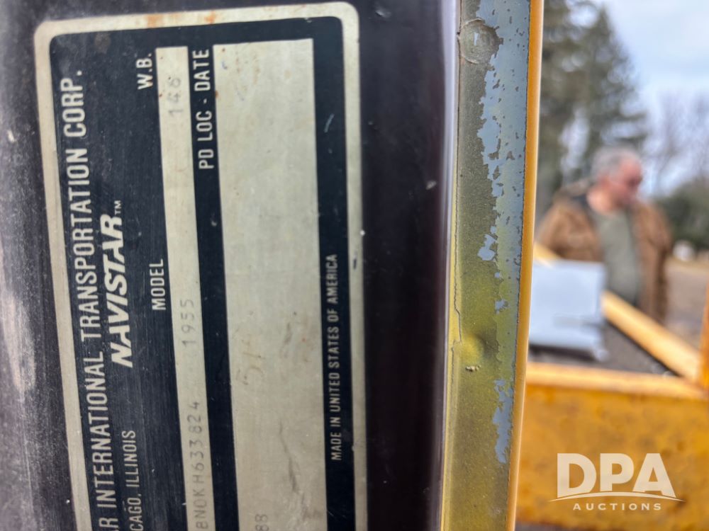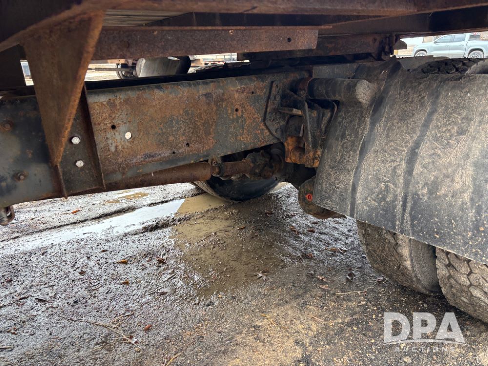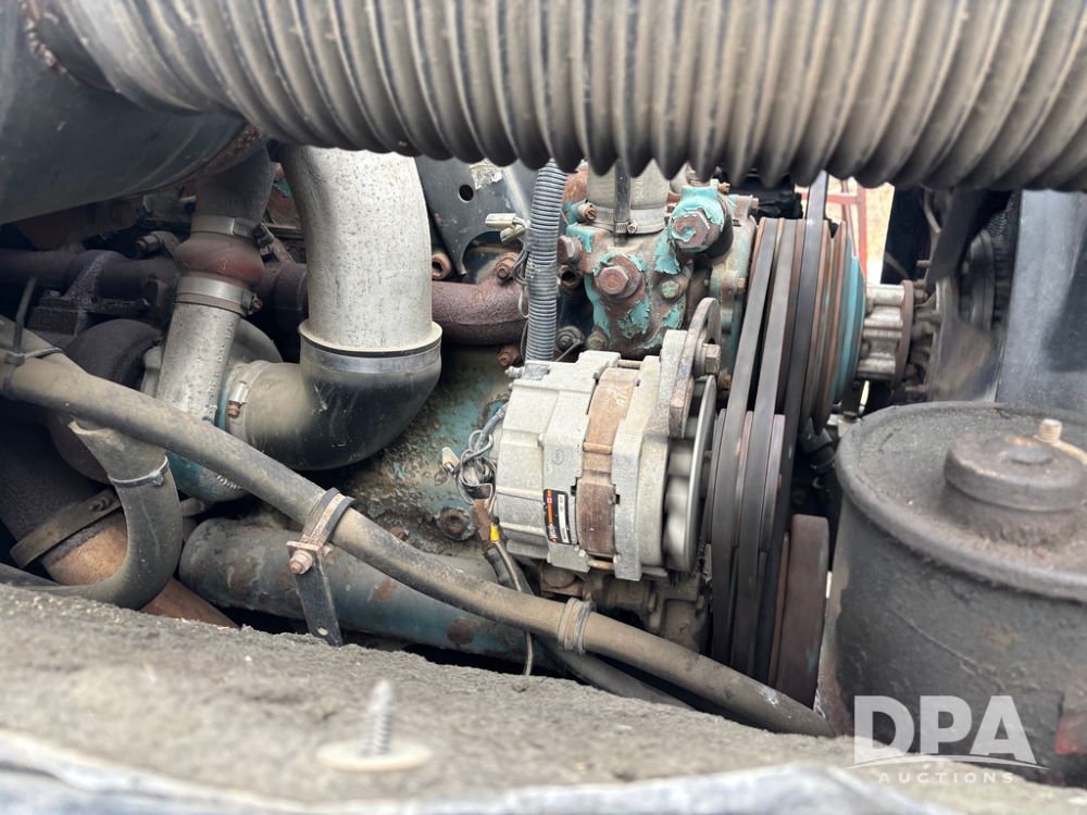 1989 International S Series (DR13412), DT diesel engine, 4 speed transmission, single axle, air brakes, 5th plate, 9' wood deck flatbed hooks on 5th wheel, glad hand air brakes, rear pintle hitch, odometer reads 456,077 miles.