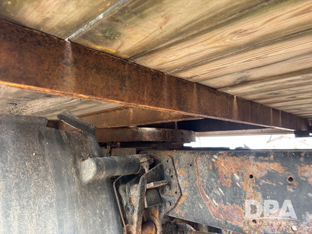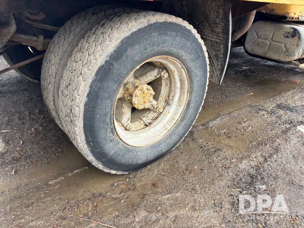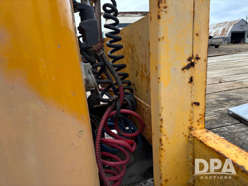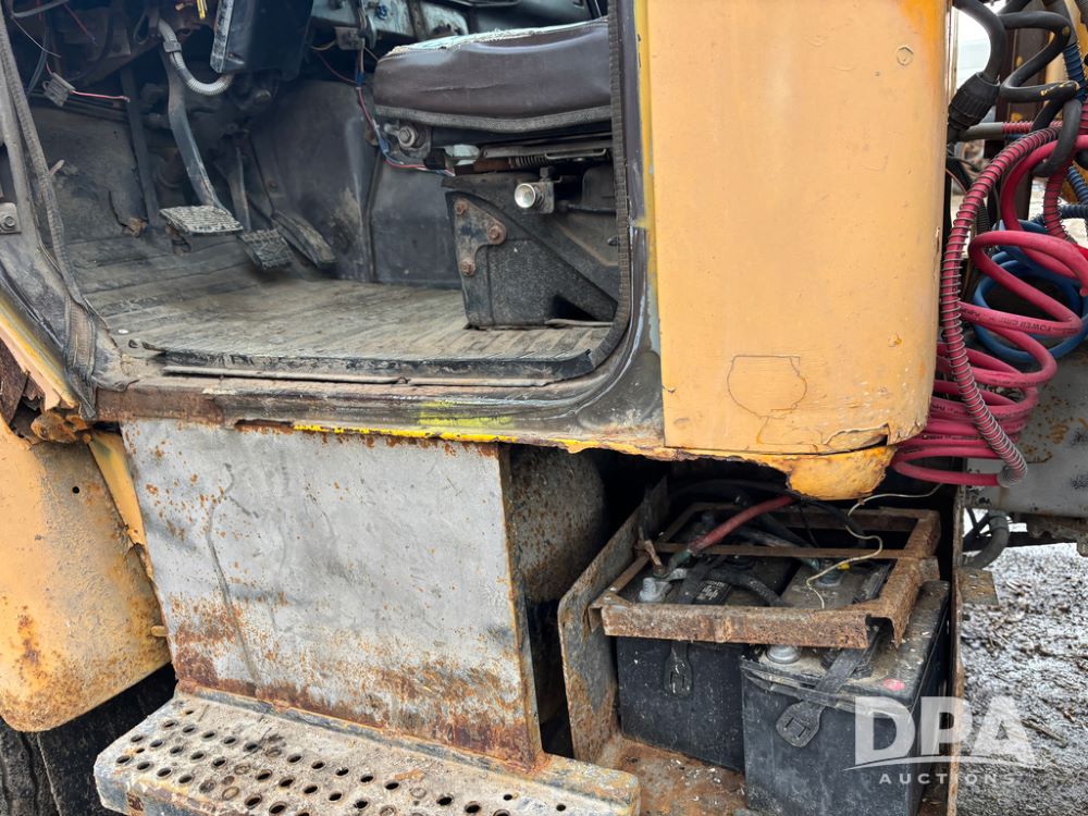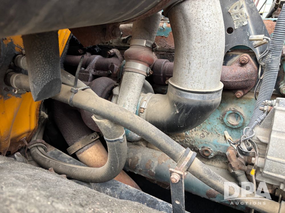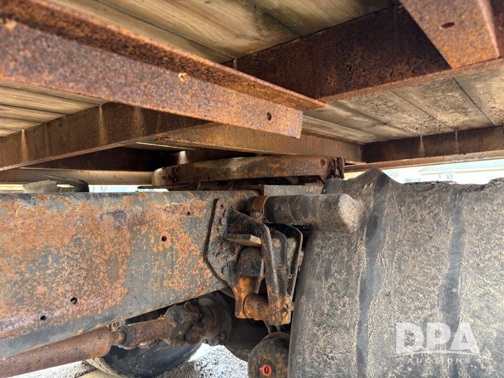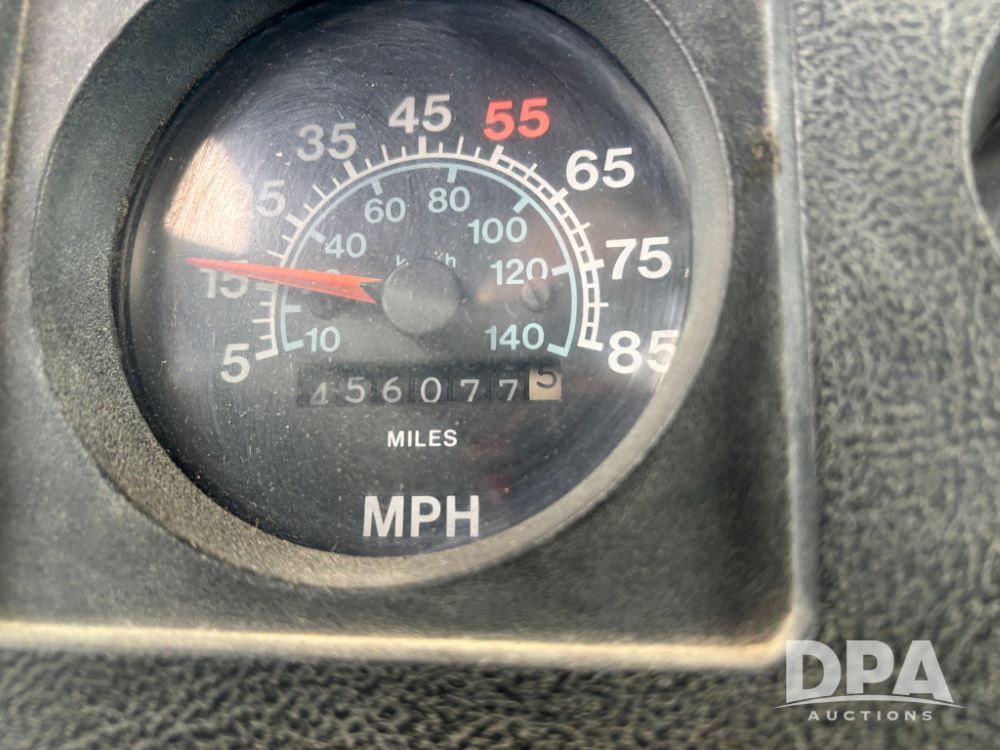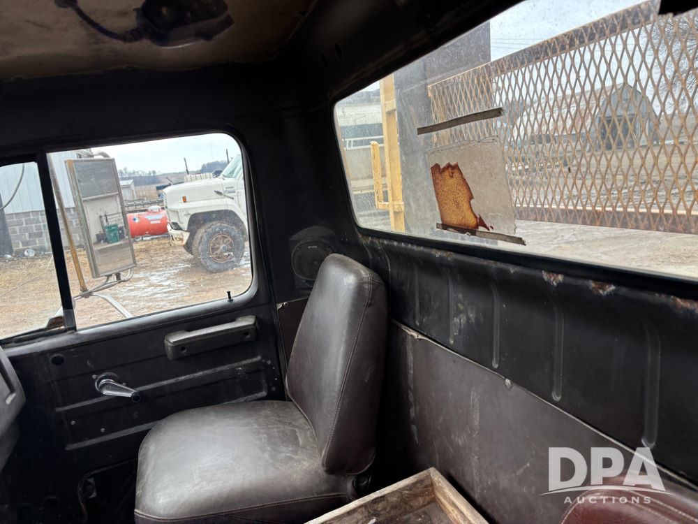 1989 International S Series (DR13412), DT diesel engine, 4 speed transmission, single axle, air brakes, 5th plate, 9' wood deck flatbed hooks on 5th wheel, glad hand air brakes, rear pintle hitch, odometer reads 456,077 miles.