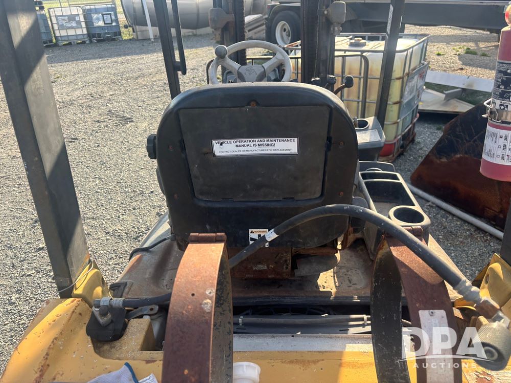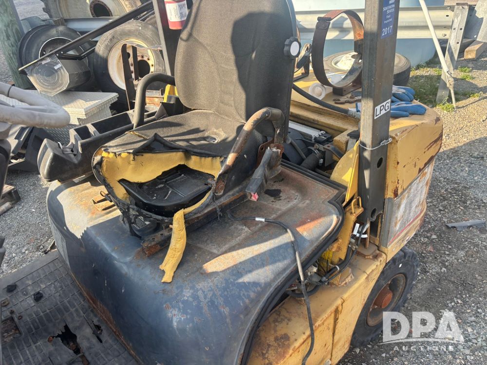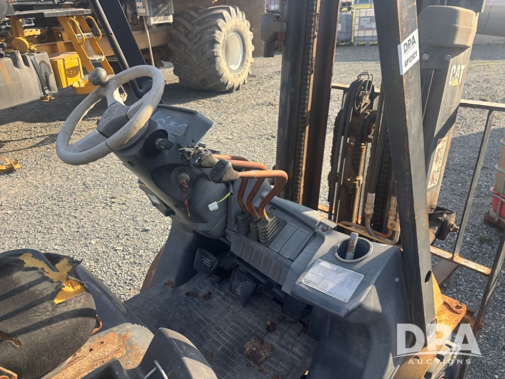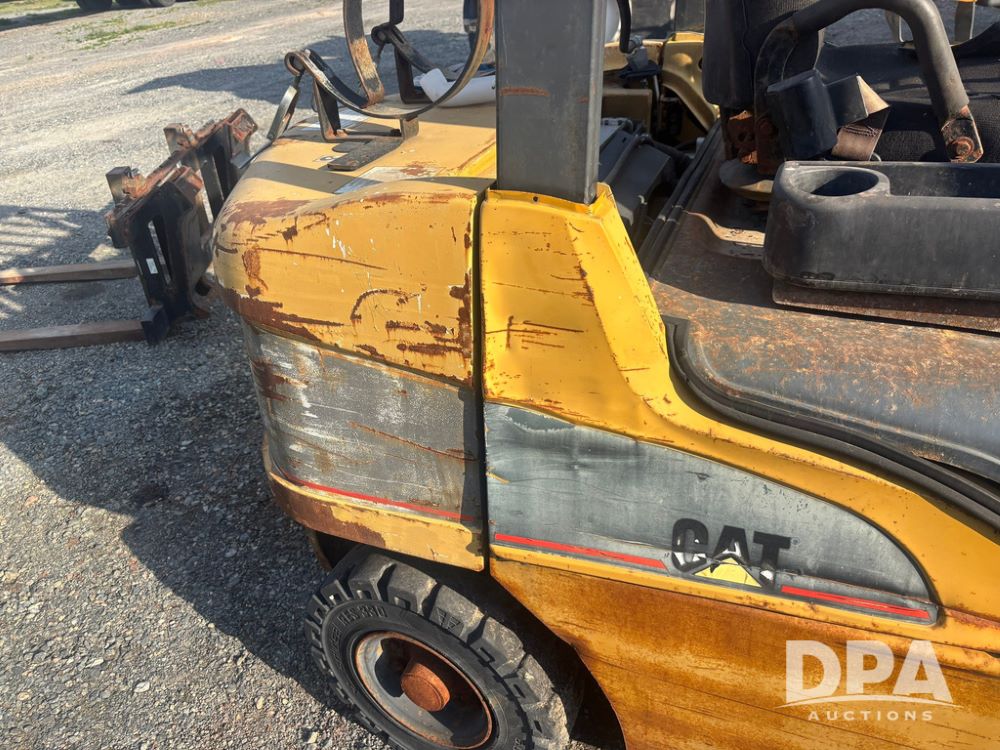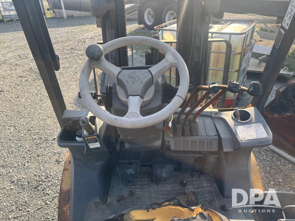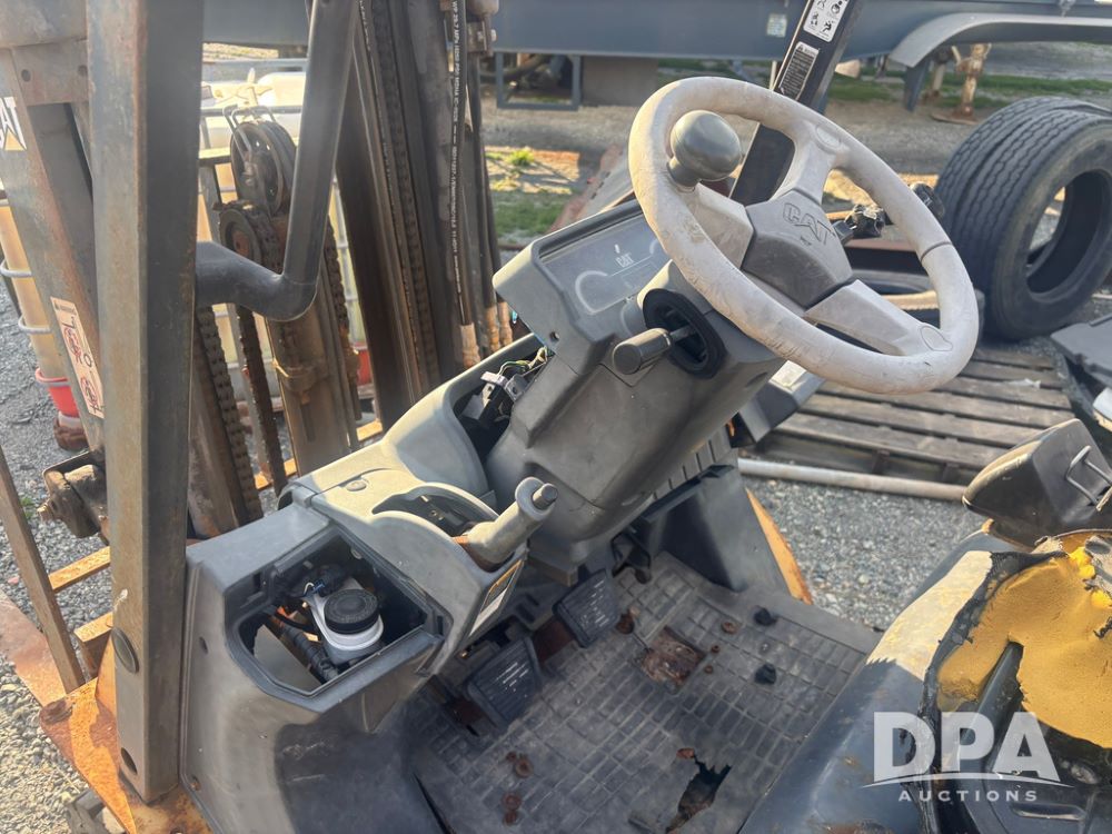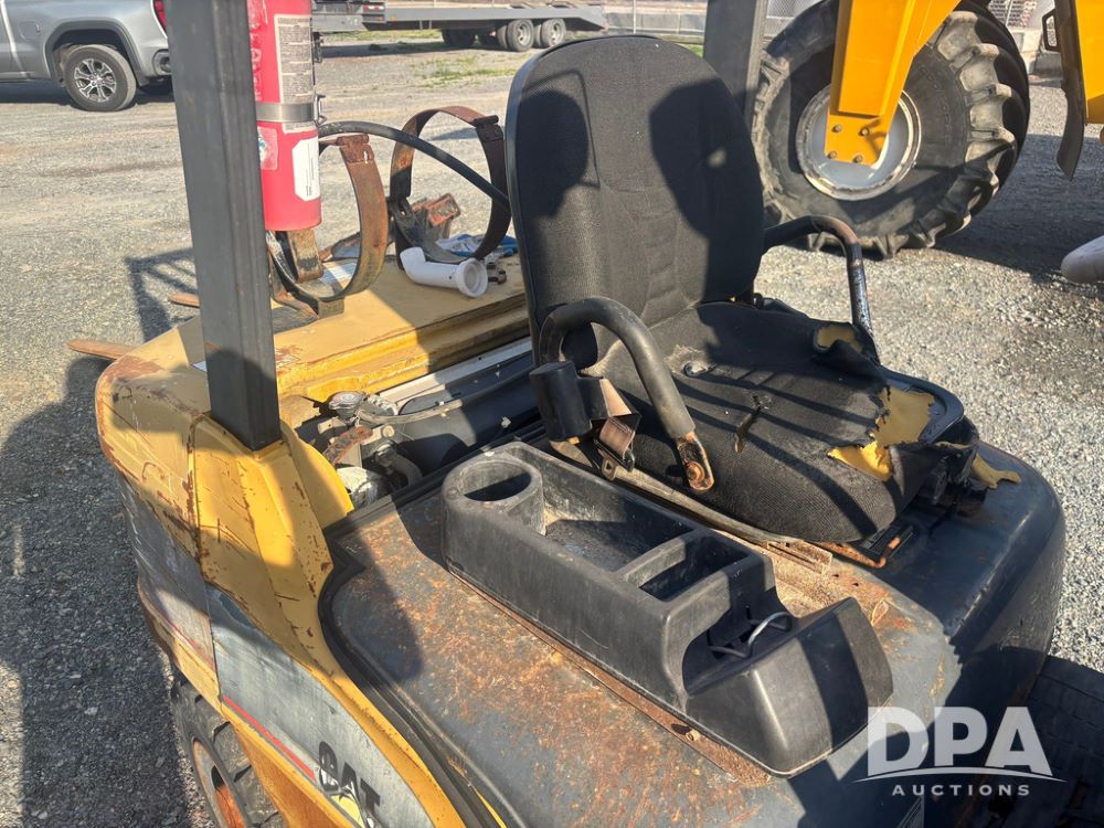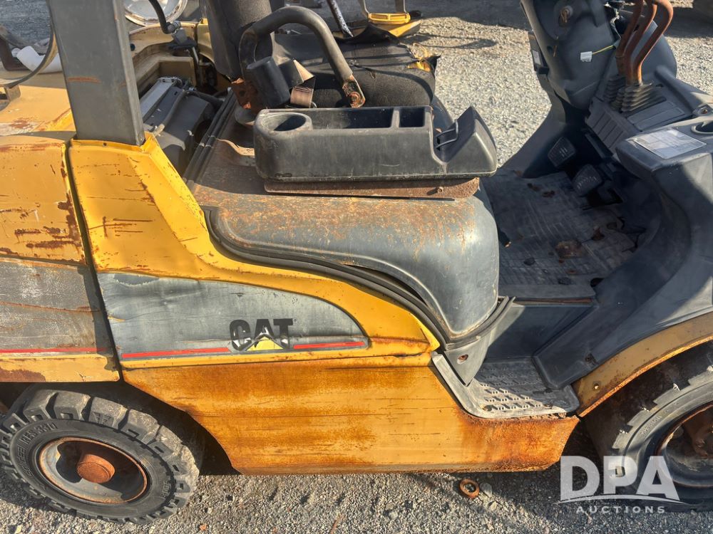 Cat Model P5000 Forklift (GP12921), LP gas, shuttle shift, approx. 4,500 pound lift capacity, forks, tilt, side shift, 6.00-9 rear tires, 7.00-12 front tires.