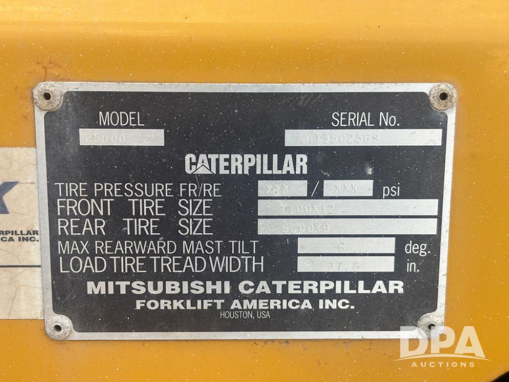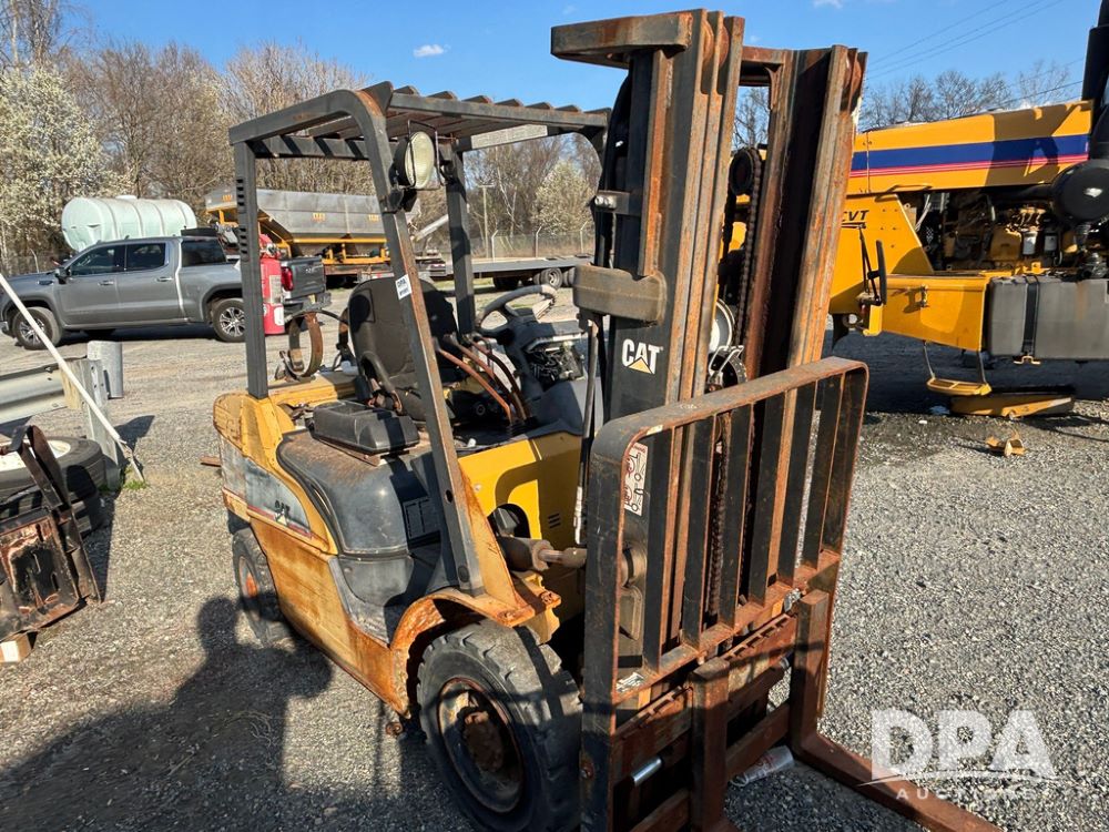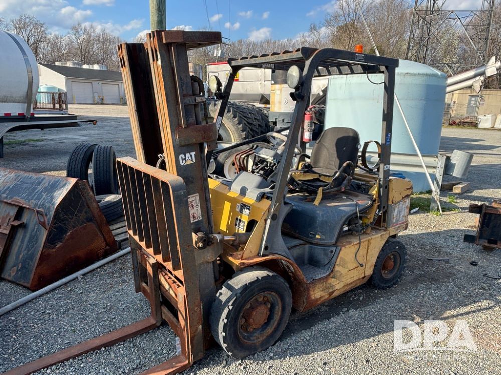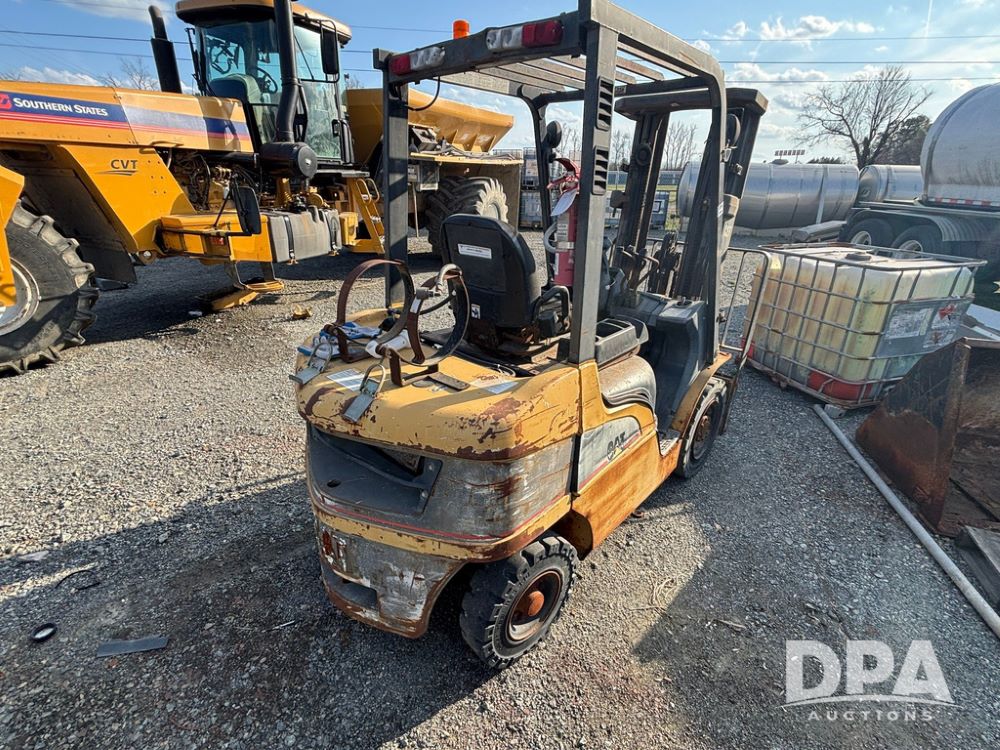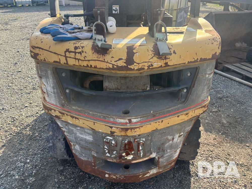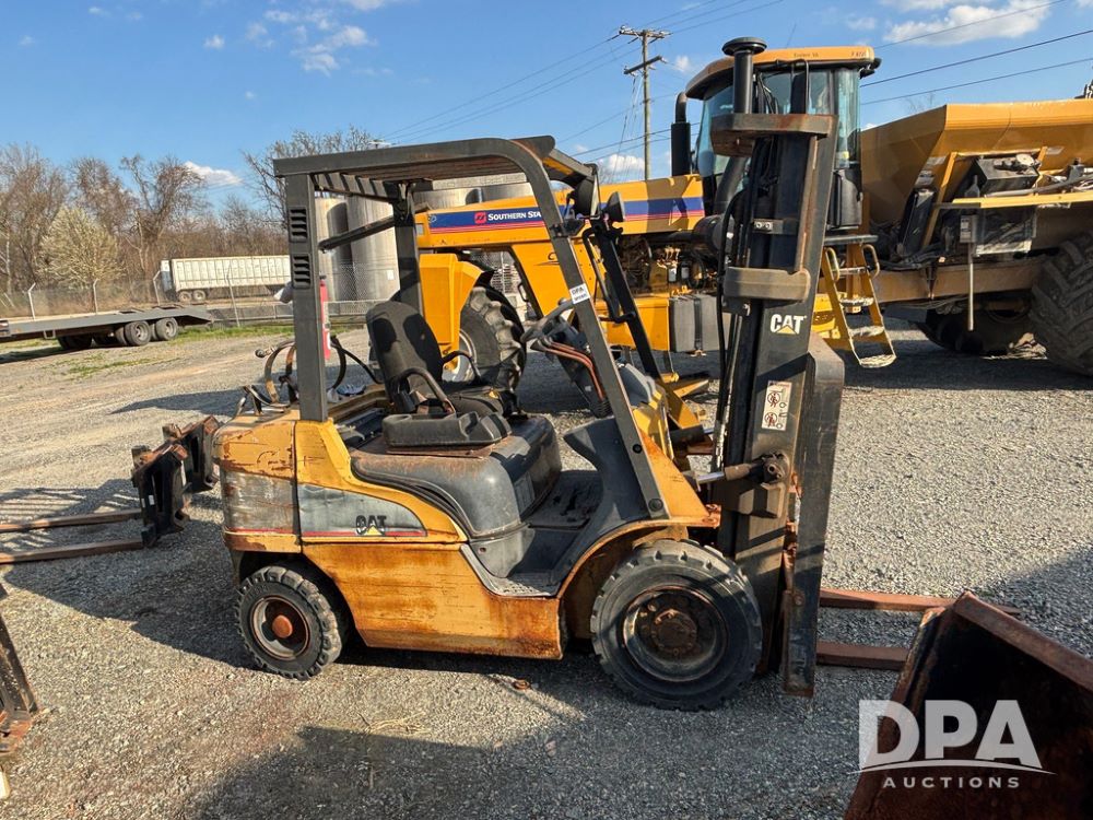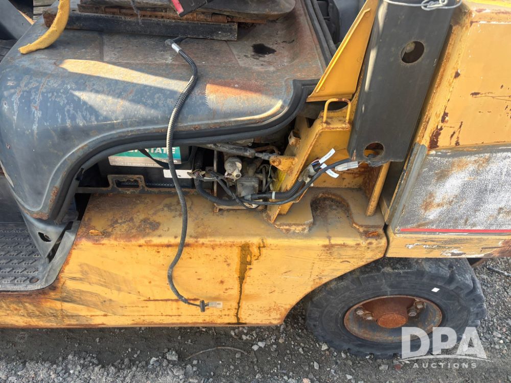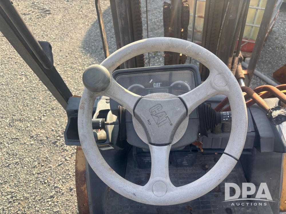 Cat Model P5000 Forklift (GP12921), LP gas, shuttle shift, approx. 4,500 pound lift capacity, forks, tilt, side shift, 6.00-9 rear tires, 7.00-12 front tires.