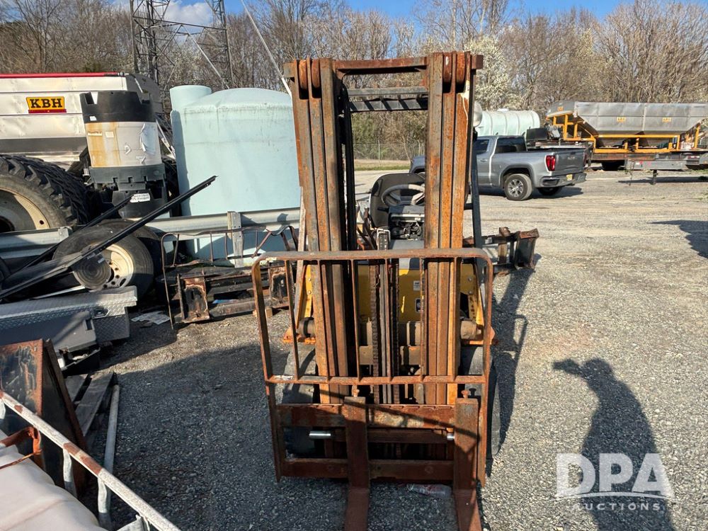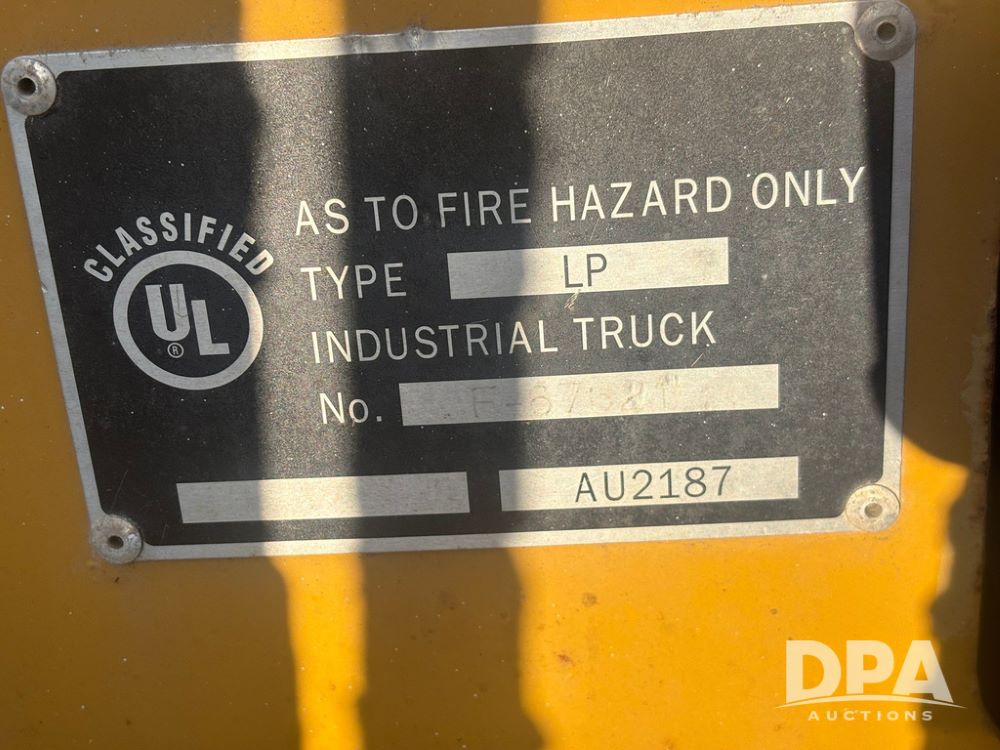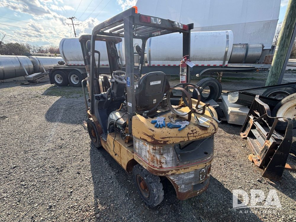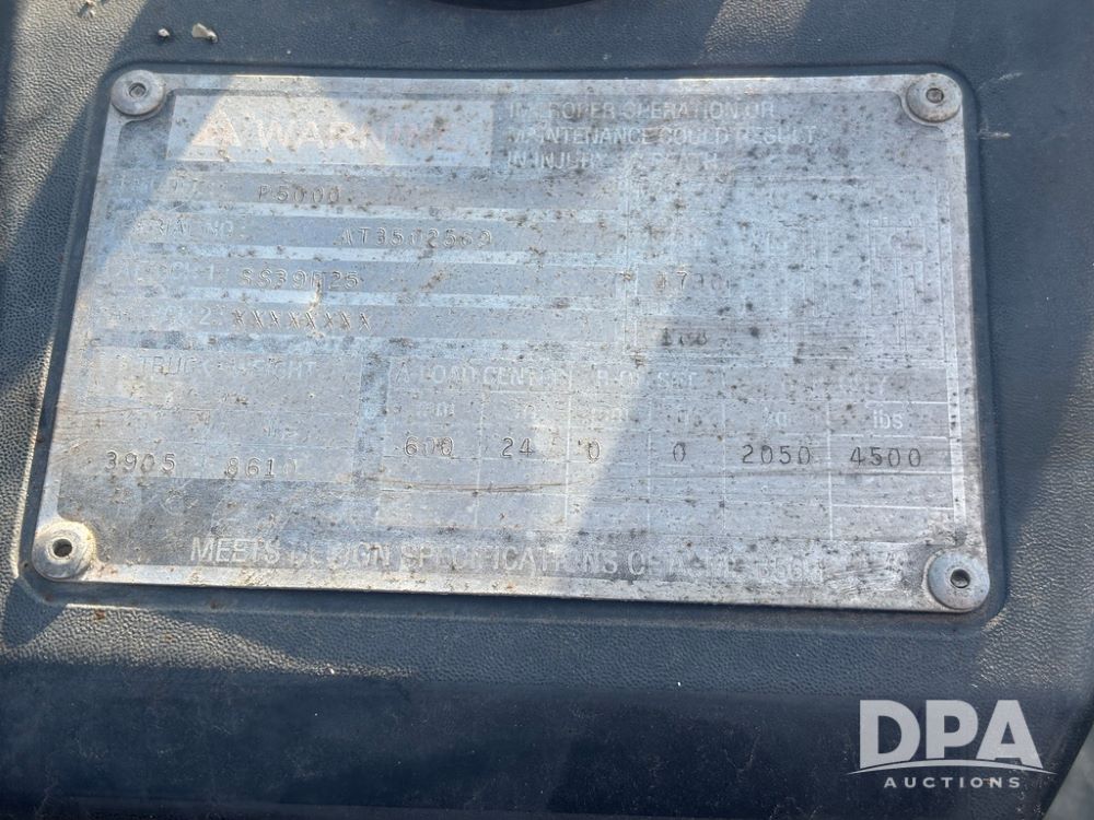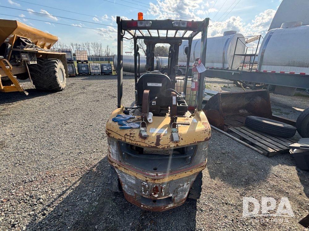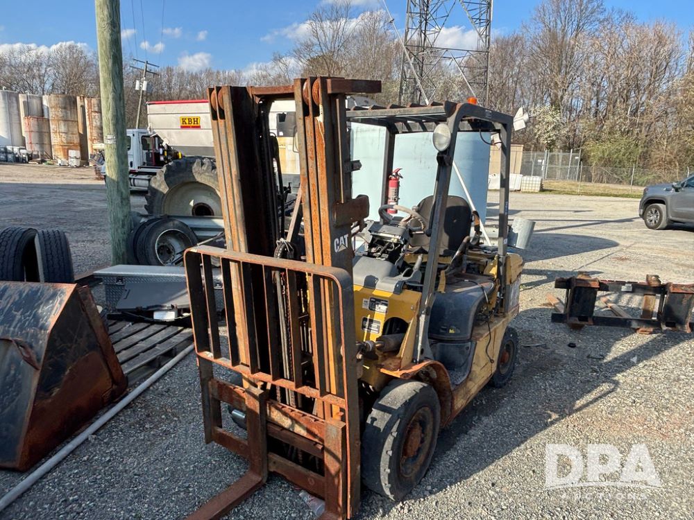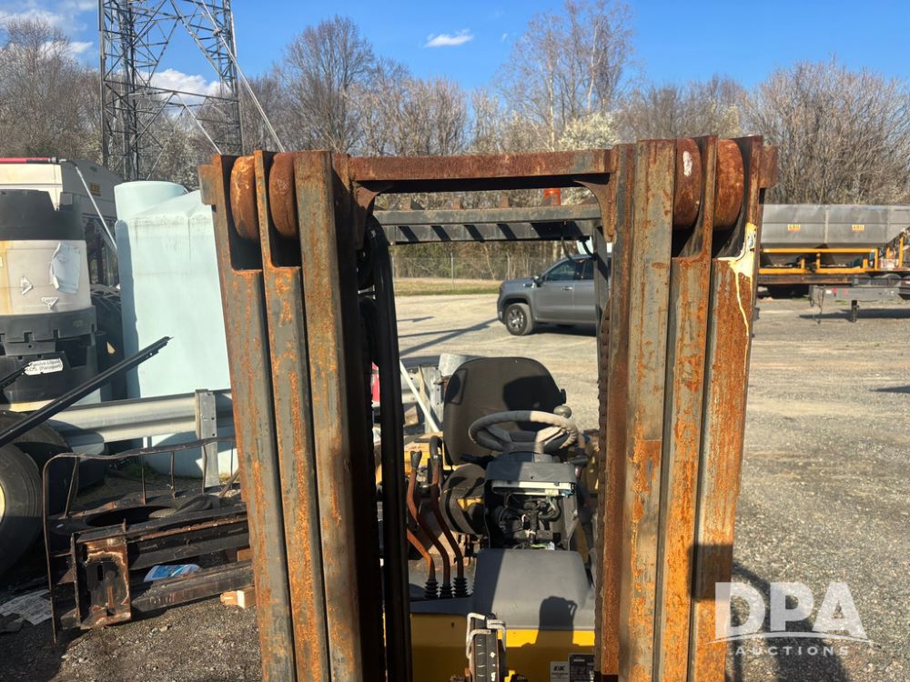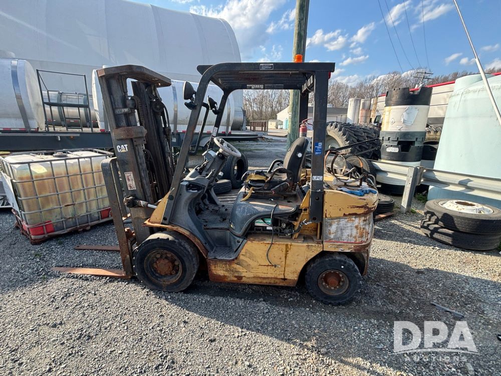 Cat Model P5000 Forklift (GP12921), LP gas, shuttle shift, approx. 4,500 pound lift capacity, forks, tilt, side shift, 6.00-9 rear tires, 7.00-12 front tires.