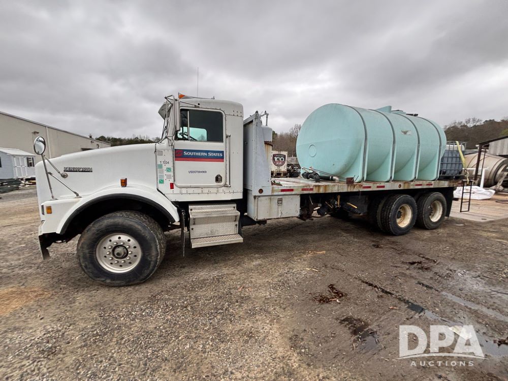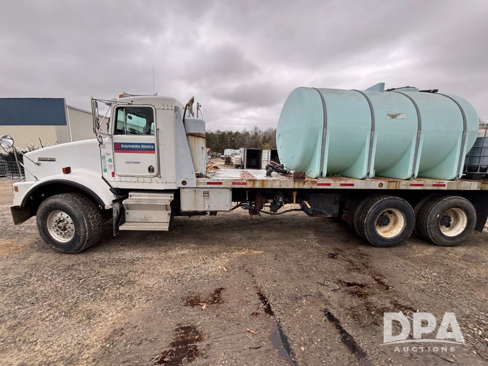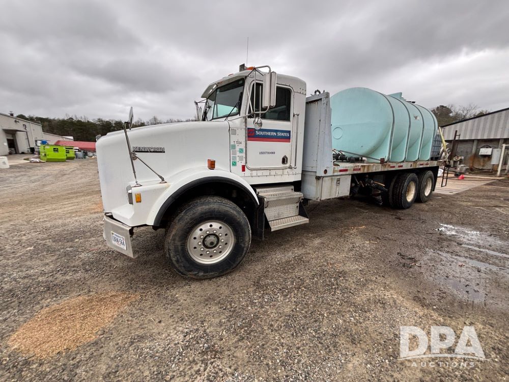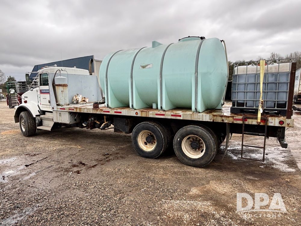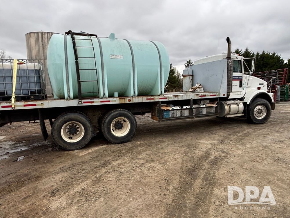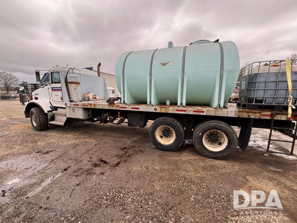 1994 Kenworth T800 Liquid Nurse Truck (GP12931, Unit T7234), Cummins N14 diesel engine, Super 10 speed transmission, heat, Am/Fm radio, tandem axle, air ride suspension, rear flatbed, approx. 3,000 gallon poly flat bottom liquid tank, pump, 425/65R22.5 front tires, 12R22.5 rear tires, shows 398,215 miles.