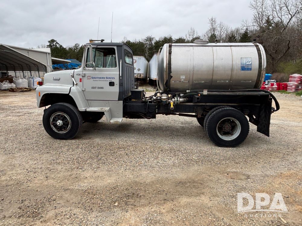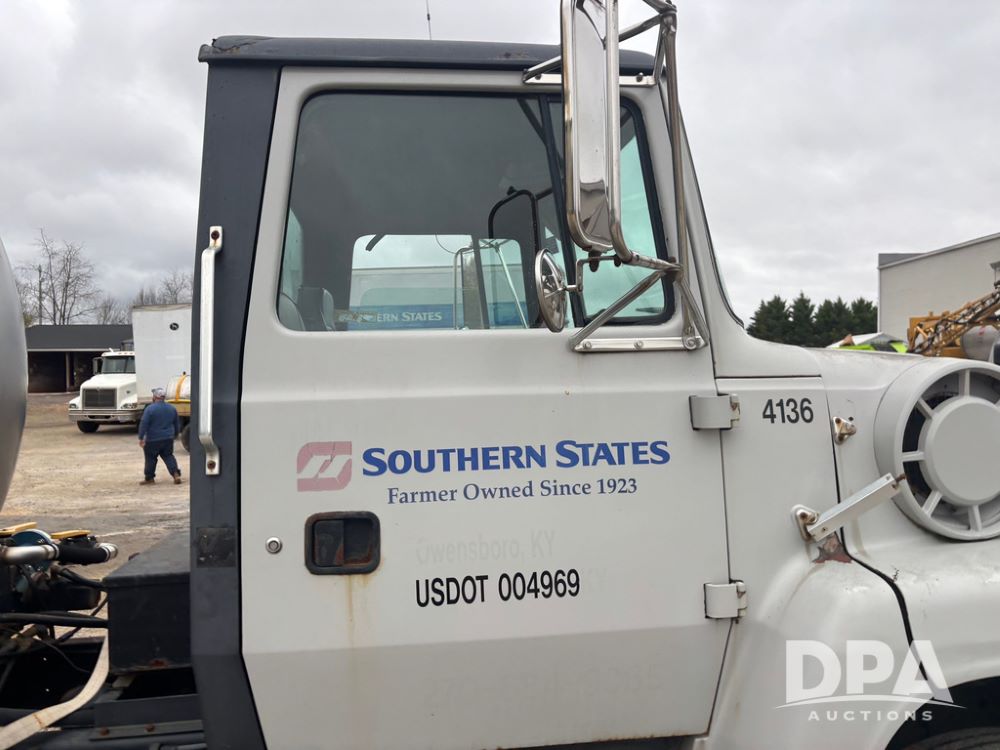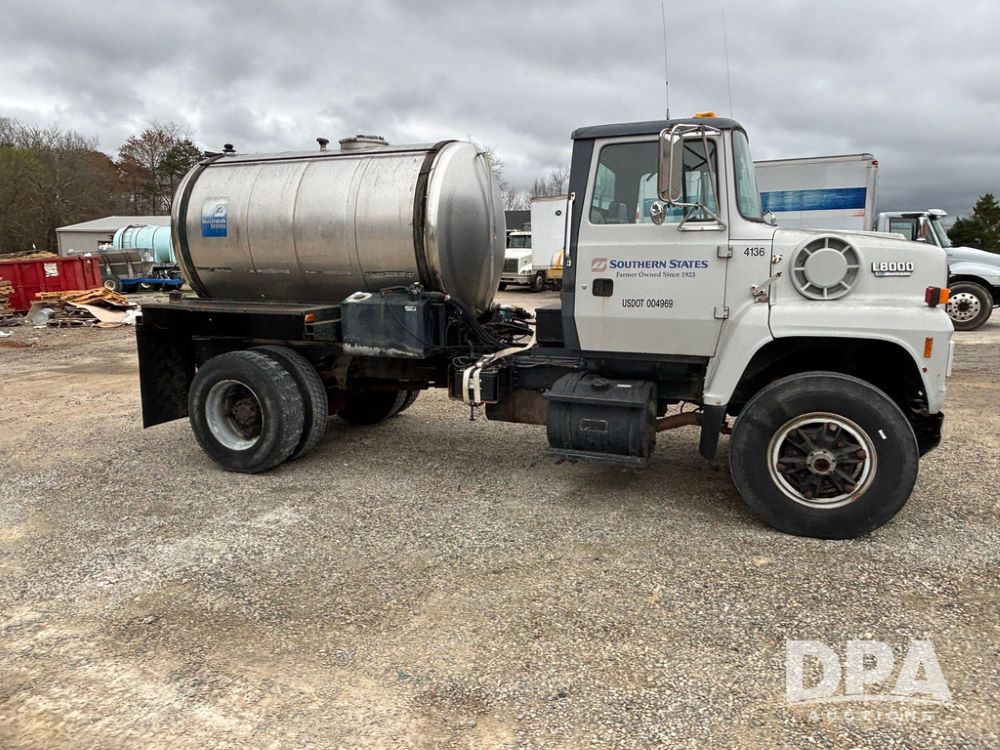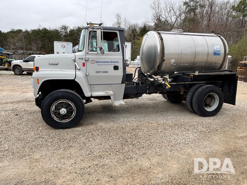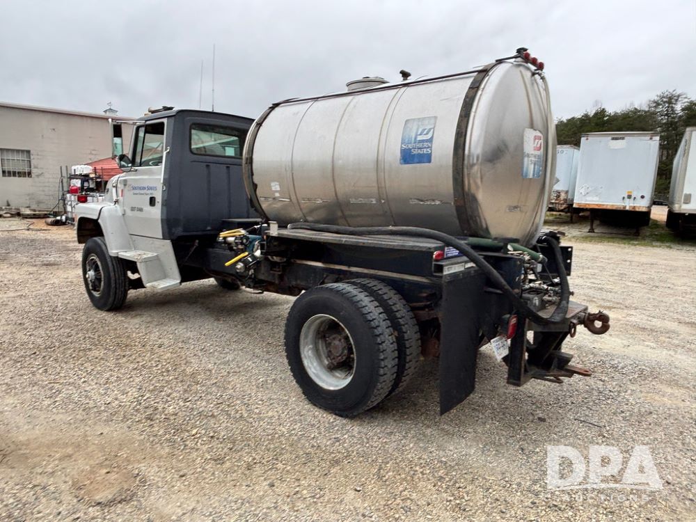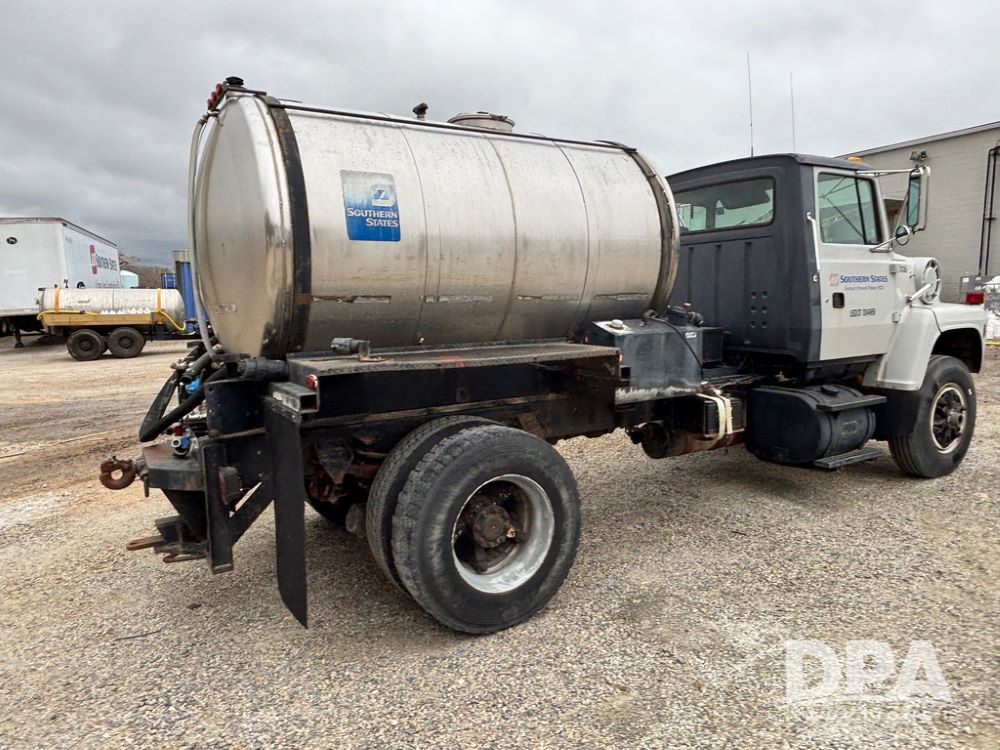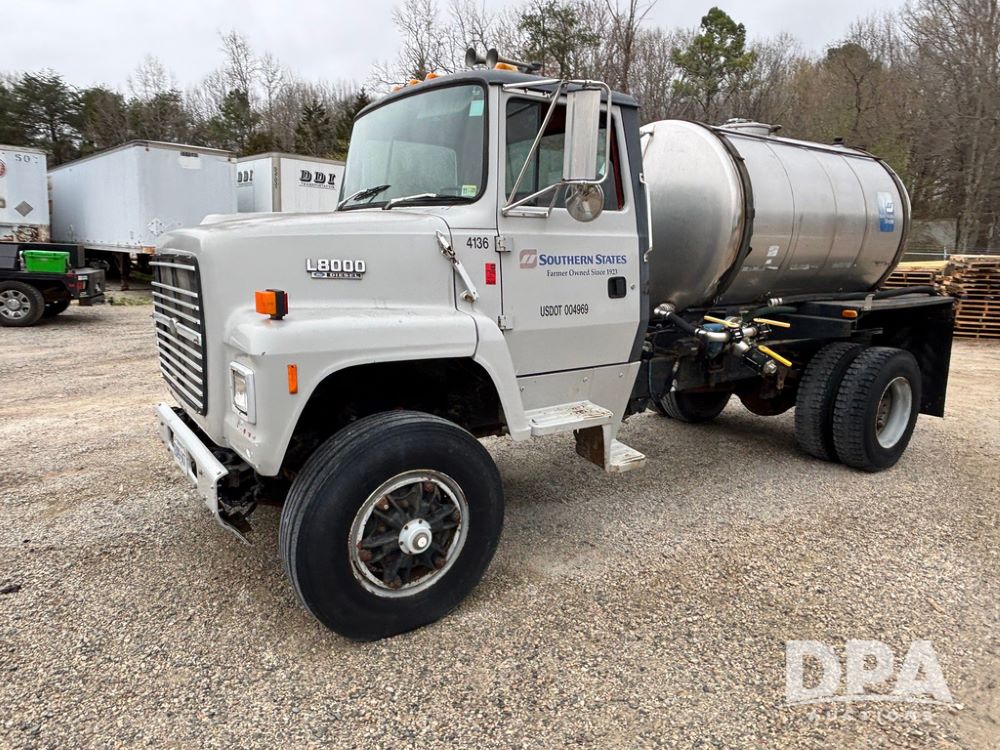 1991 Ford L8000 Liquid Nurse Truck (GP12933, Unit 4136), diesel engine, 5x2 transmission, heat, Am/Fm radio, single axle, spring suspension, approx. 1,000 gallon stainless steel liquid nurse tank, 11R22.5 tires, rear pintle hitch, shows 97,892 miles.