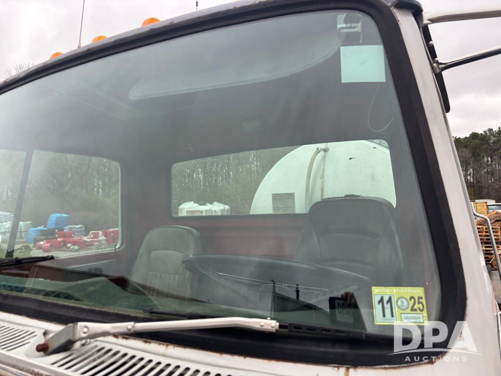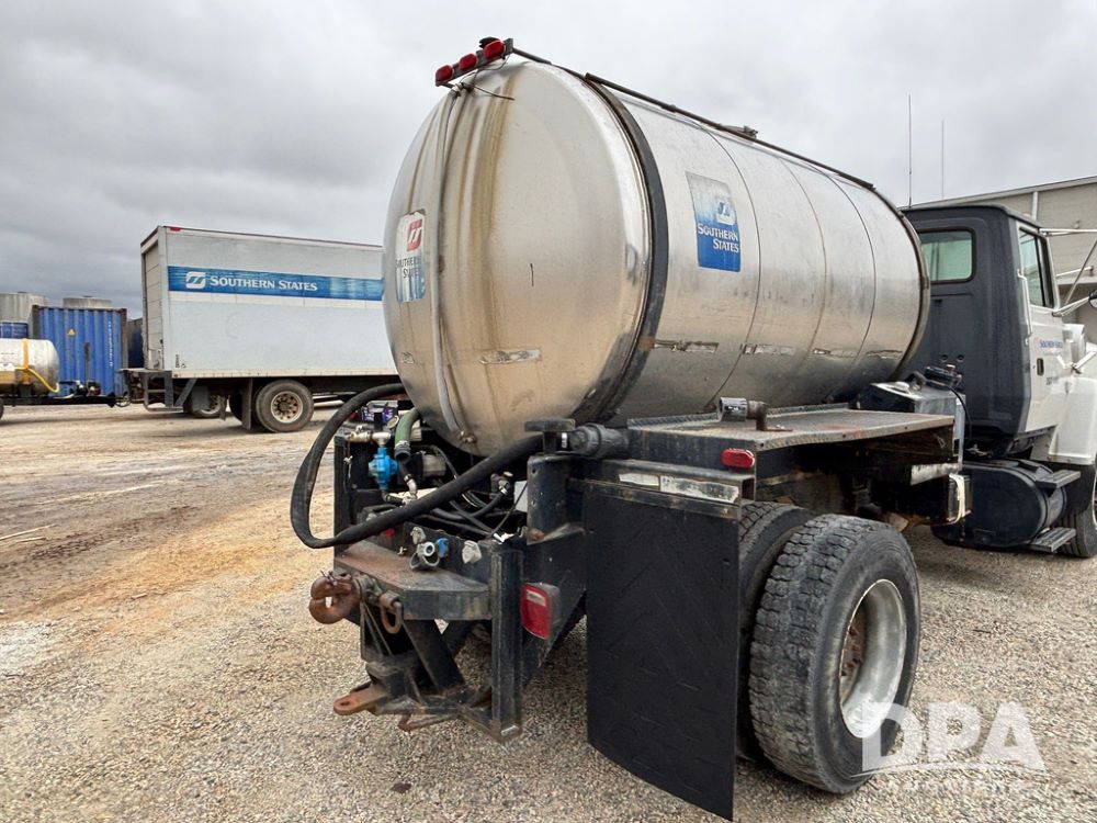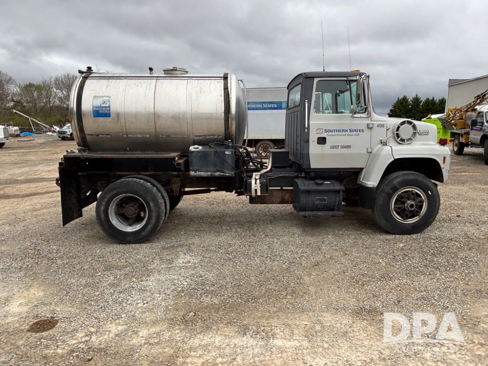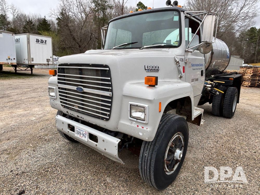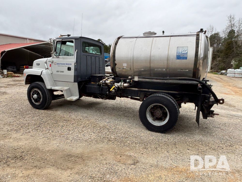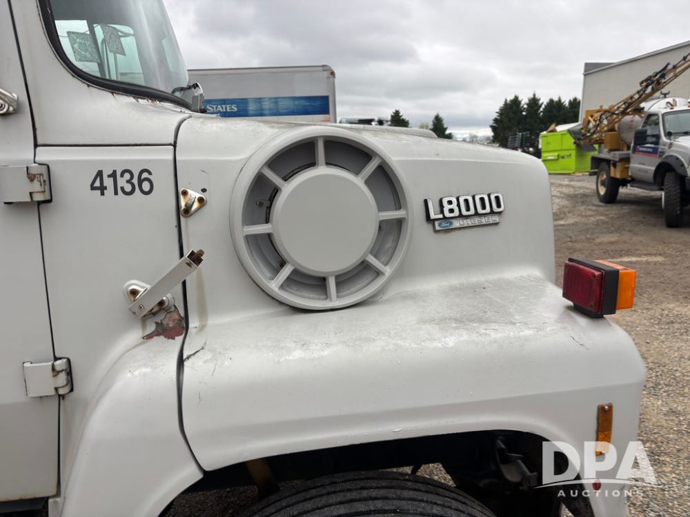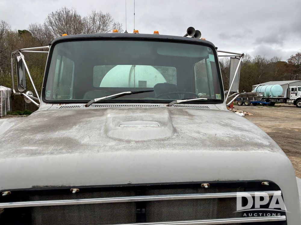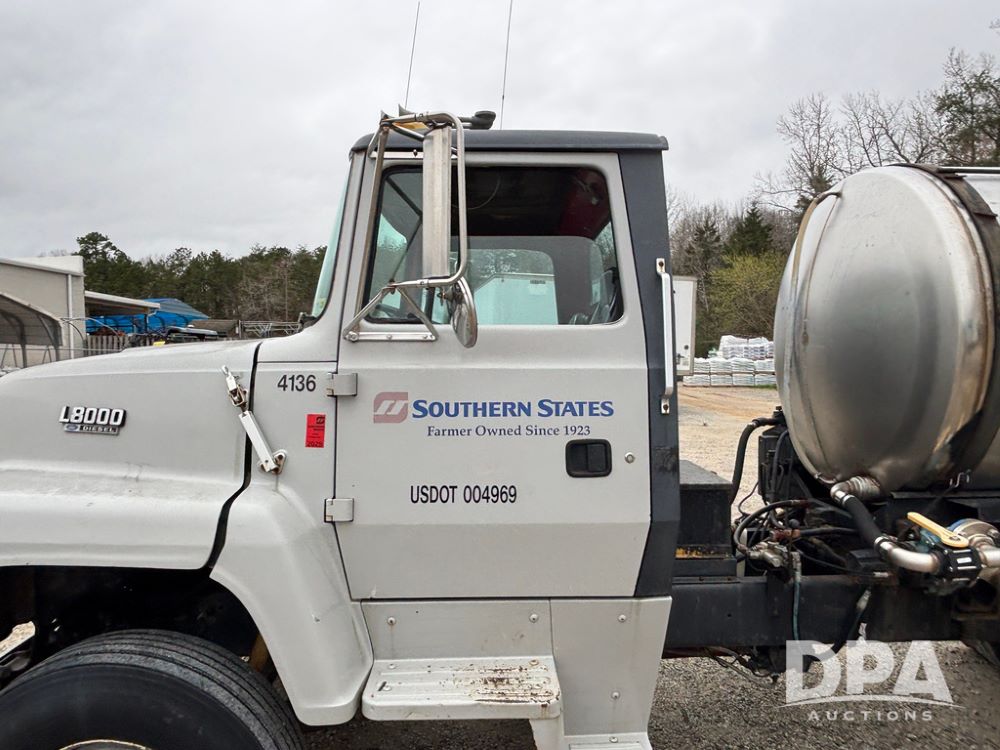 1991 Ford L8000 Liquid Nurse Truck (GP12933, Unit 4136), diesel engine, 5x2 transmission, heat, Am/Fm radio, single axle, spring suspension, approx. 1,000 gallon stainless steel liquid nurse tank, 11R22.5 tires, rear pintle hitch, shows 97,892 miles.