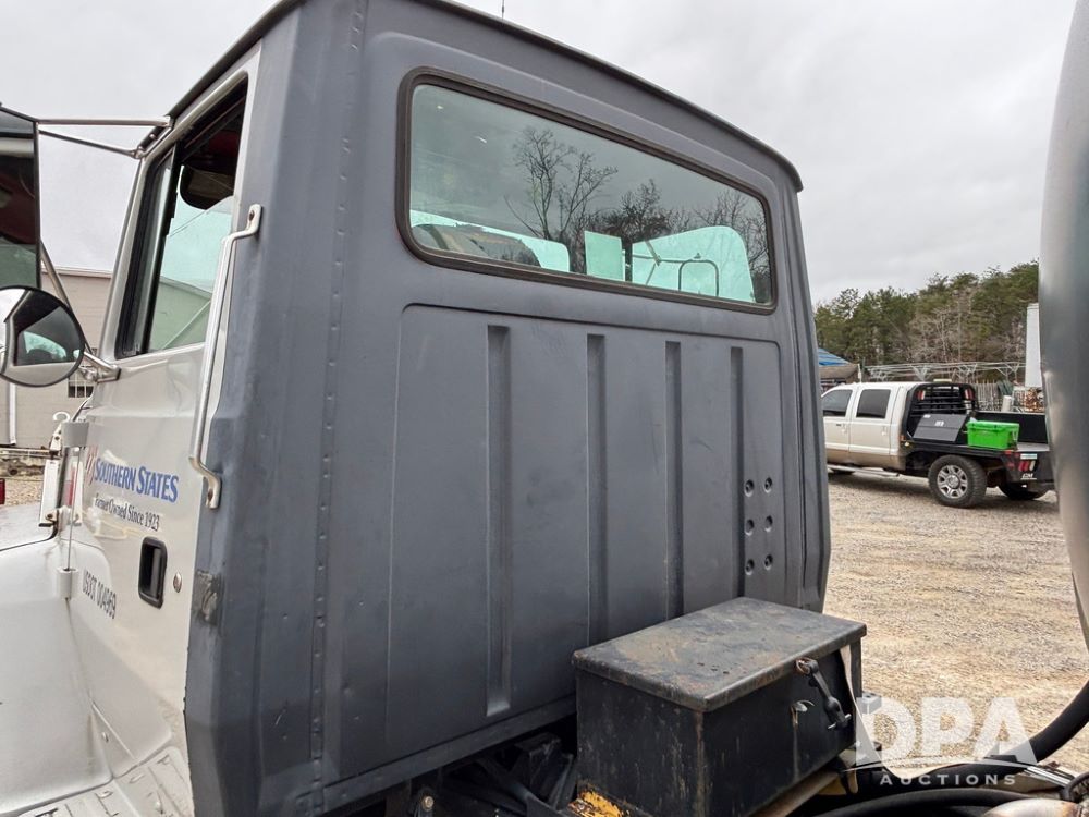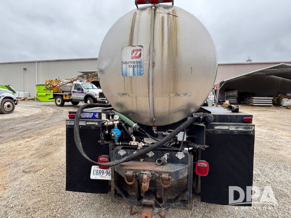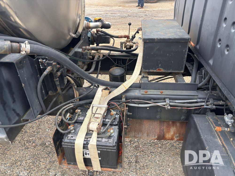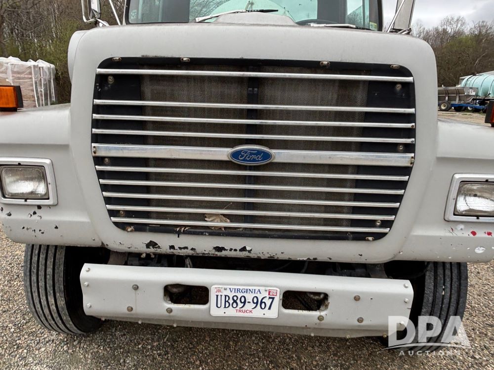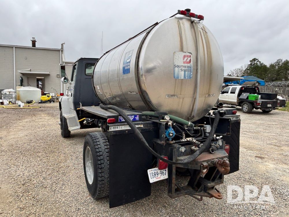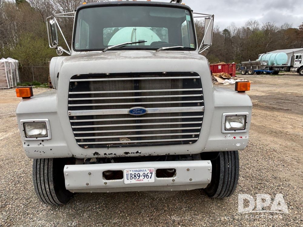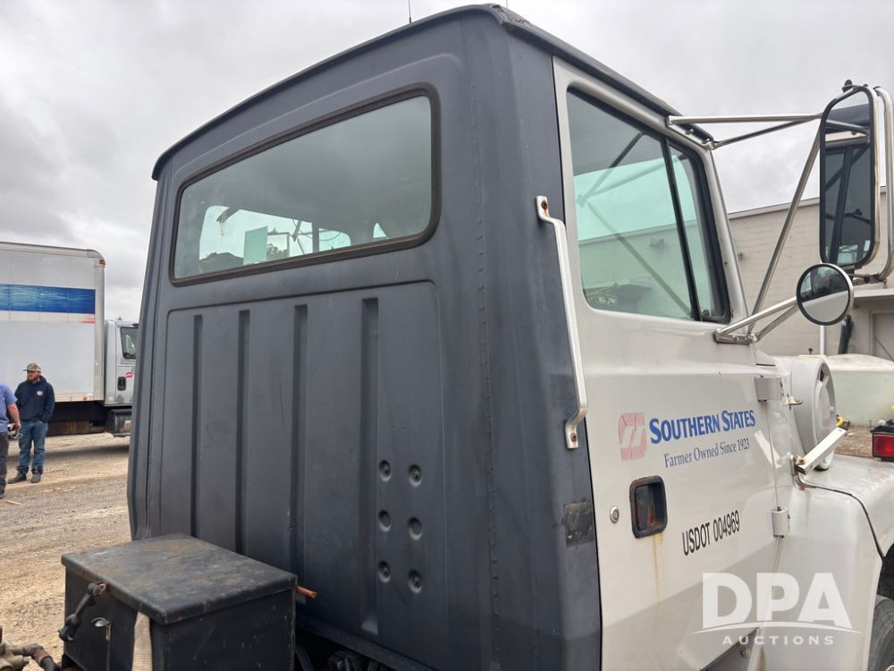1991 Ford L8000 Liquid Nurse Truck (GP12933, Unit 4136), diesel engine, 5x2 transmission, heat, Am/Fm radio, single axle, spring suspension, approx. 1,000 gallon stainless steel liquid nurse tank, 11R22.5 tires, rear pintle hitch, shows 97,892 miles.