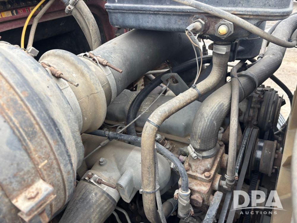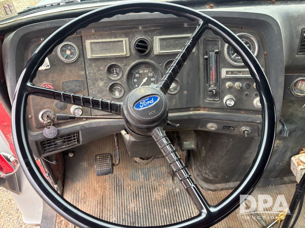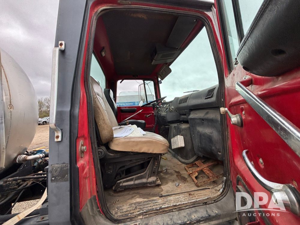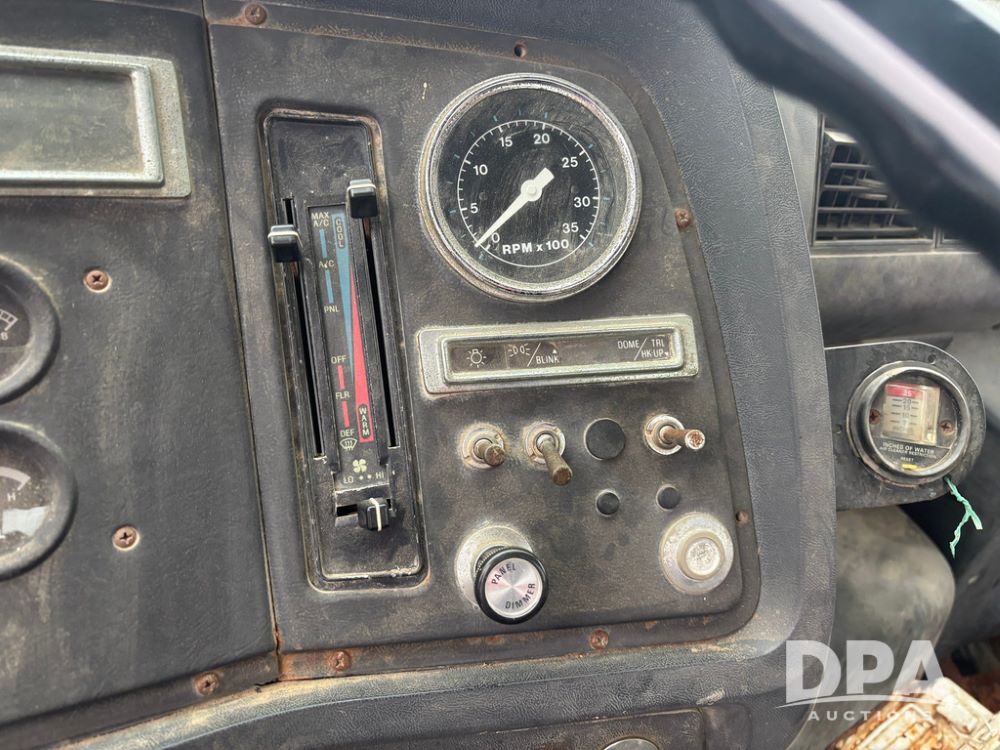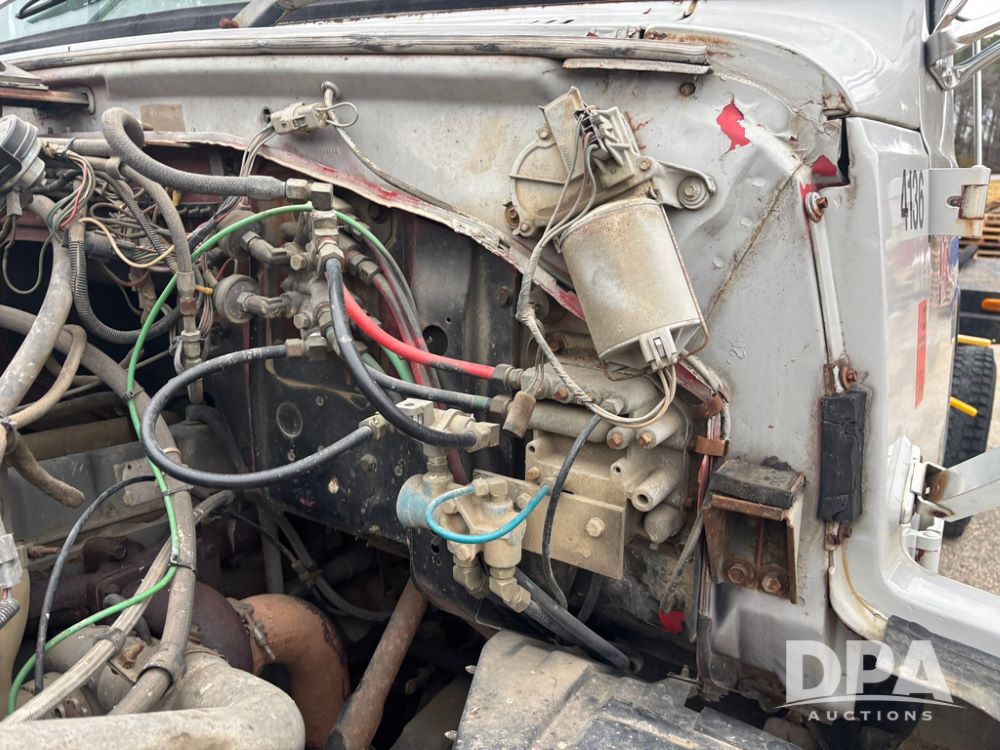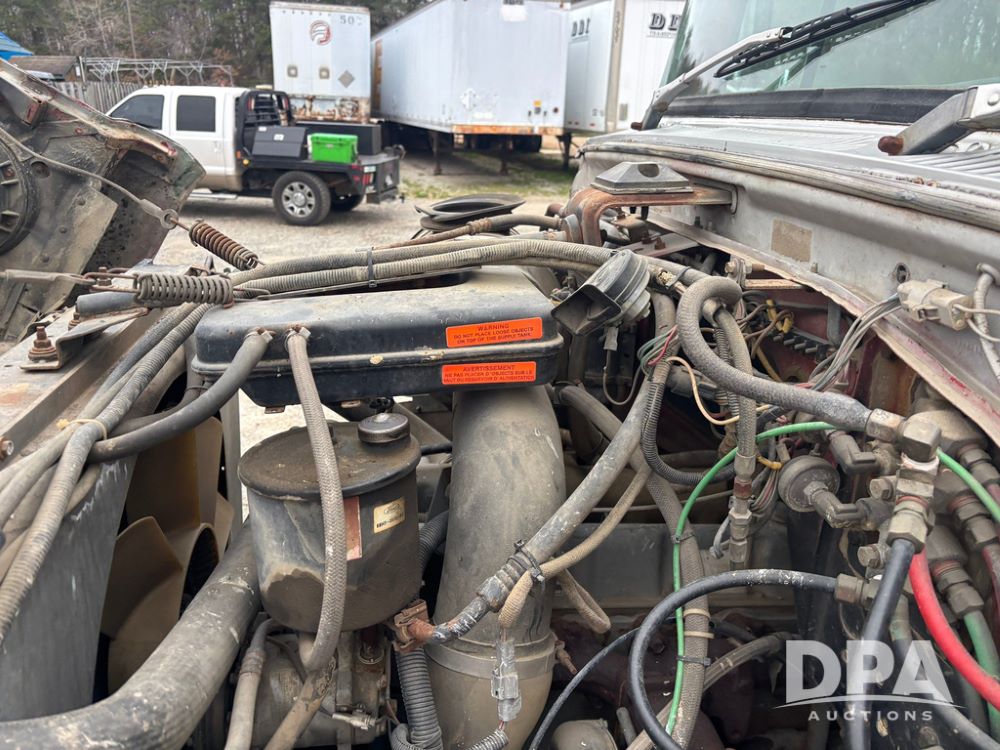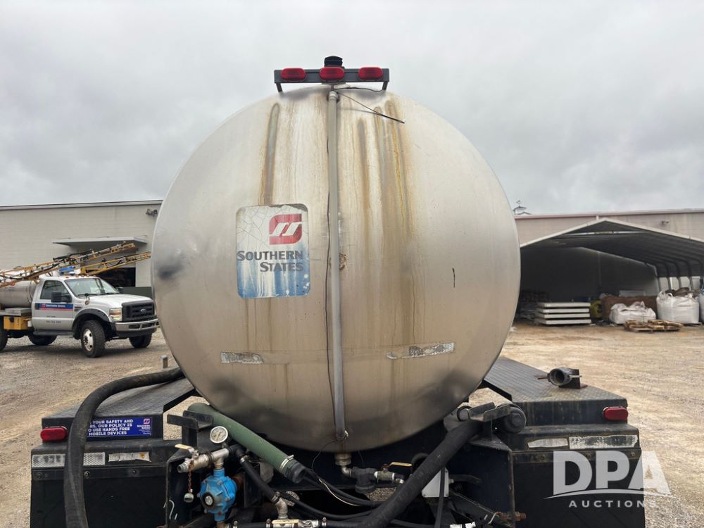 1991 Ford L8000 Liquid Nurse Truck (GP12933, Unit 4136), diesel engine, 5x2 transmission, heat, Am/Fm radio, single axle, spring suspension, approx. 1,000 gallon stainless steel liquid nurse tank, 11R22.5 tires, rear pintle hitch, shows 97,892 miles.