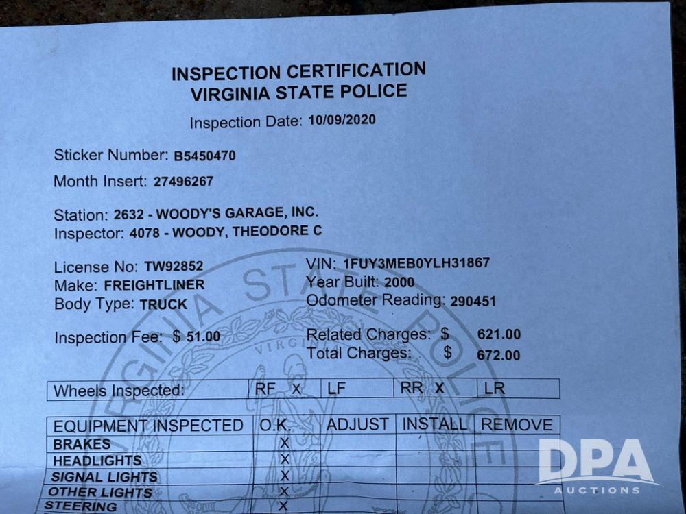 2000 Freightliner Cab ONLY (GP8849, Unit T8247), Cummins ISM diesel engine, Eaton Fuller 10 speed transmission, dual fuel tank, single exhaust, 11R22.5 tires, shows 301,263 miles.