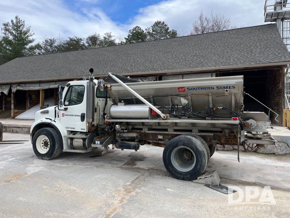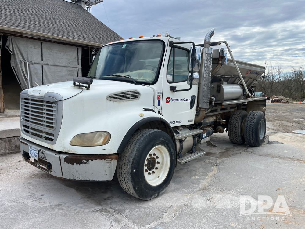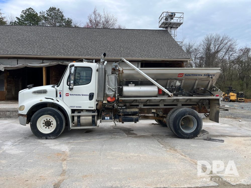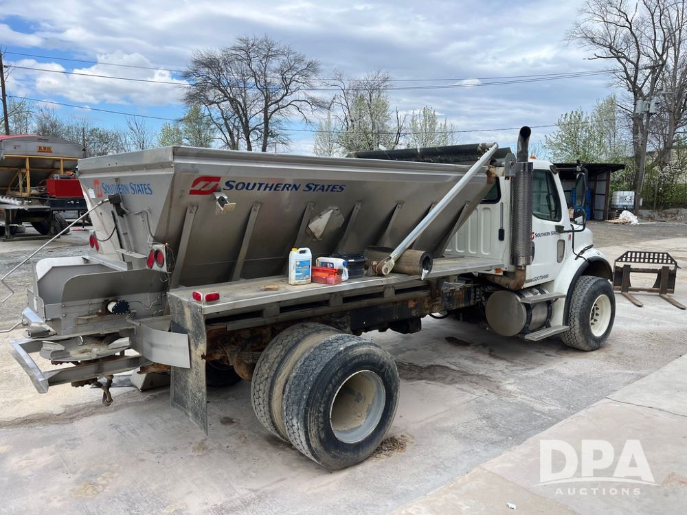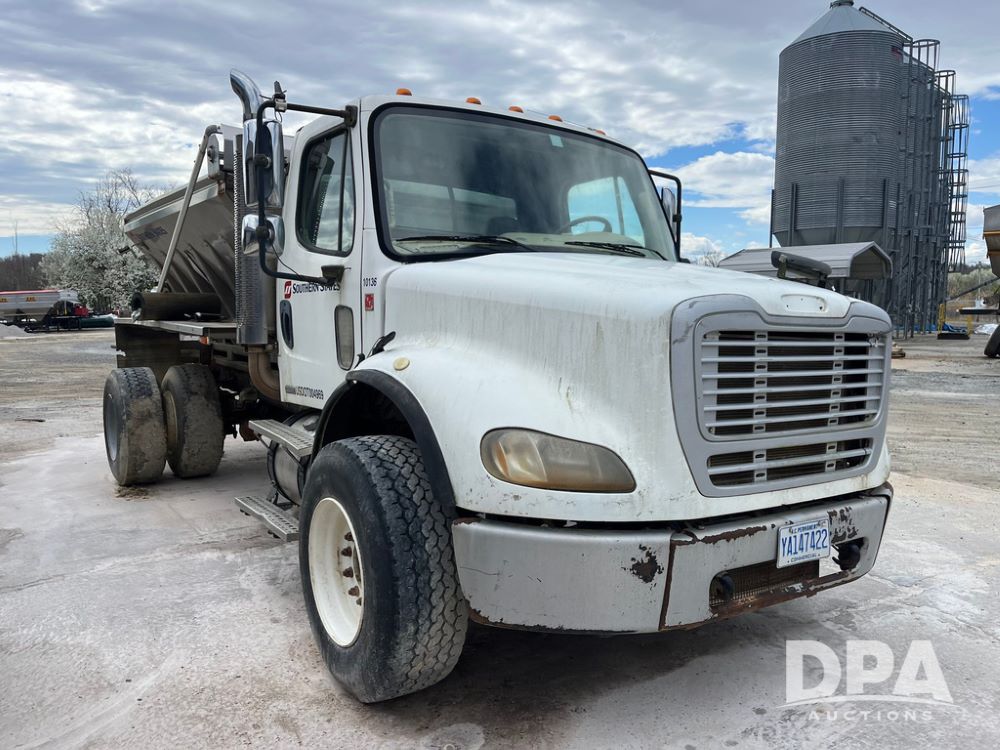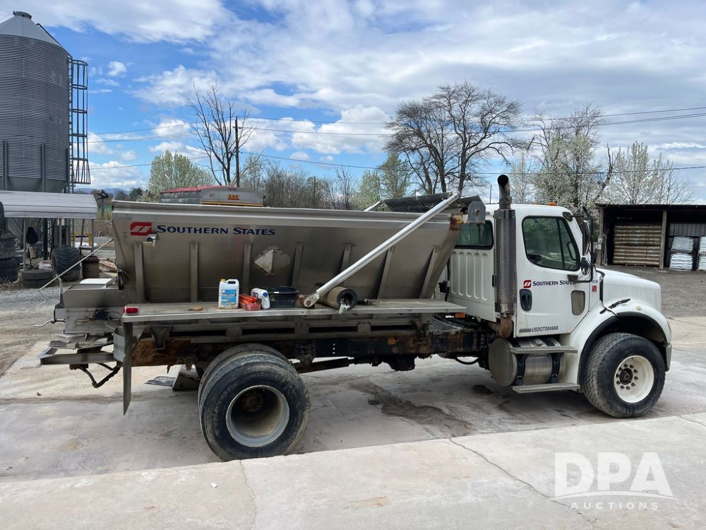 2006 Freightliner Business Class M2 Dry Floater (JN4155, Unit F10136), Cat diesel engine, Allison automatic transmission, heat, Am/Fm radio, single axle, stainless steel dry spreadre box, dual spinners, slatted chain, hydraulic, electric rolling tarp, 385/65R22.5 tires, GVWR 33,000 pounds.