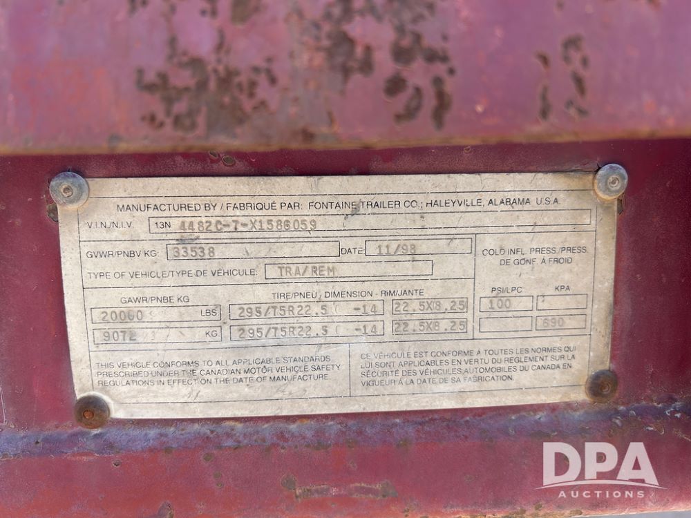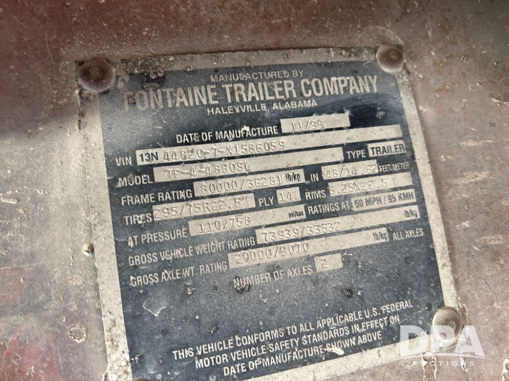 1999 Fontaine Flatbed Trailer (DPA2865, Unit 2485134), 48ft., sliding tandem axle, spring ride suspension, tandem axle, ratchet straps, tires- 11R22.5.