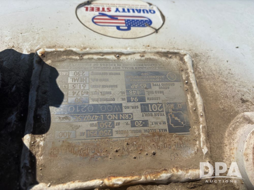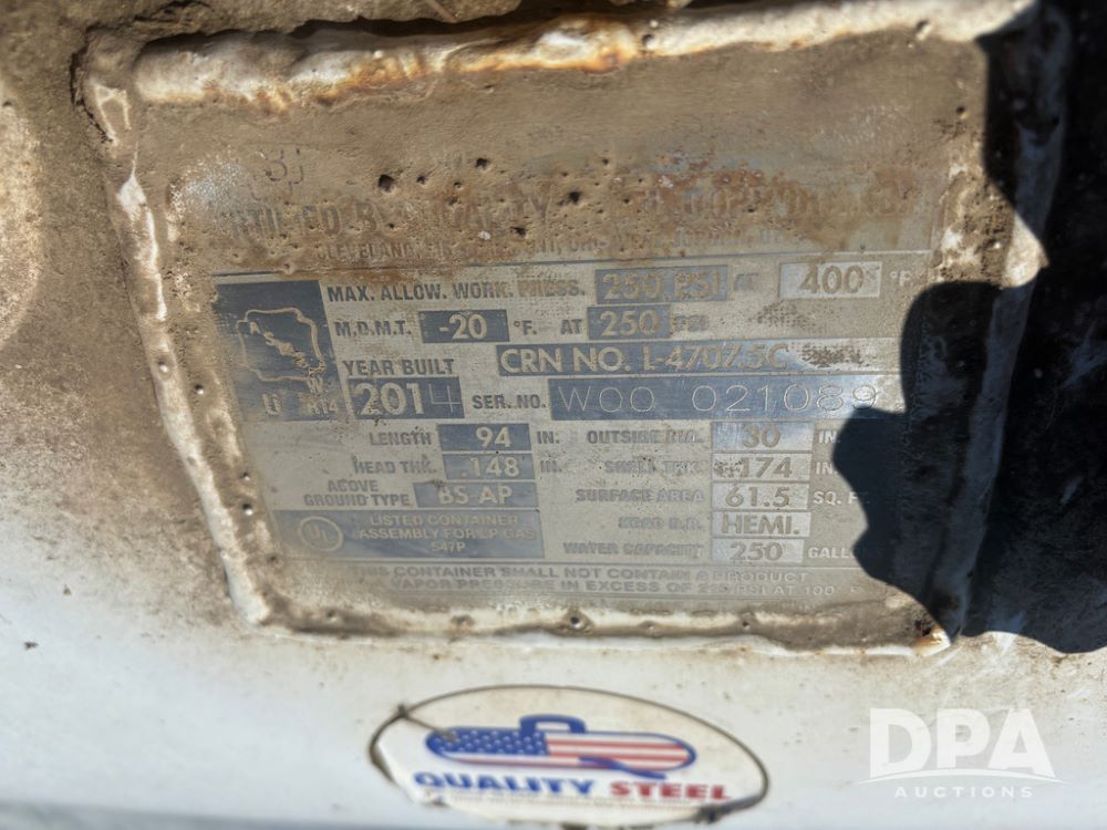 2014 Quality Steel LP Tank (DR13473), 250 gallon LP storage tank w/good data tag.