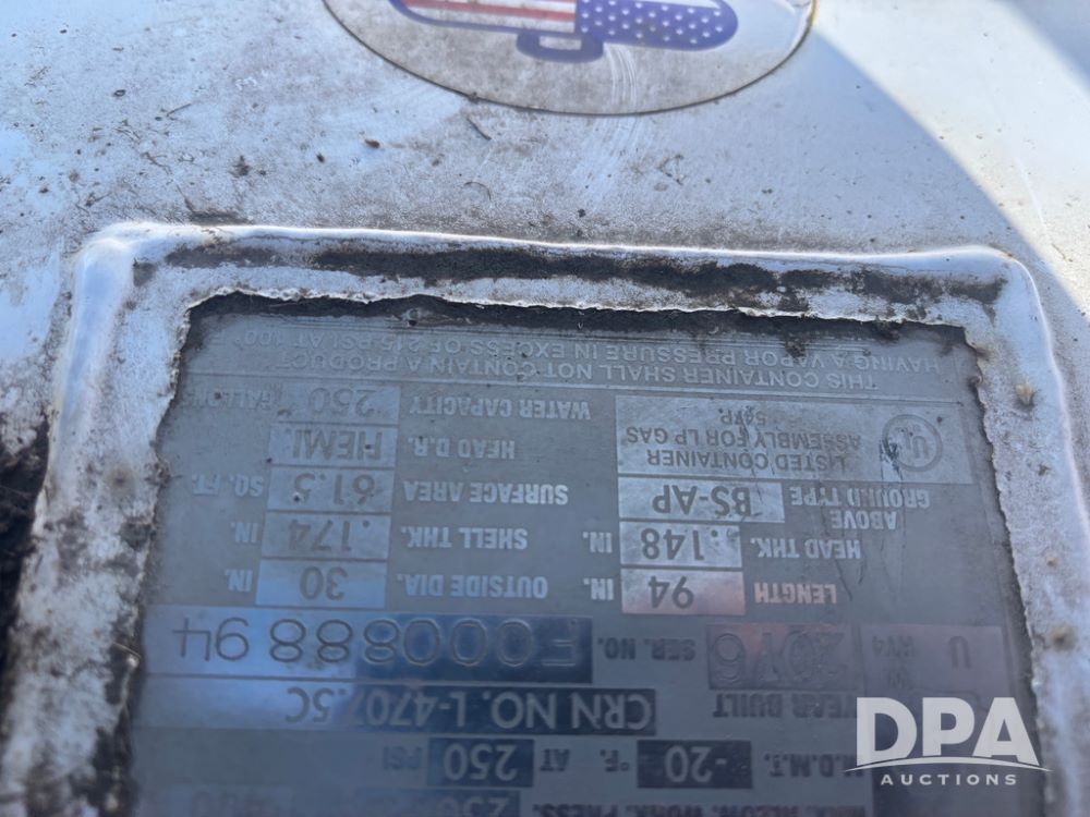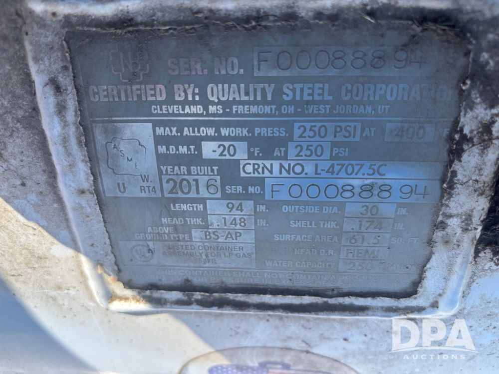 2016 Quality Steel LP Tank (DR13475), 250 gallon LP storage tank w/good data tag.
