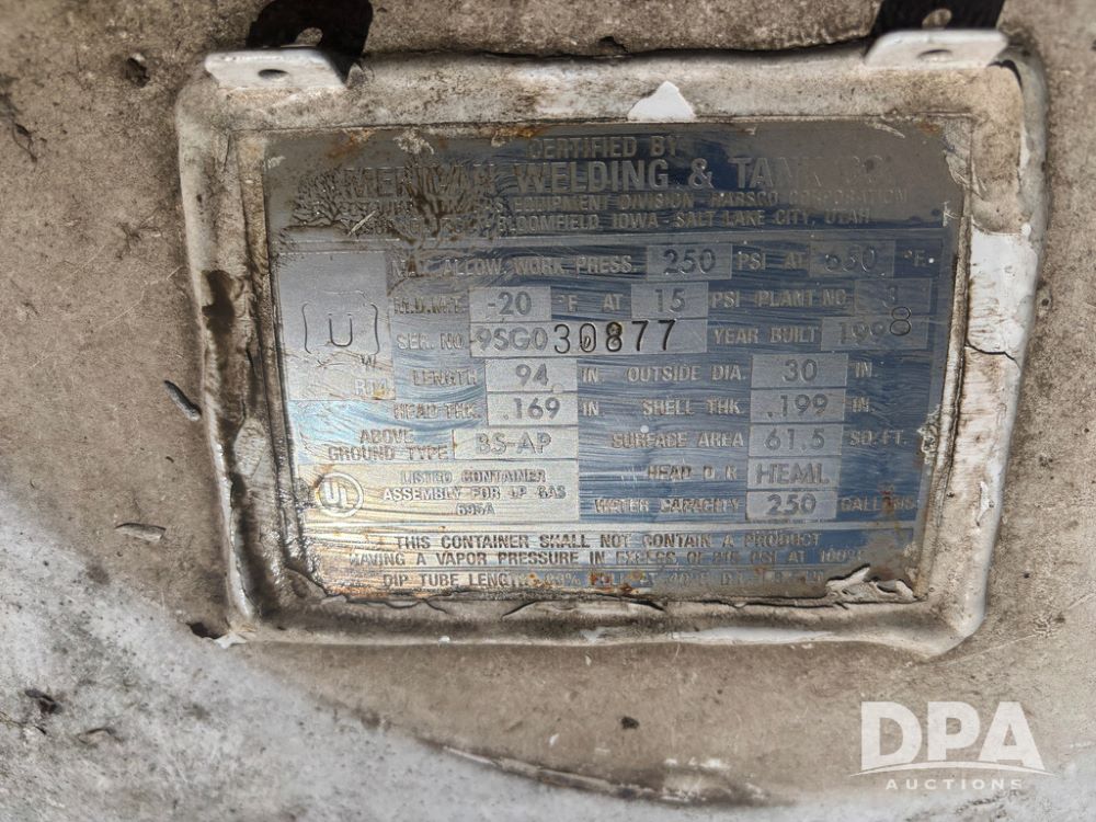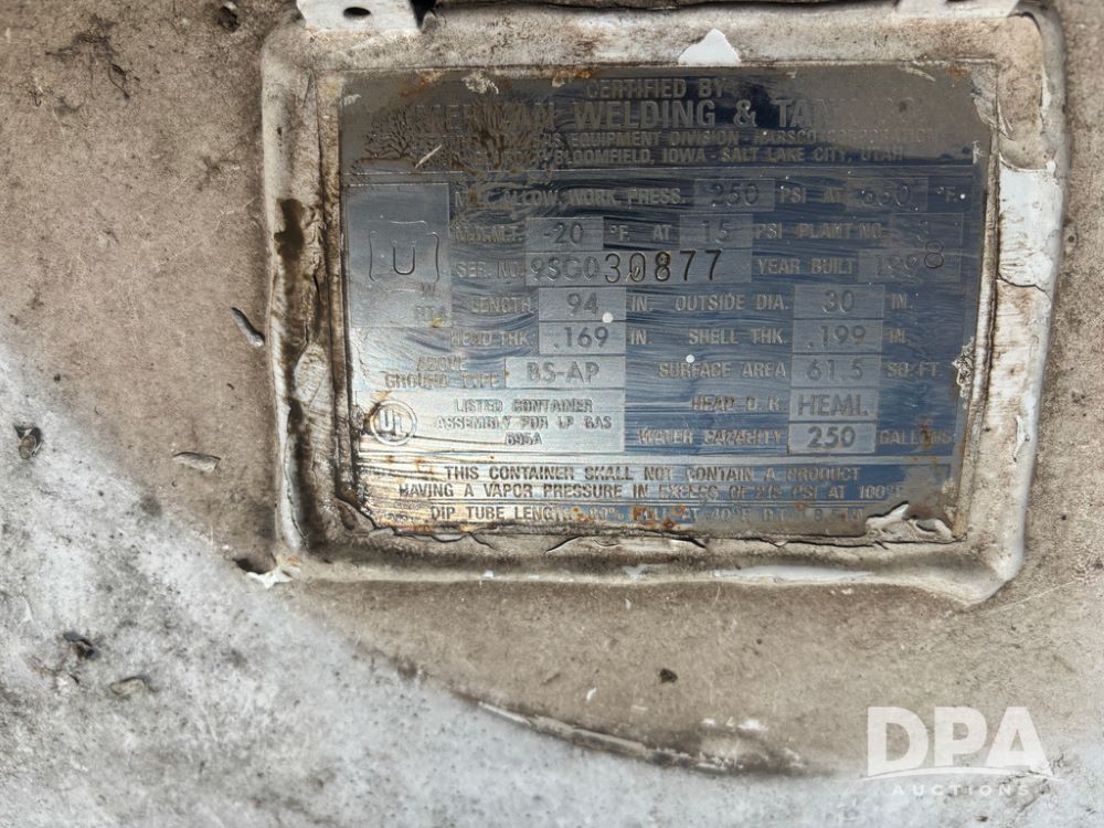 1998 American Welding LP Tank (DR13476), 250 gallon LP storage tank w/good data tag.