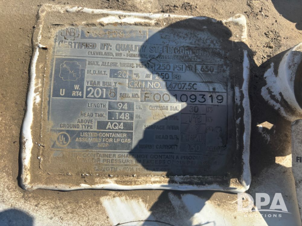 2016 Quality Steel LP Tank (DR13477), 250 gallon LP storage tank w/good data tag.