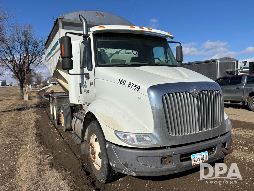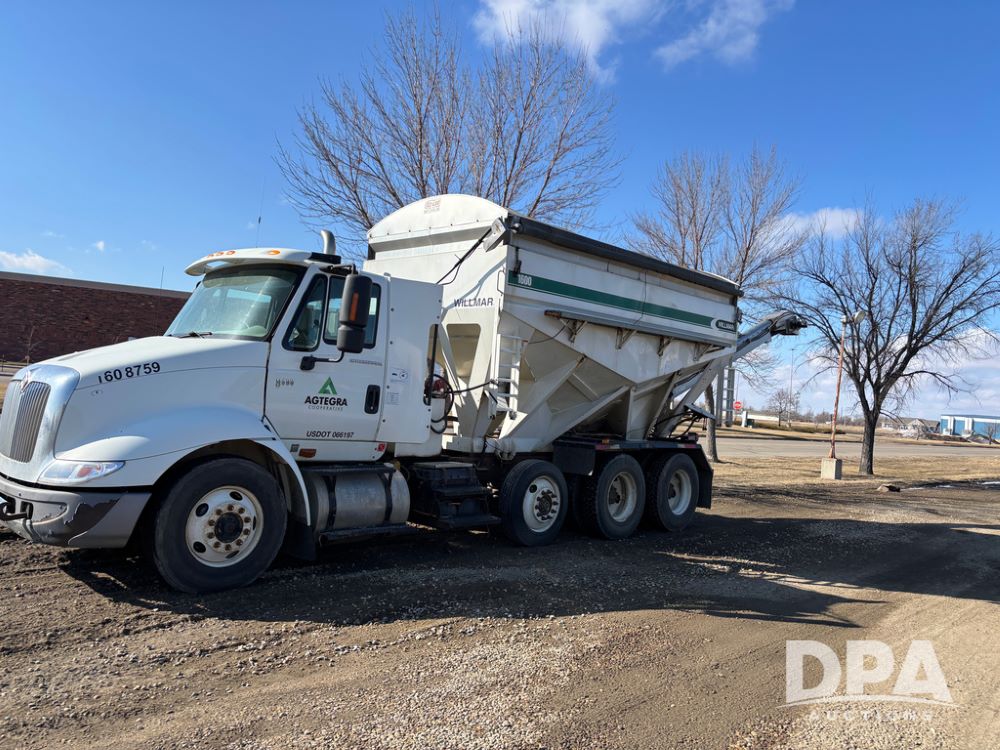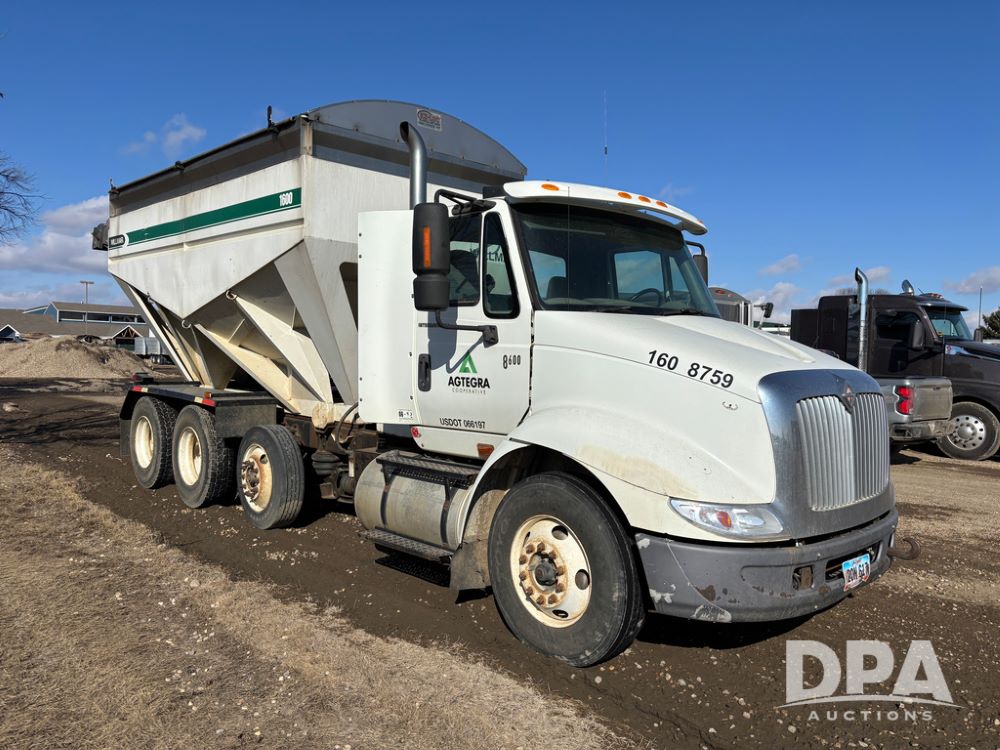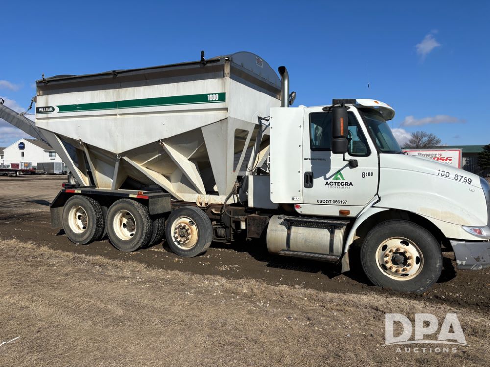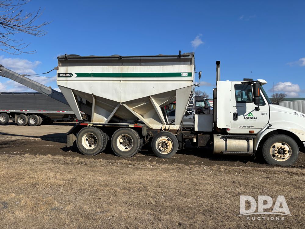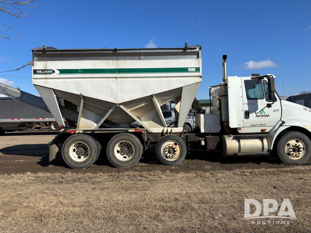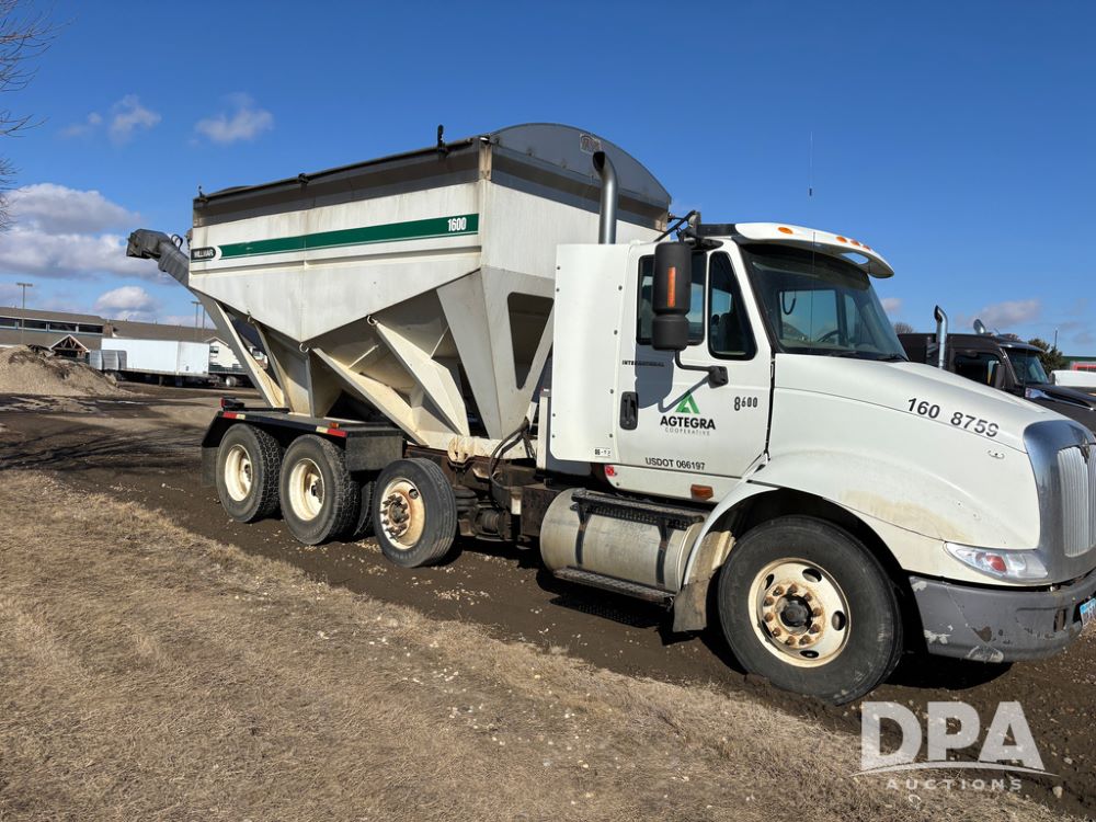 2007 International 8600 Dry Truck (DR13495 Unit 8759), diesel engine, 10 speed transmission, tandem axle full screw, air lift tag axle, air ride suspension, Willmar 1600 stainless steel hydraulic dry tender box, rear discharge auger, side catwalk, electric roll tarp, auxiliary off rod diesel fuel tank w/12 volt pump, dual aluminum fuel tanks, AM/FM CD radio, engine brake, heated mirrors, 22.5 tires, odometer reads 548,664 miles.