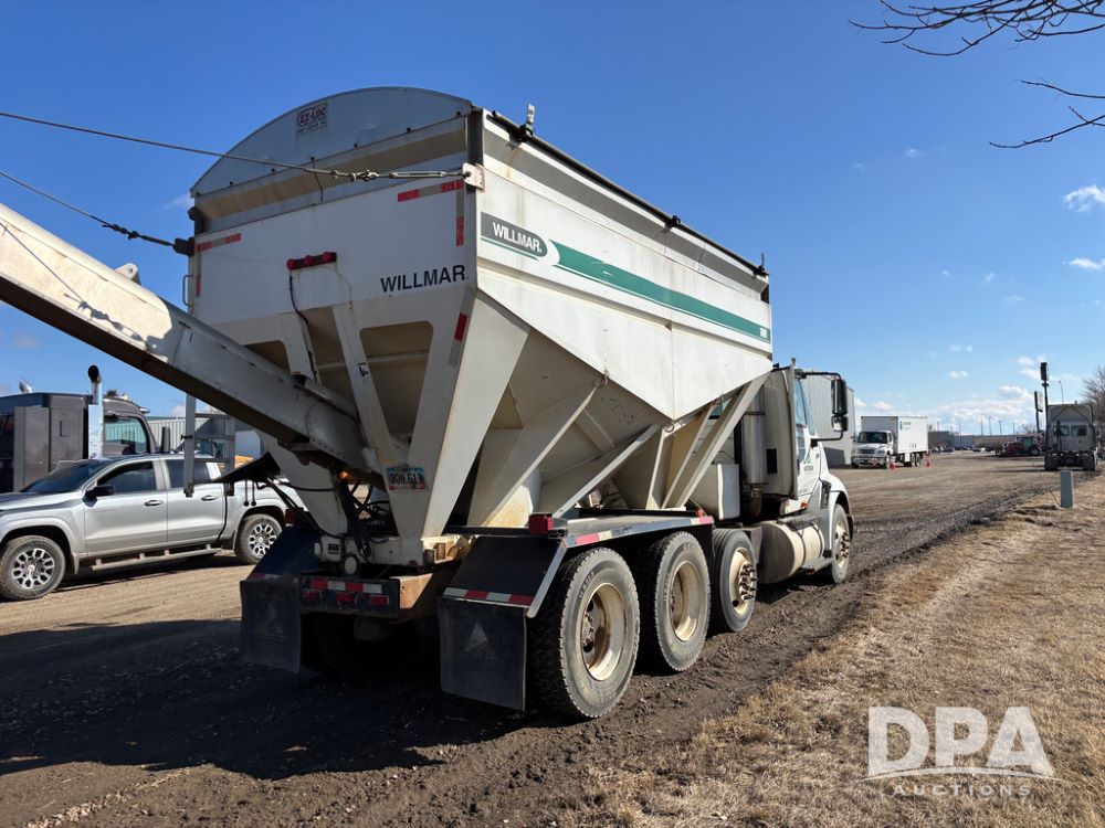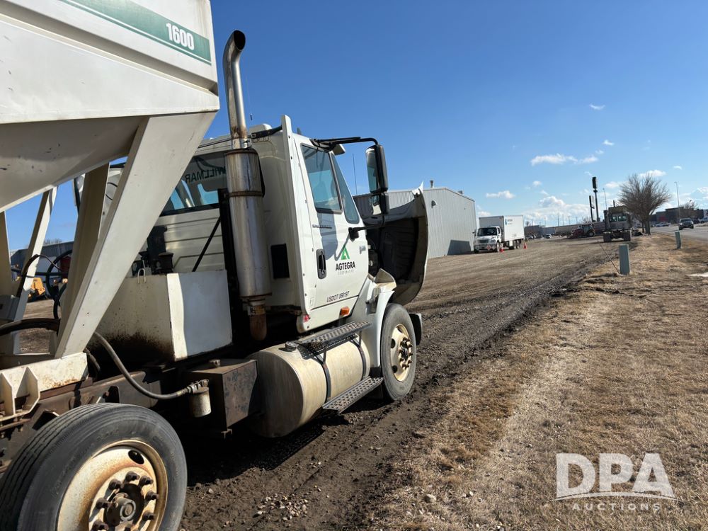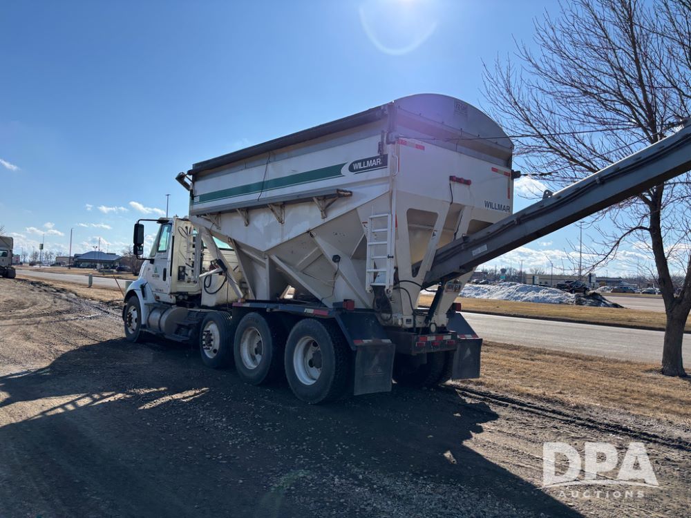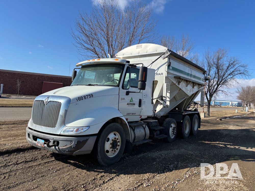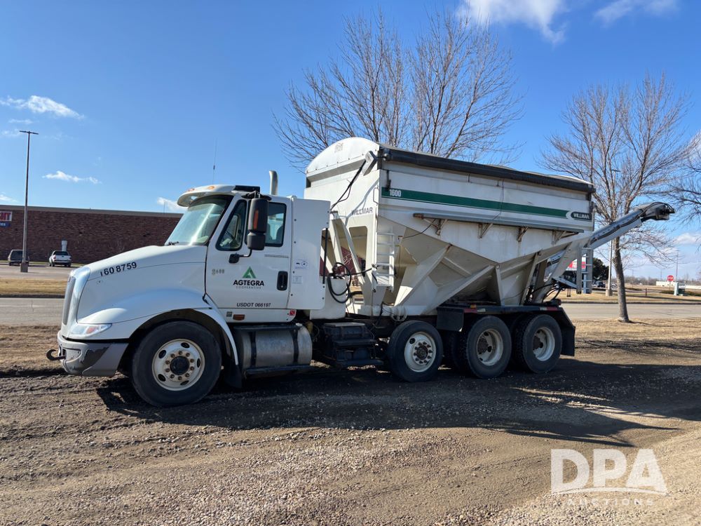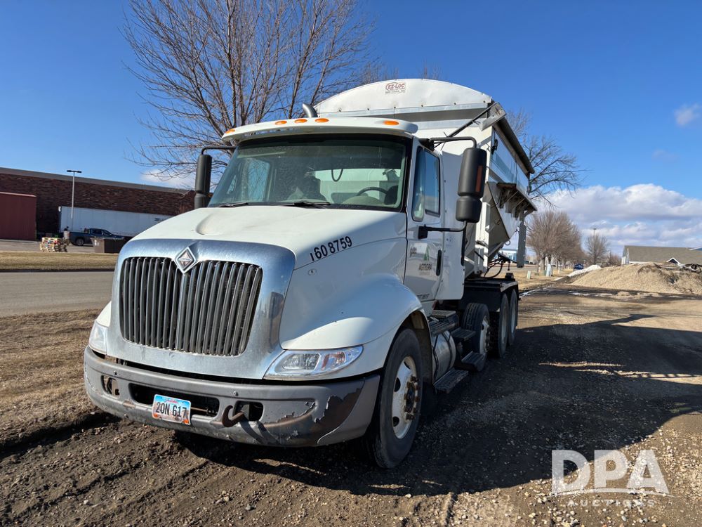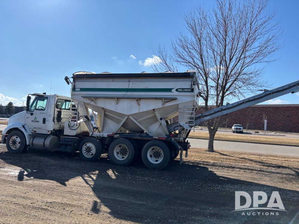 2007 International 8600 Dry Truck (DR13495 Unit 8759), diesel engine, 10 speed transmission, tandem axle full screw, air lift tag axle, air ride suspension, Willmar 1600 stainless steel hydraulic dry tender box, rear discharge auger, side catwalk, electric roll tarp, auxiliary off rod diesel fuel tank w/12 volt pump, dual aluminum fuel tanks, AM/FM CD radio, engine brake, heated mirrors, 22.5 tires, odometer reads 548,664 miles.