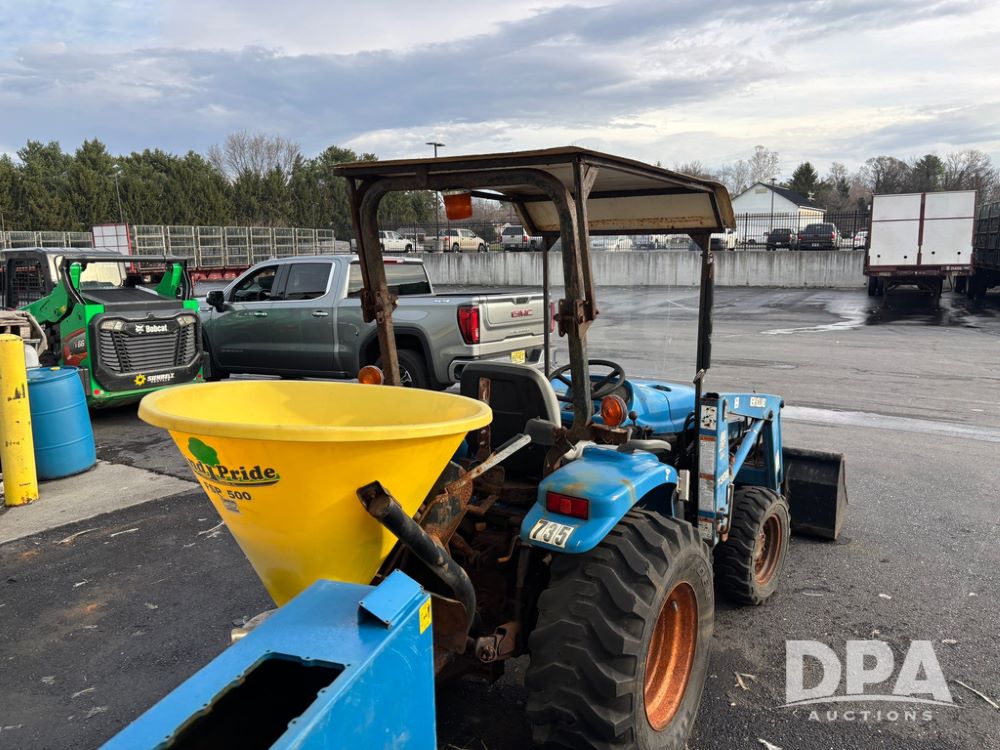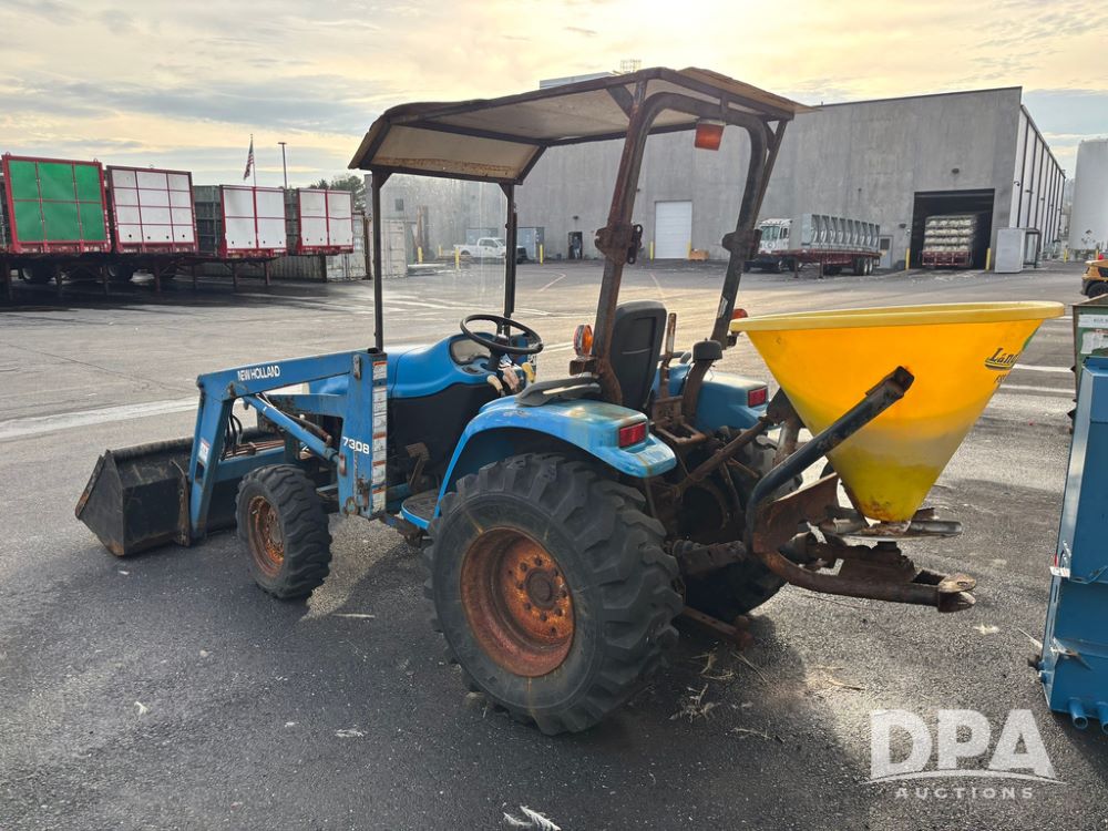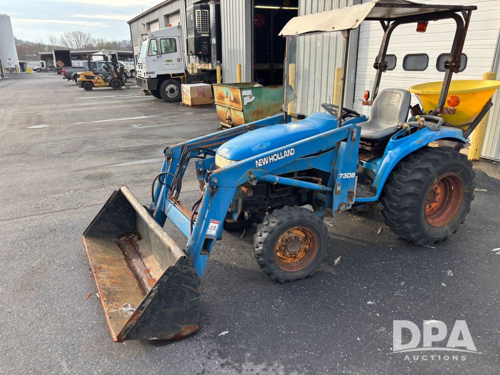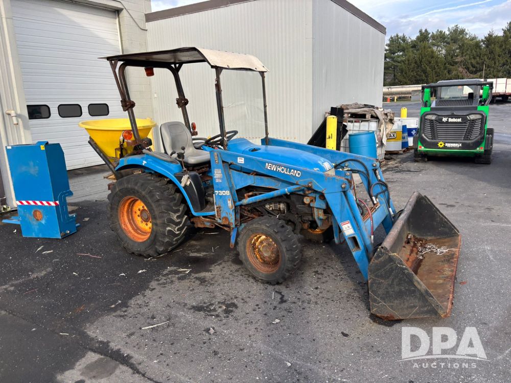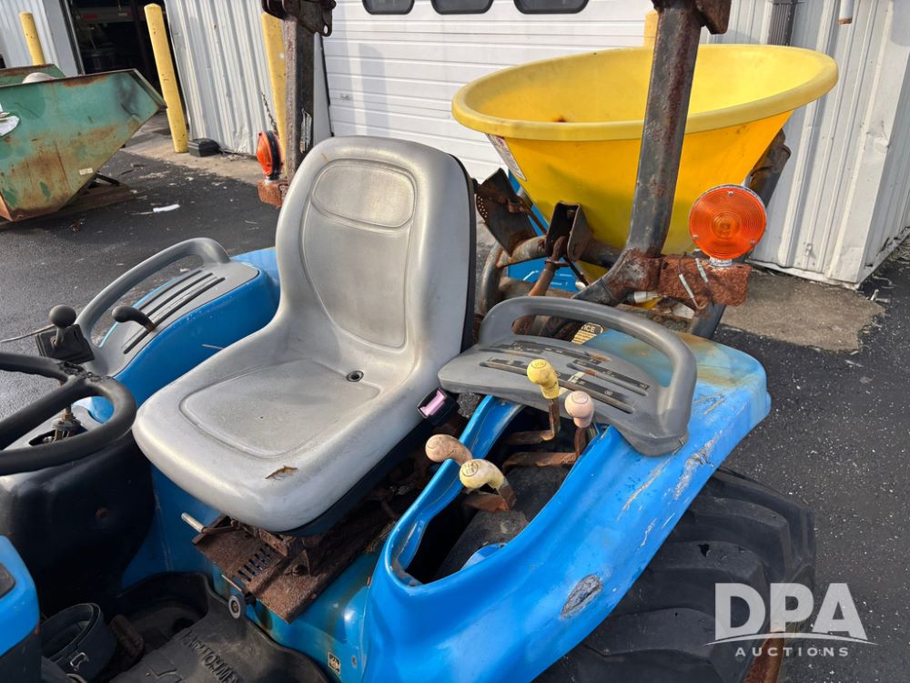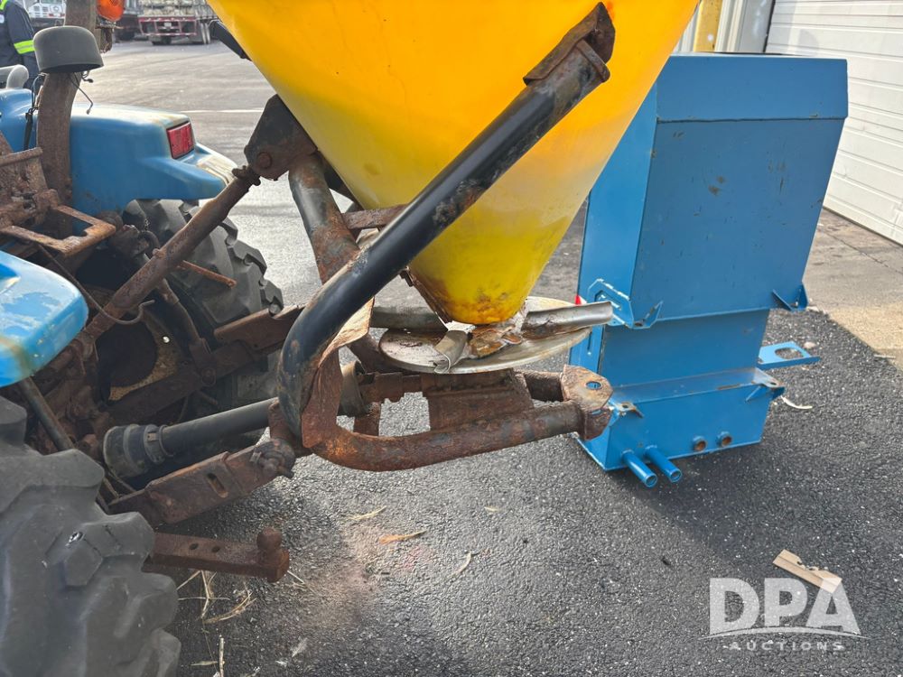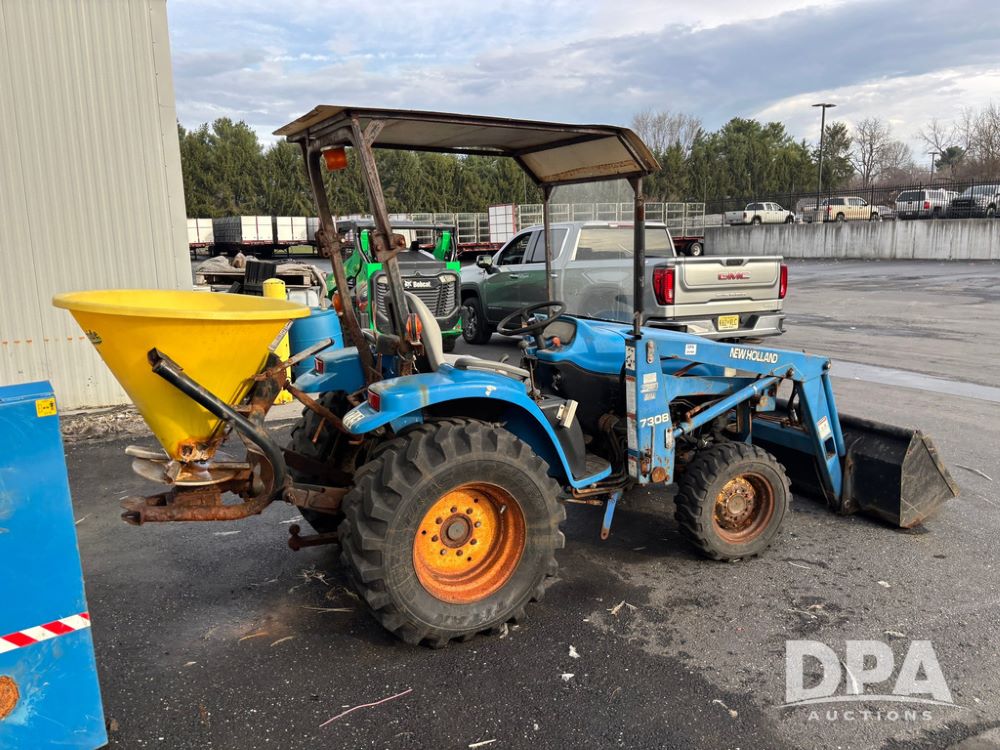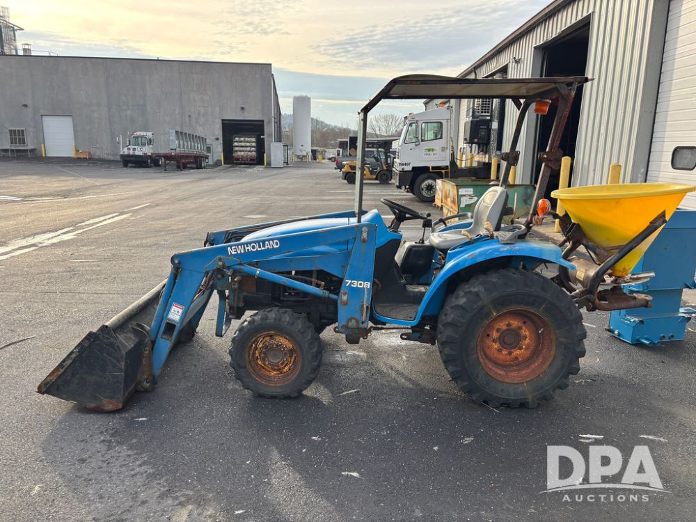 New Holland Tractor (GP12909), NON RUNNER, MFWD tractor, diesel engine, New Holland 7308 hydraulic front loader, front smooth bucket, joy stick controls, Land Pride FSP 500 3 point rear mounted salt spreader, rear PTO, 215/65-14 front tires, 15X19.5 rear tires, shows 3,084 hours.