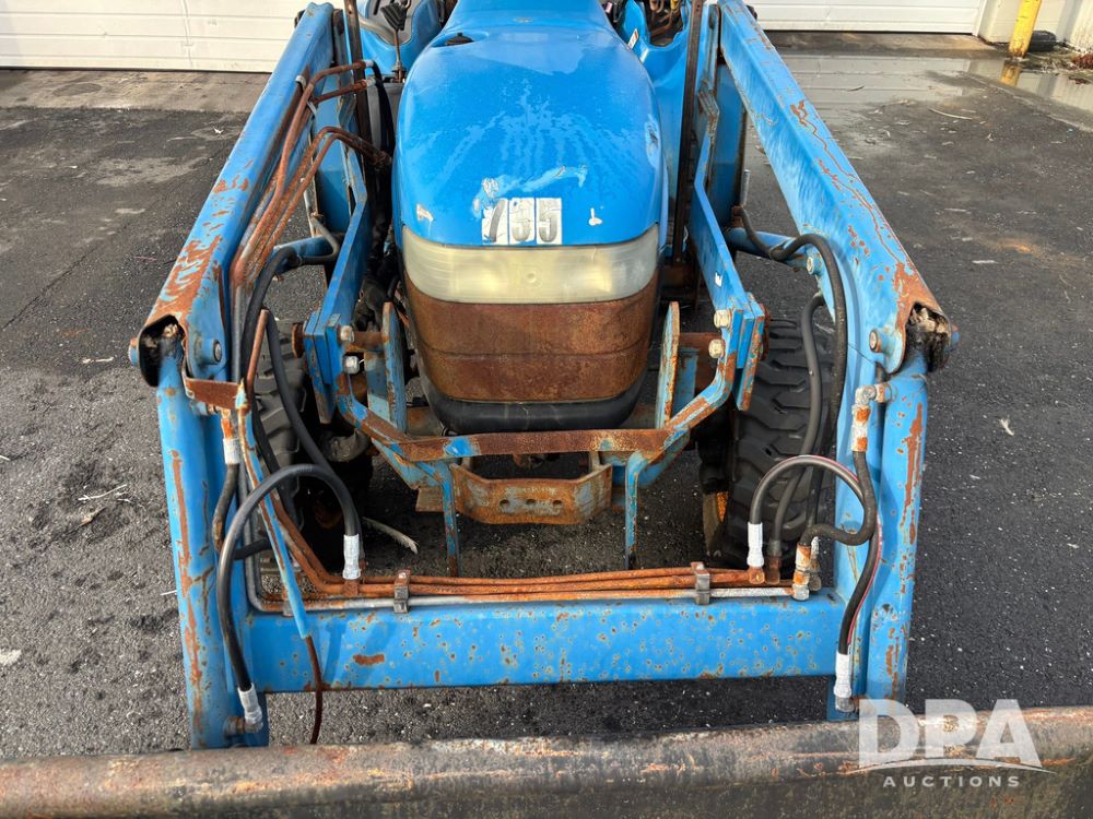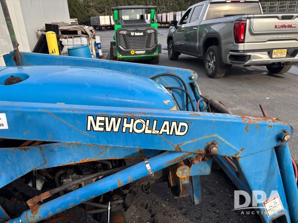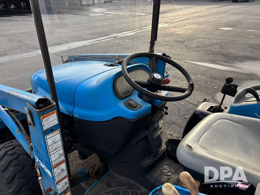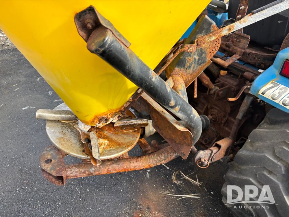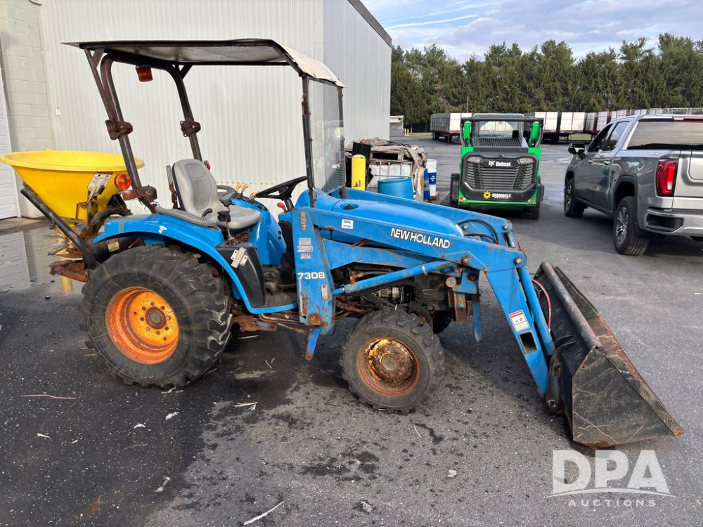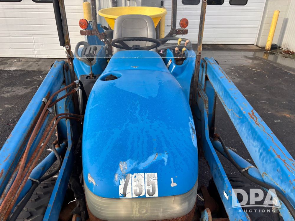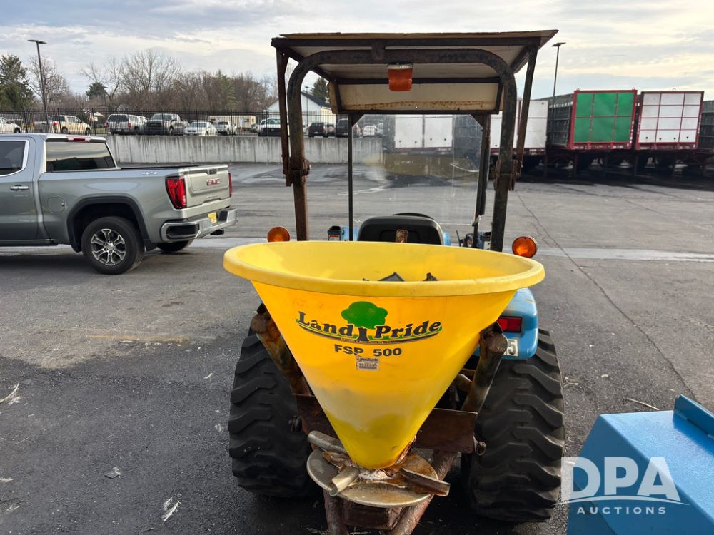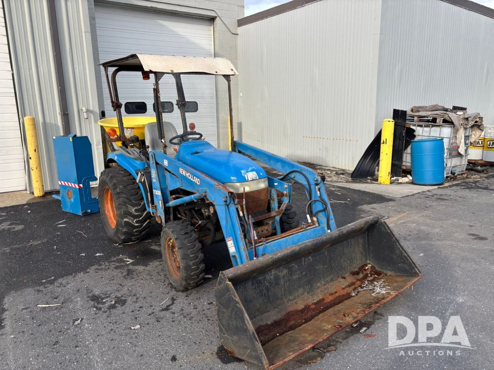New Holland Tractor (GP12909), NON RUNNER, MFWD tractor, diesel engine, New Holland 7308 hydraulic front loader, front smooth bucket, joy stick controls, Land Pride FSP 500 3 point rear mounted salt spreader, rear PTO, 215/65-14 front tires, 15X19.5 rear tires, shows 3,084 hours.