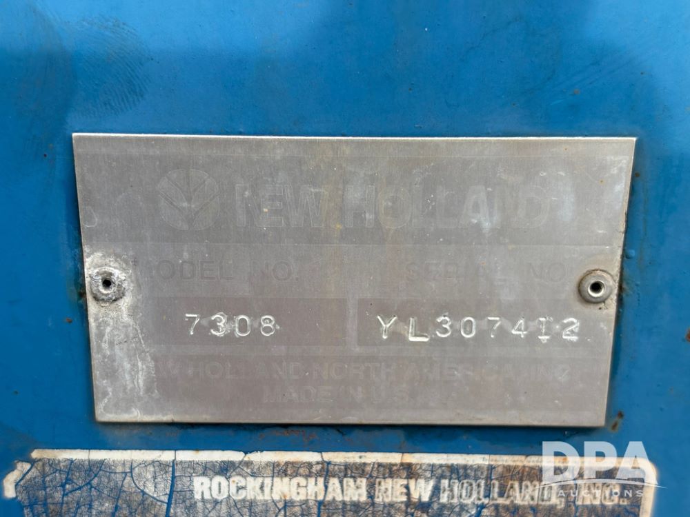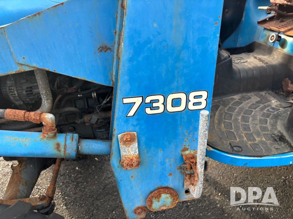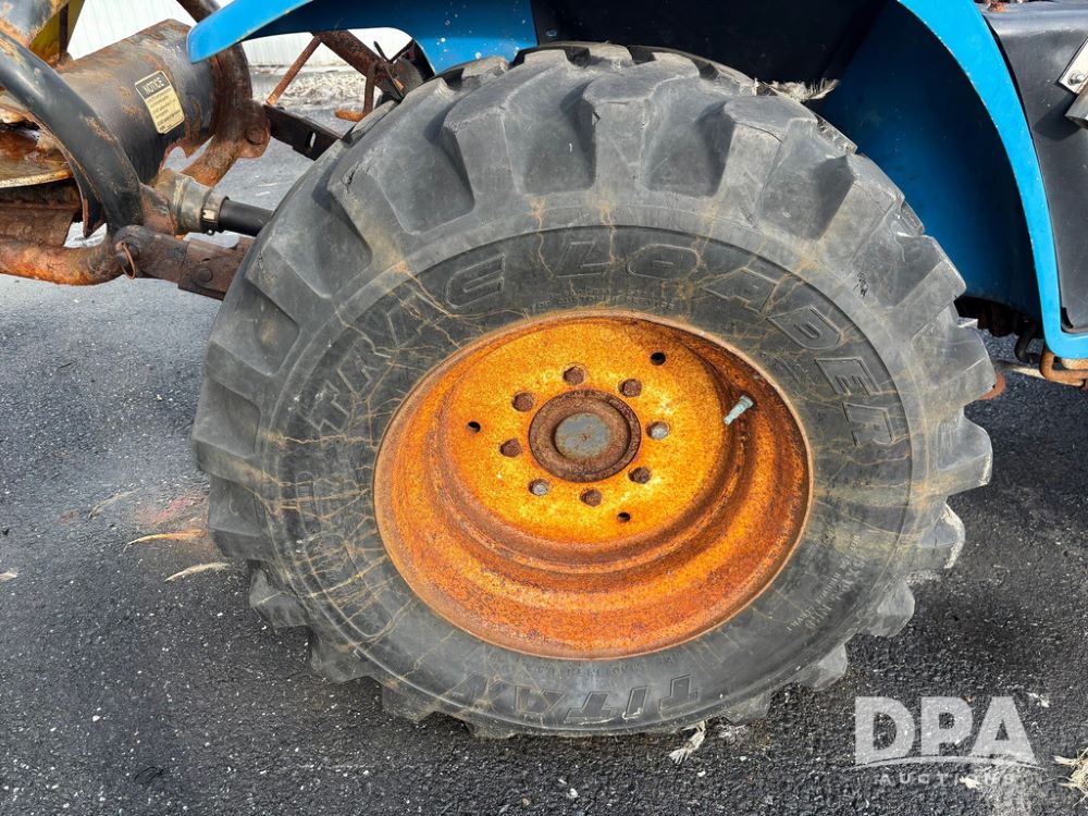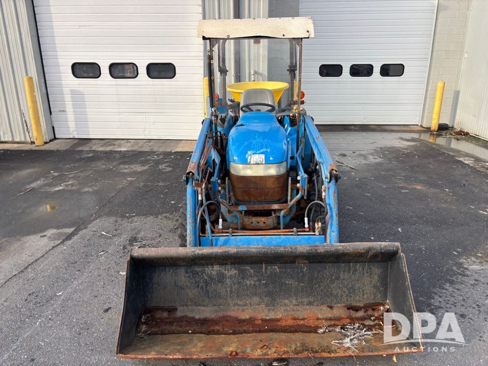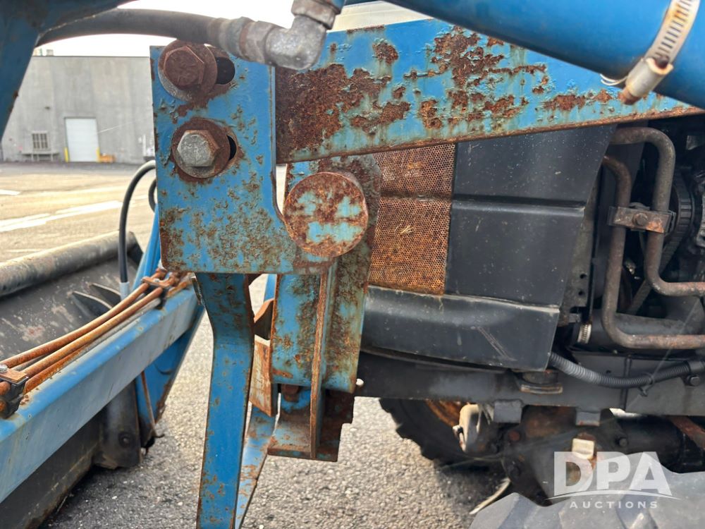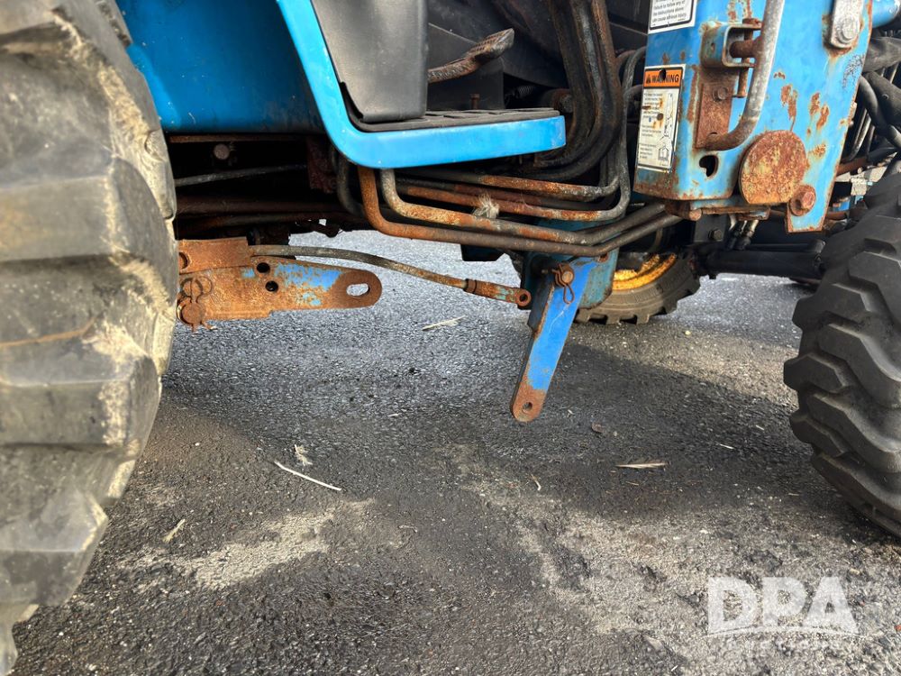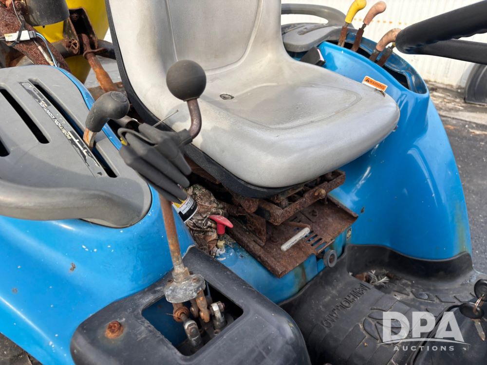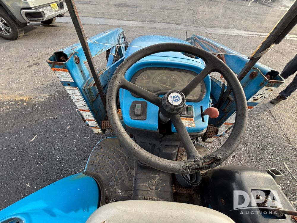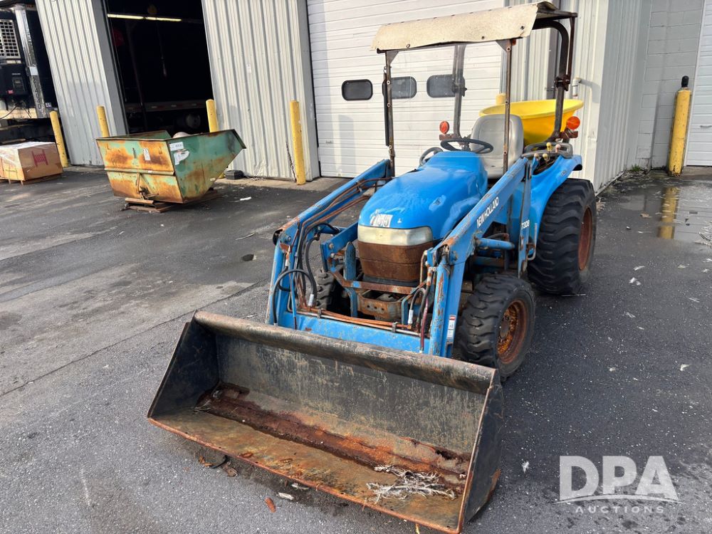 New Holland Tractor (GP12909), NON RUNNER, MFWD tractor, diesel engine, New Holland 7308 hydraulic front loader, front smooth bucket, joy stick controls, Land Pride FSP 500 3 point rear mounted salt spreader, rear PTO, 215/65-14 front tires, 15X19.5 rear tires, shows 3,084 hours.