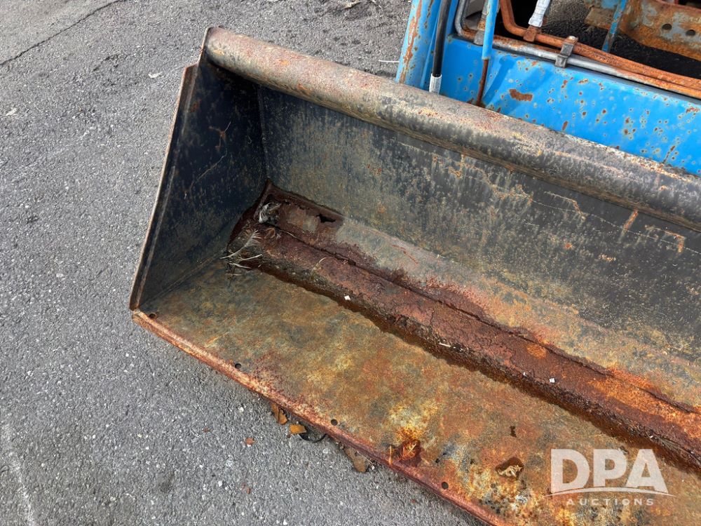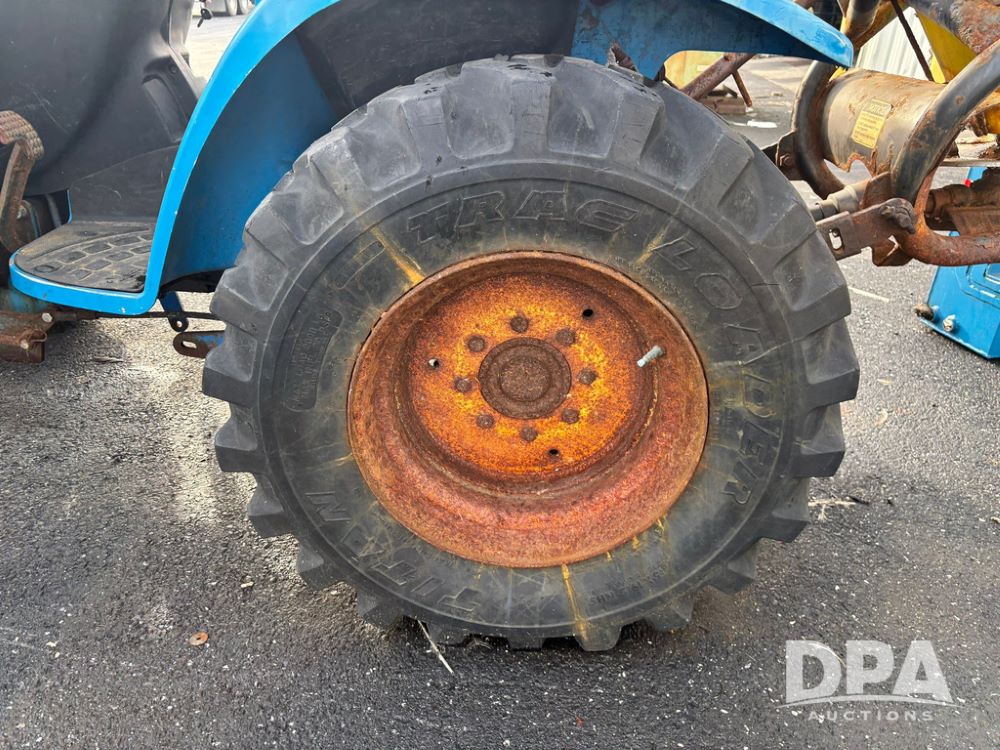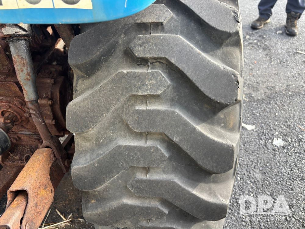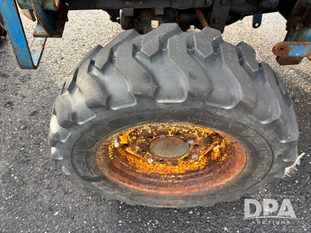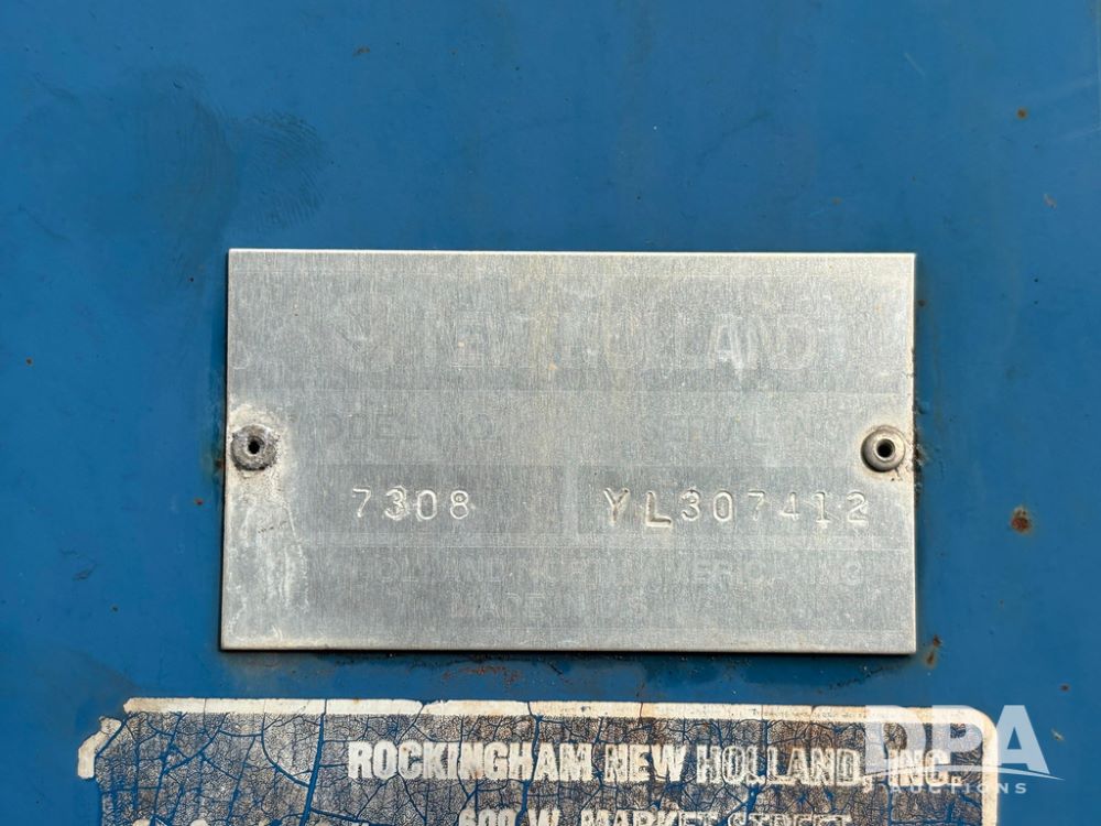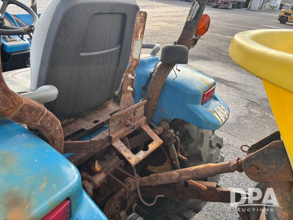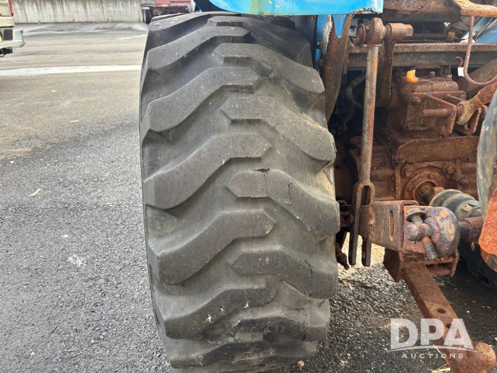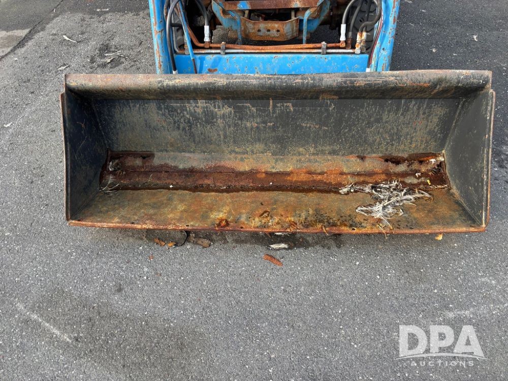 New Holland Tractor (GP12909), NON RUNNER, MFWD tractor, diesel engine, New Holland 7308 hydraulic front loader, front smooth bucket, joy stick controls, Land Pride FSP 500 3 point rear mounted salt spreader, rear PTO, 215/65-14 front tires, 15X19.5 rear tires, shows 3,084 hours.
