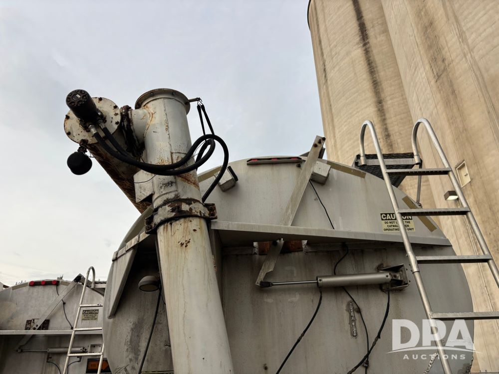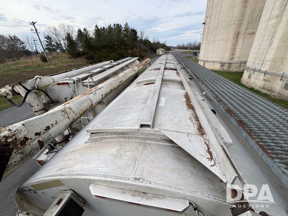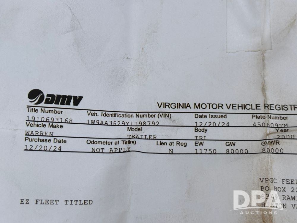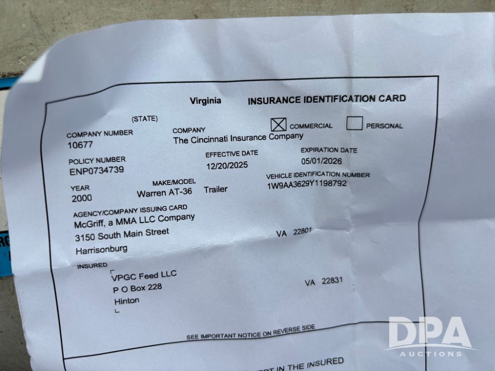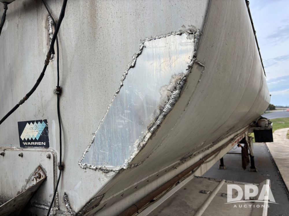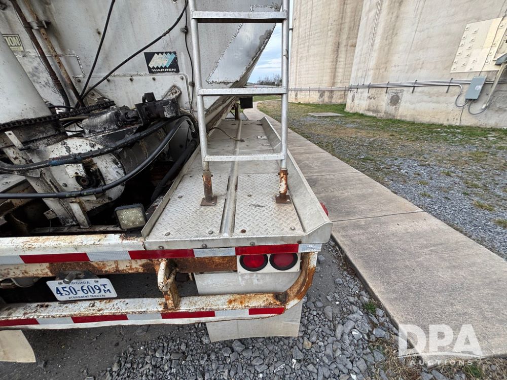 2000 Warren Feed Trailer (GP12904 Unit 16), model AT-368 compartment aluminum hydraulic feed trailer, overhead discharge auger, hard top cover, top catwalk, tandem axle, spring suspension, 22.5 tires, Dayton wheels.