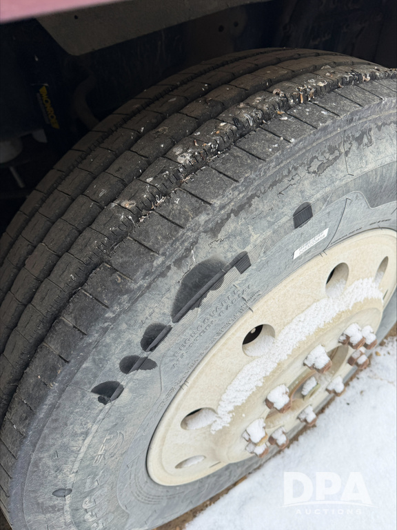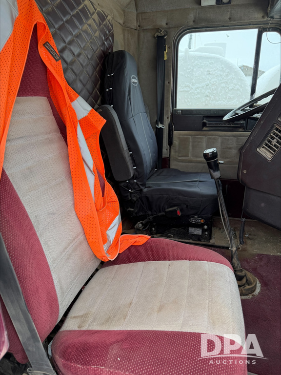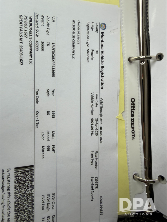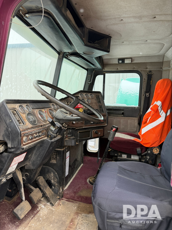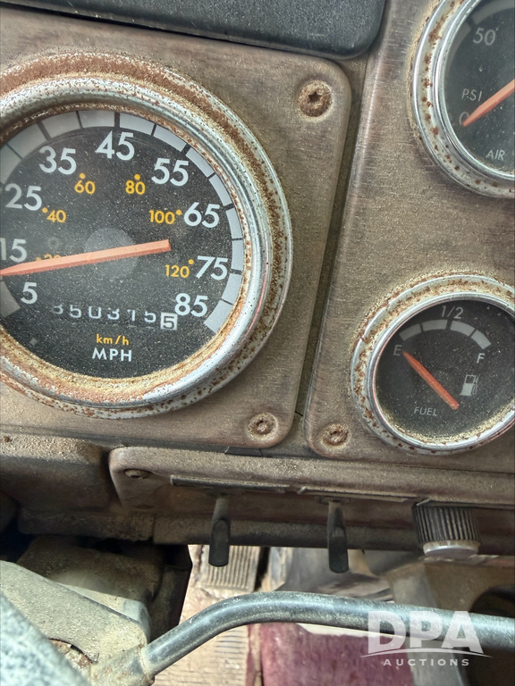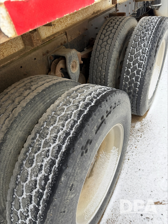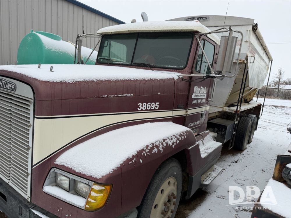 1993 Freightliner Dry Truck (DR13549), Detroit diesel engine, 9 speed transmission, tandem axle full screw, Tyler stainless steel hydraulic dry tender box, rear discharge auger, roll over tarp, engine brake, cab heat/air conditioning, 22.5 tires, aluminum wheels, odometer reads 850,315 miles.