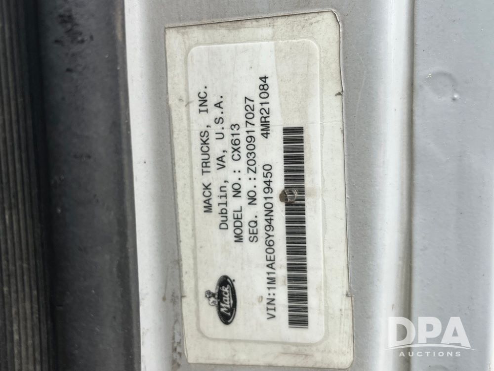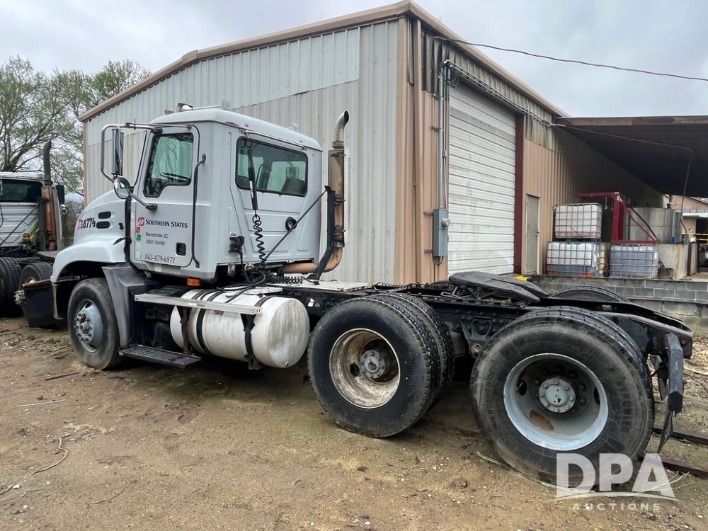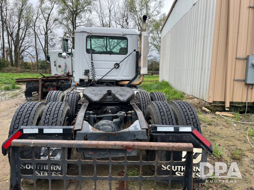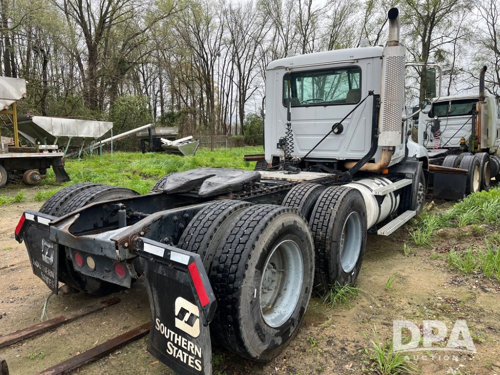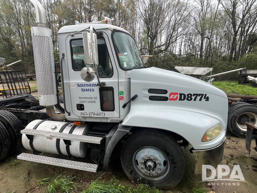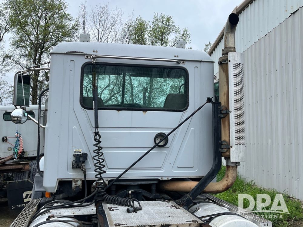 2004 Mack DX613 Day Cab Truck (JN4206, Unit D8774), diesel engine, Eaton Fuller 10 speed transmission, heat, Am/Fm radio, tandem axle, air ride suspension, 5th wheel plate, dual fuel tanks, single exhaust, 11R22.5 tires.