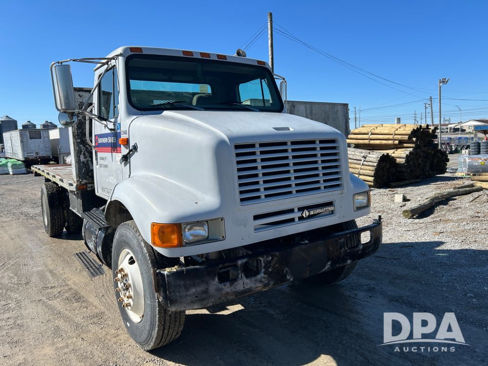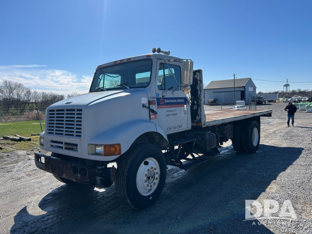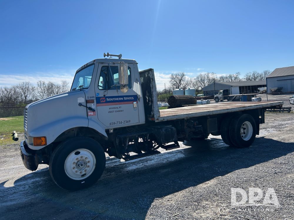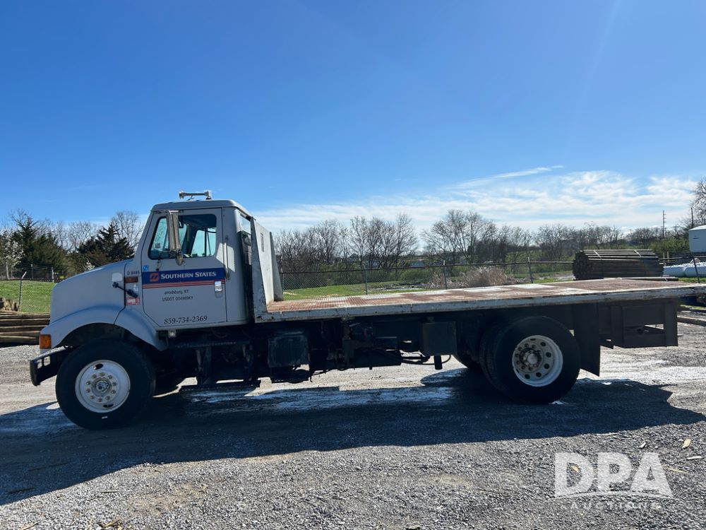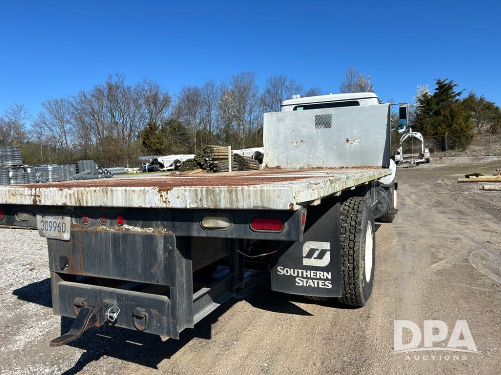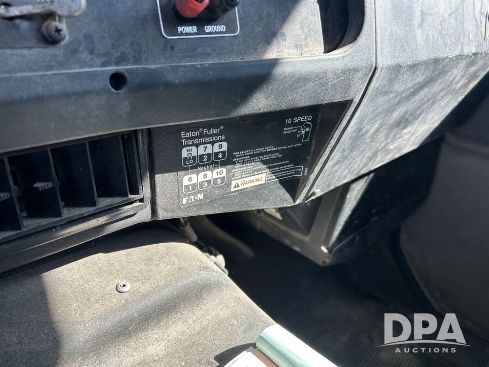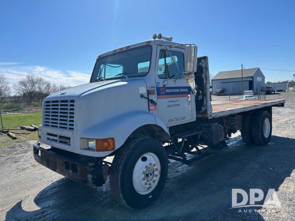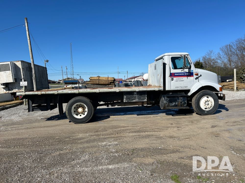 2003 International 8100 Flatbed Truck (CP1572, Unit D8485), Cat diesel engine, 10 speed transmission, heat, Am/Fm radio, single axle, spring suspension, rear flatbed, pump, 11R22.5 tires, shows 288,761 miles.