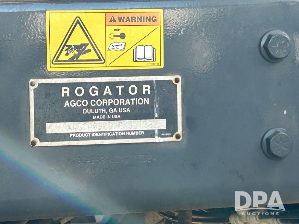 2013 RoGator RG900 Sprayer (CP1841, Unit S9164), SisuTronic diesel engine, hydrostatic transmission, heat, air conditioning, Am/Fm radio, 900 gallon stainless steel liquid system, 90' boom, top poly rinse tank, 380/90R46 tires, front fill option, backup camera, Raven GPS, Raven Viper 4 monitor, seller believes to be approx. 4,000 hours.