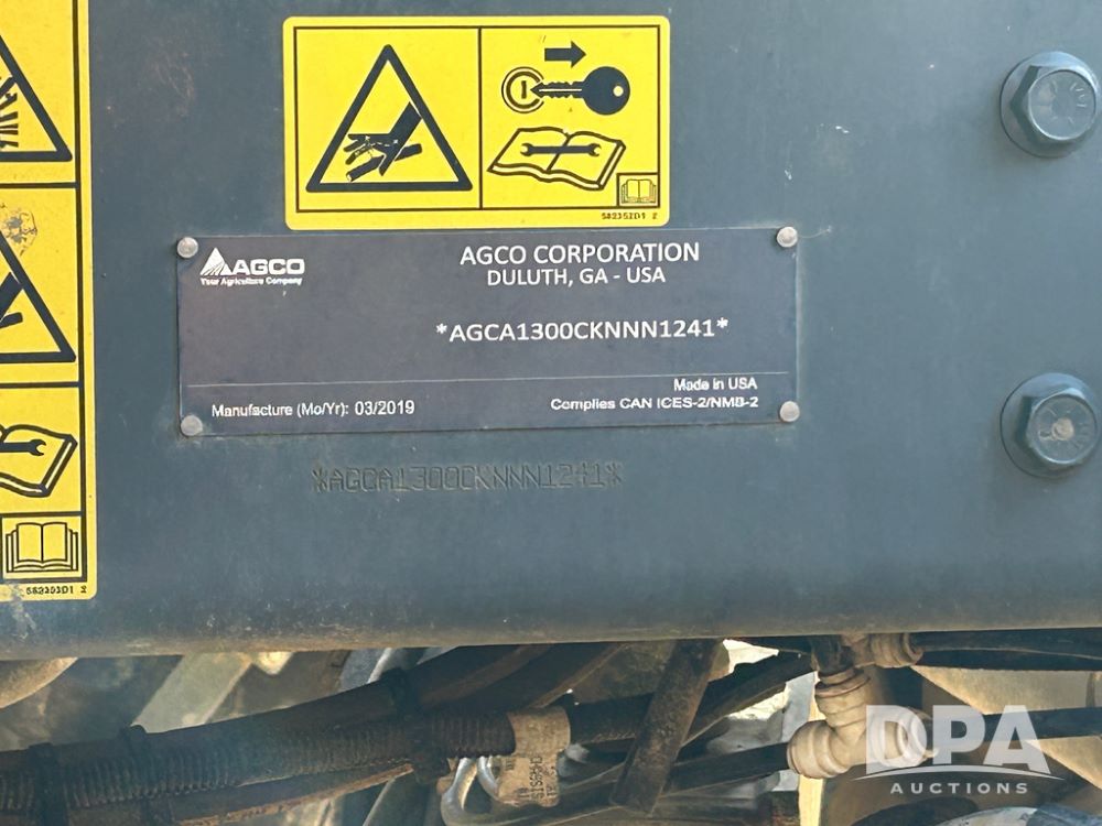 2019 RoGator RG1300C Dry Machine (CP1842, Unit F10109), diesel engine, hydrostatic transmission, heat, air conditioning, Am/Fm radio, New Leader dry spreader box, New Leader MultApplier insert, sual spinners, 380/90R46 crop crop tires, fenders, Raven GPS, Raven Viper 4 monitor. seller believes to be approx. 2,900 hours.