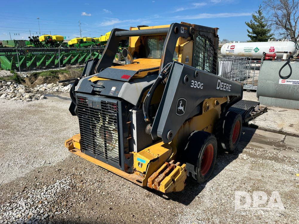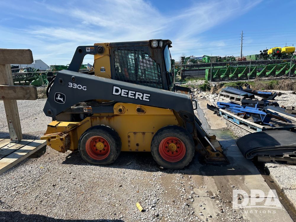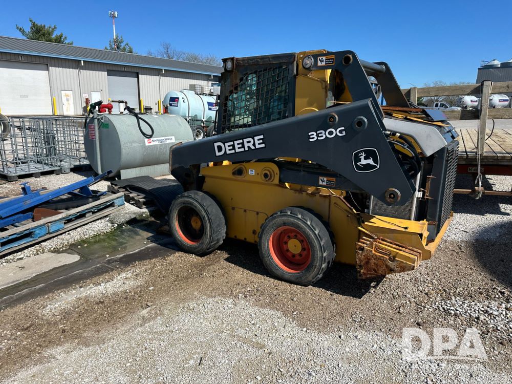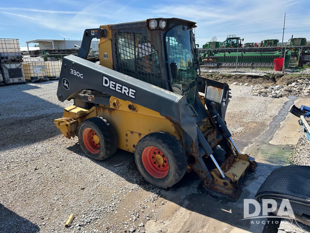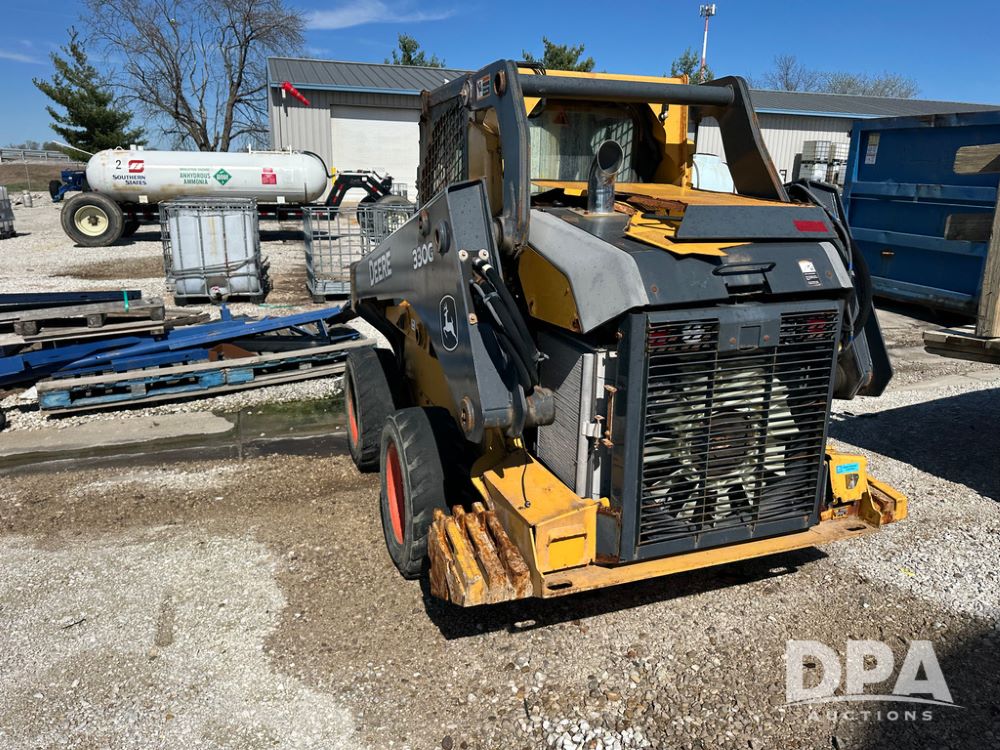 John Deere 330G Skid Steer (CP1584), EROPS, diesel engine, joystick controls, heat, Am/Fm radio, rear counter weights, 10-16.5 tires, Quick Tach,