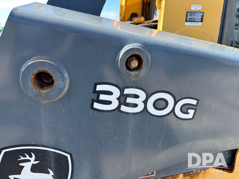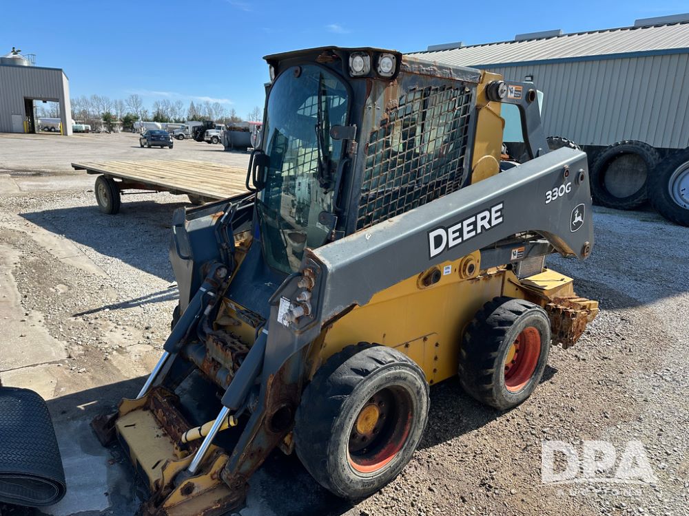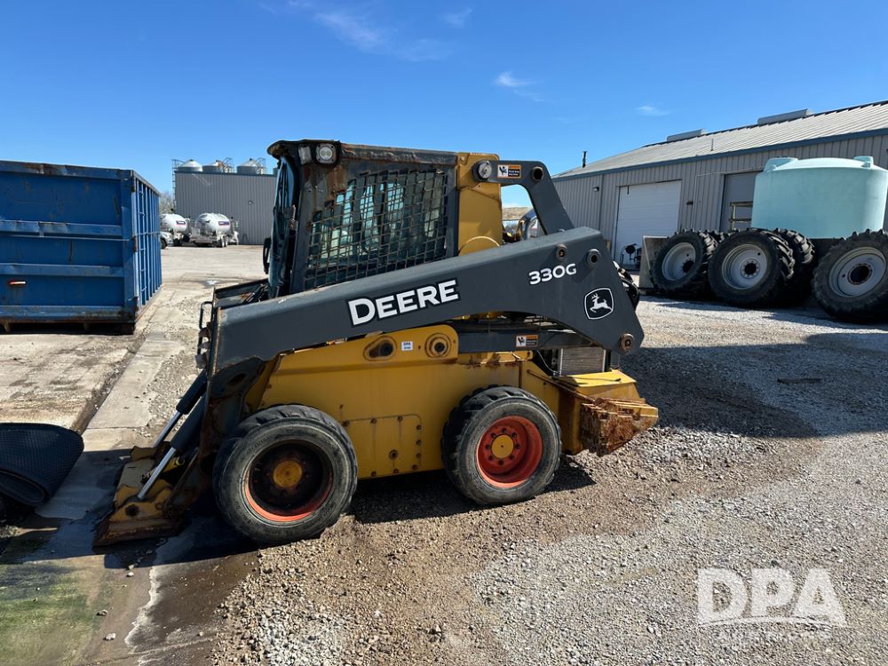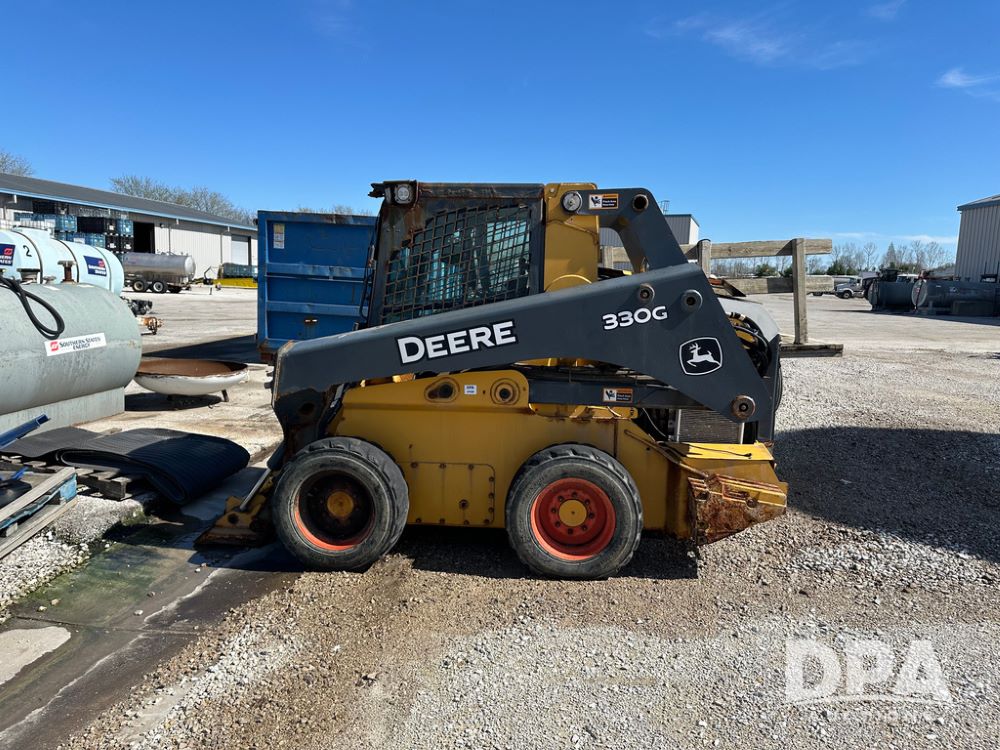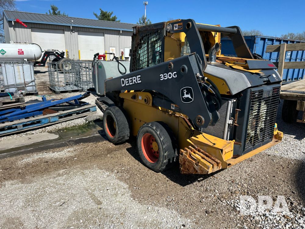 John Deere 330G Skid Steer (CP1584), EROPS, diesel engine, joystick controls, heat, Am/Fm radio, rear counter weights, 10-16.5 tires, Quick Tach,