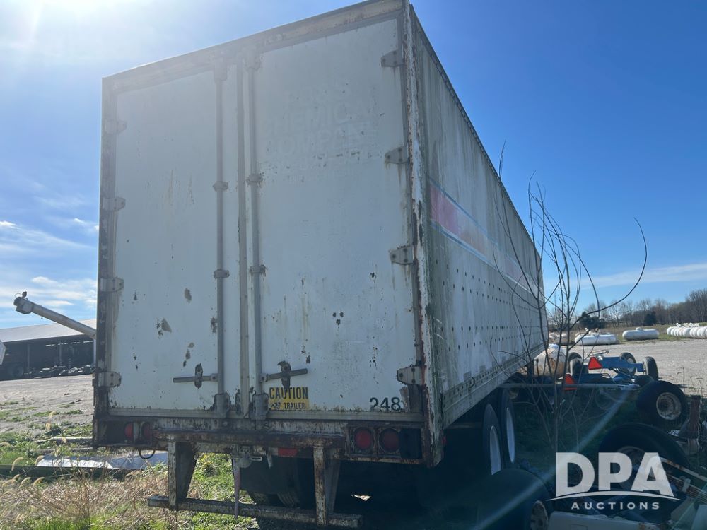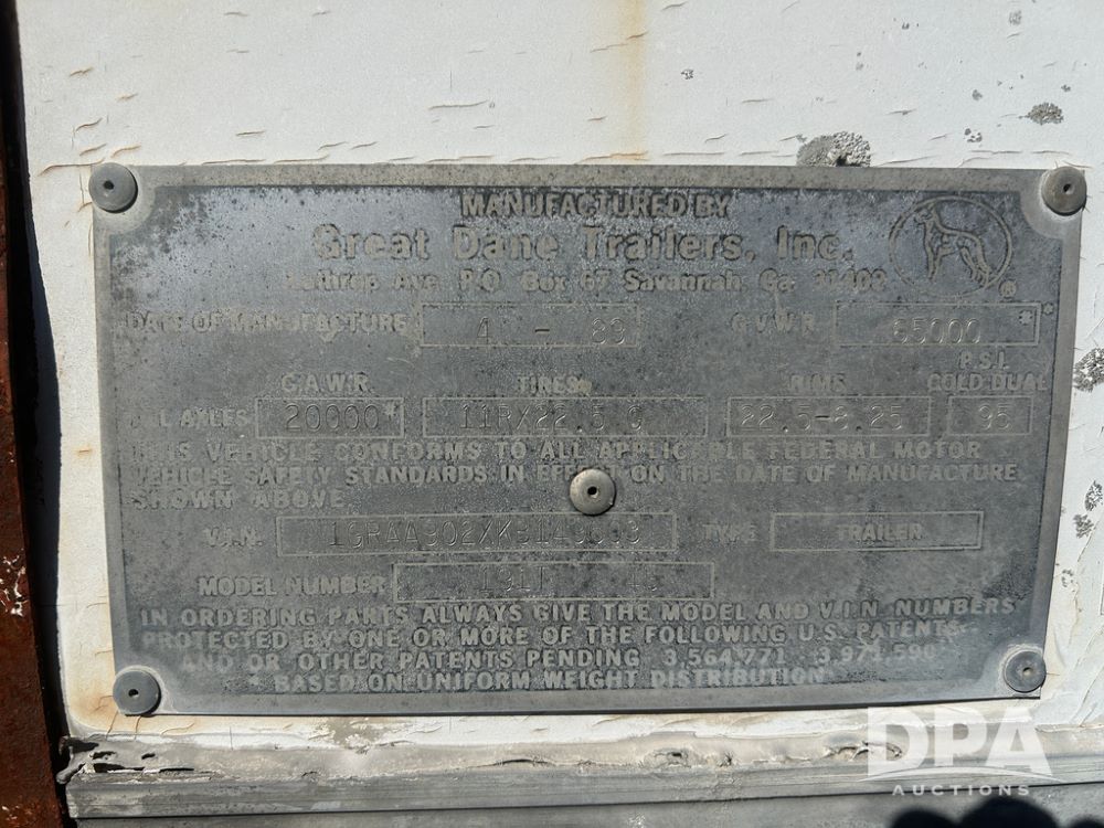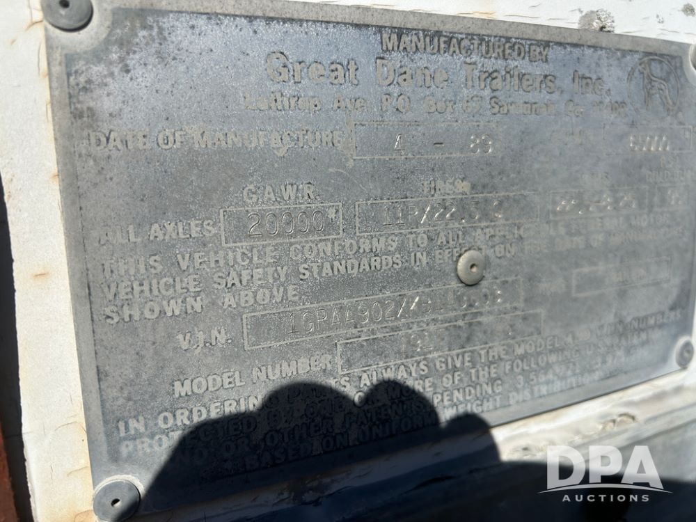1989 Great Dane Dry Van Trailer (CP1126), 1989 Great Dane Model 191T 45 dry van trailer, approx. 45' length, tandem axle, spring suspension, 11R22.5 tires, rear cargo doors, landing gear, GVWR 65,000 pounds.