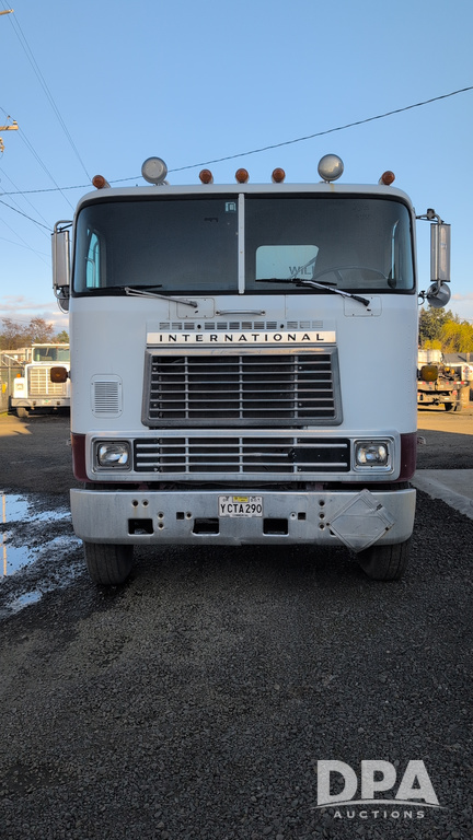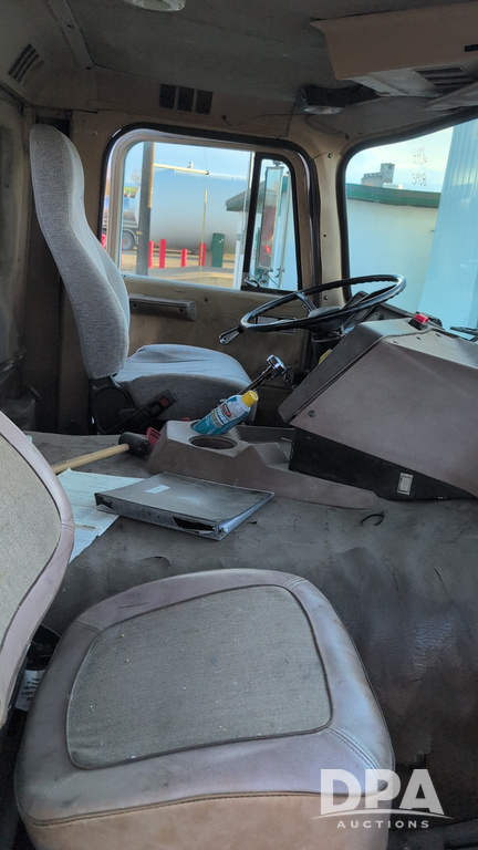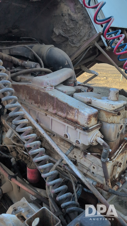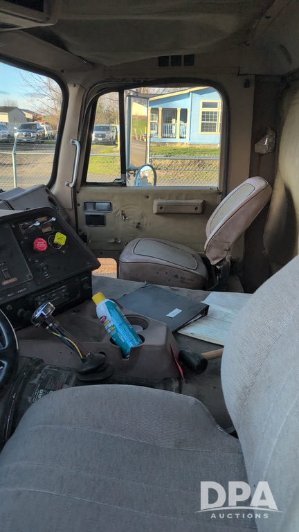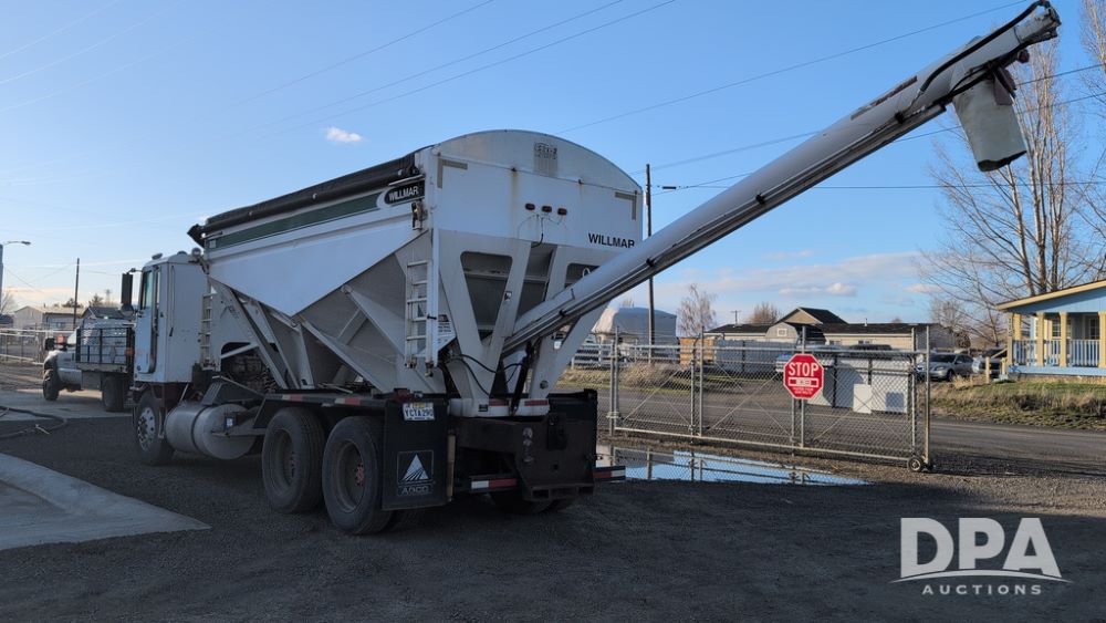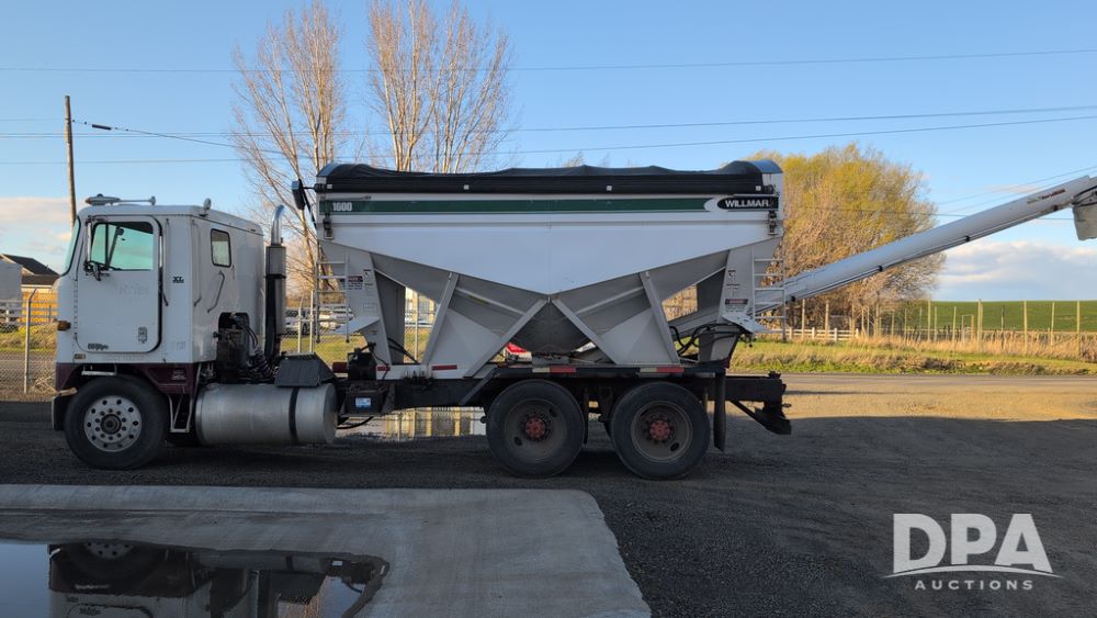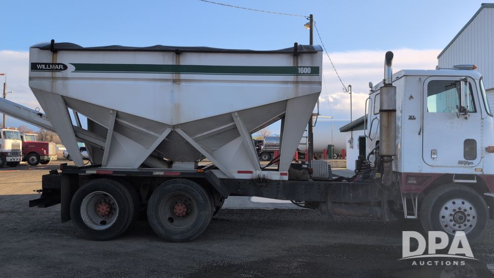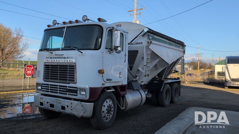 1983 International Cabover Dry Tender Truck (NP6589, Unit 31908), Model COF9670 truck, diesel engine, Eaton Fuller manual transmission, heat, Am/Fm radio, tandem axle, Willmar 1600 dry tender box, rear discharge auger, electric roll tarp, hydraulic, single fuel tank, single exhaust, 11R22.5 tires, shows 1,008,406 miles.