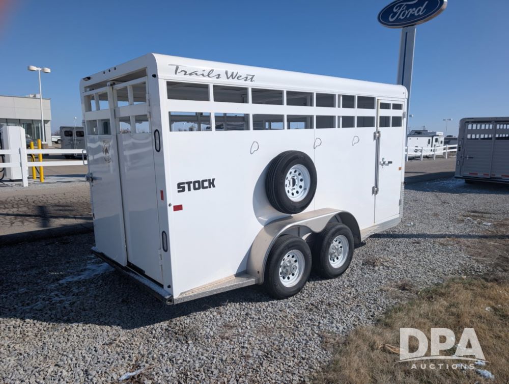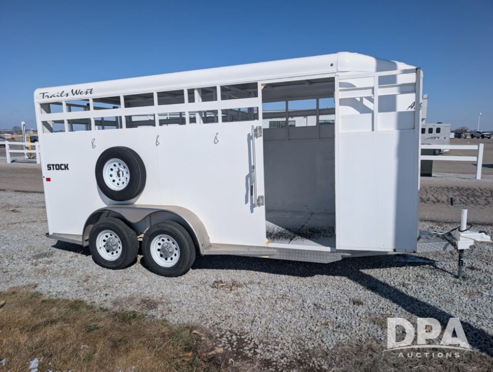 2024 Trails West Stock Trailer (CG474), 17ft long, 6ft 9in wide, 7ft tall, 5,200lb axles, center gate, rear sliding gate, rear flood light, floor mats.