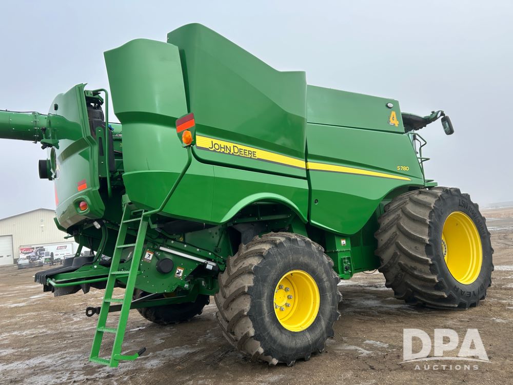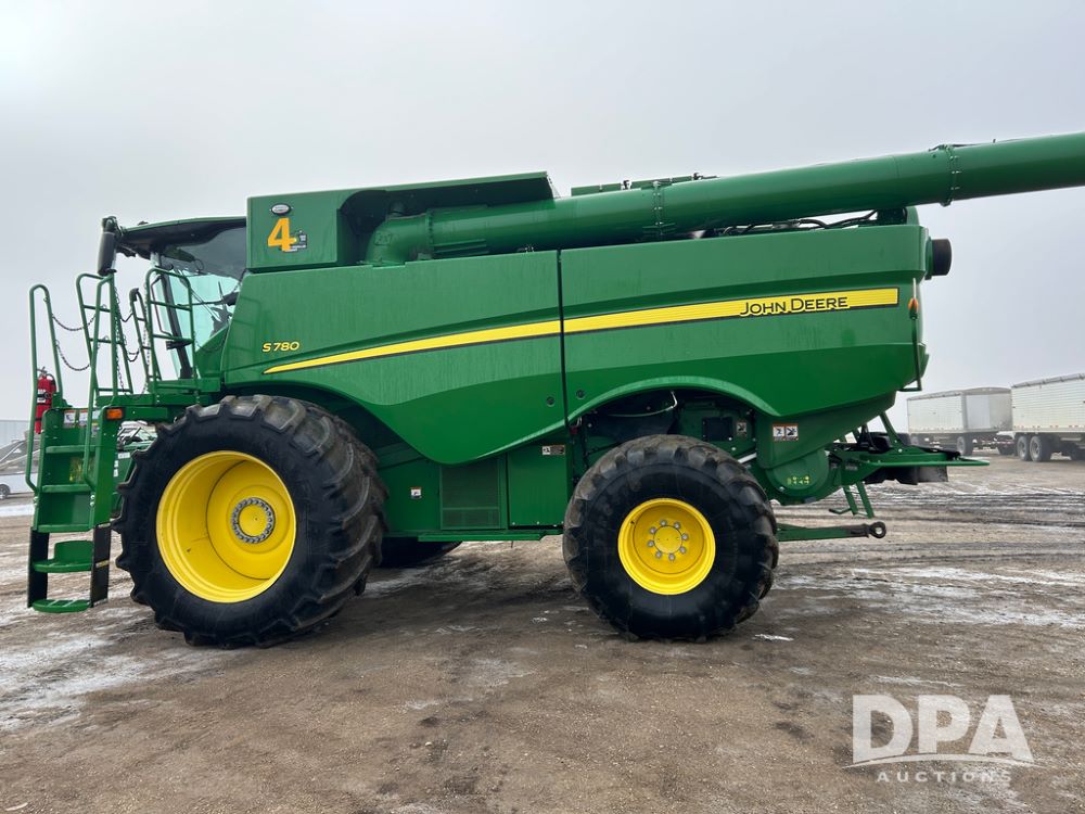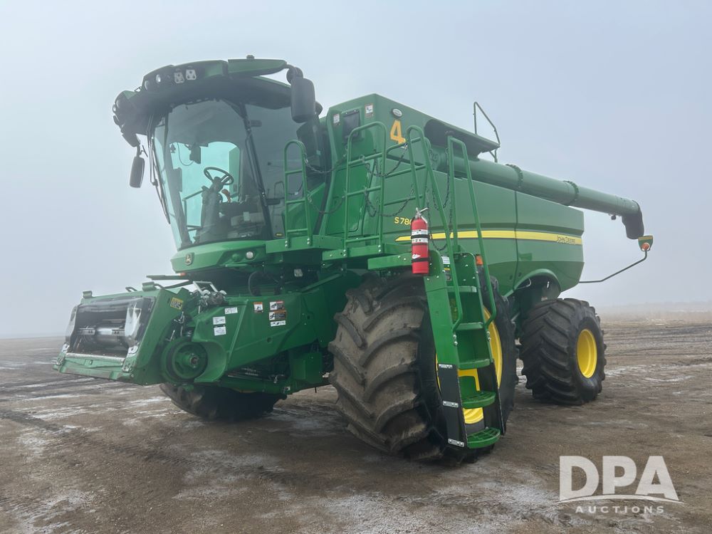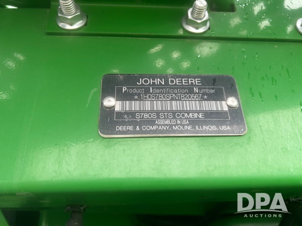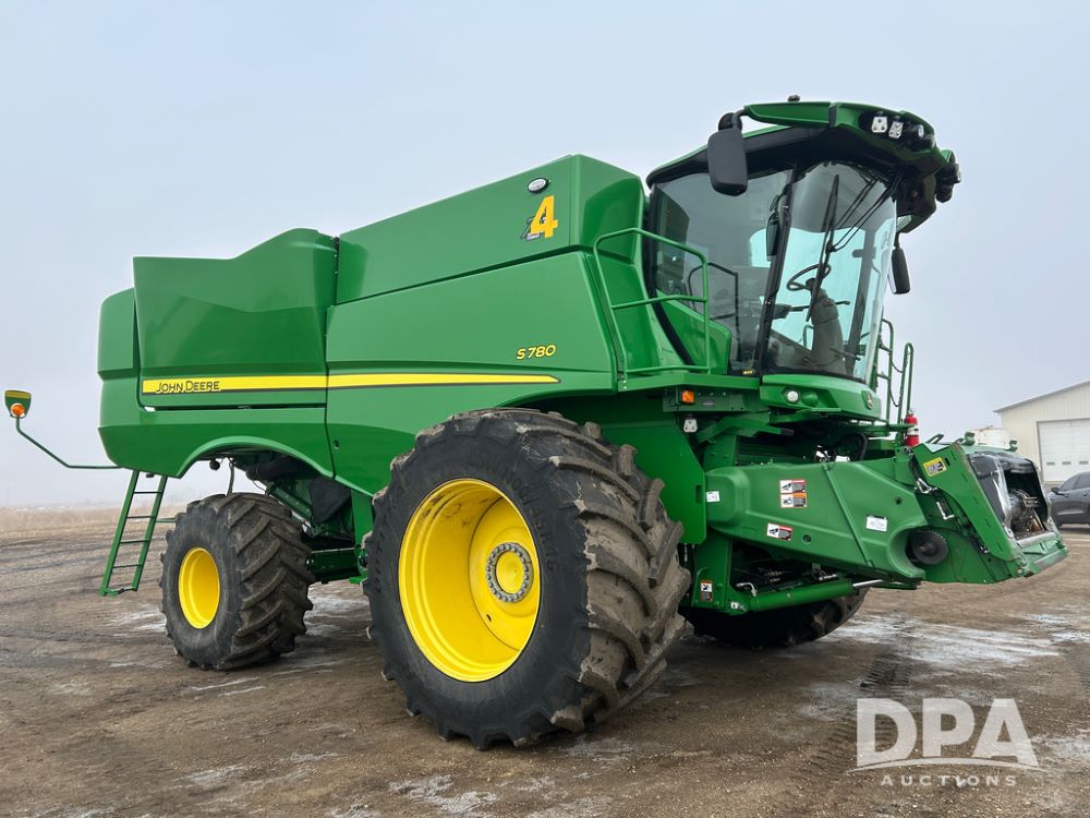 2022 John Deere 780S STS Combine (CP1792), 2-wheel drive, ProDrive, 5-speed feeder house, Power folding tank extensions, contour master, 28.5’ unloading auger, PowerCast powered tailboard, Gen 4 4600 processor, combine advisor, Auto Trac ready, data sync, in-field sharing, active yield, general purpose shoe, power mirrors, cloth seats, 26 high capacity unloading auger, refrigerator, LSW 110/45R46 front, 750/65R26 rears, 1,330 separator hours, 1,834 engine hours.