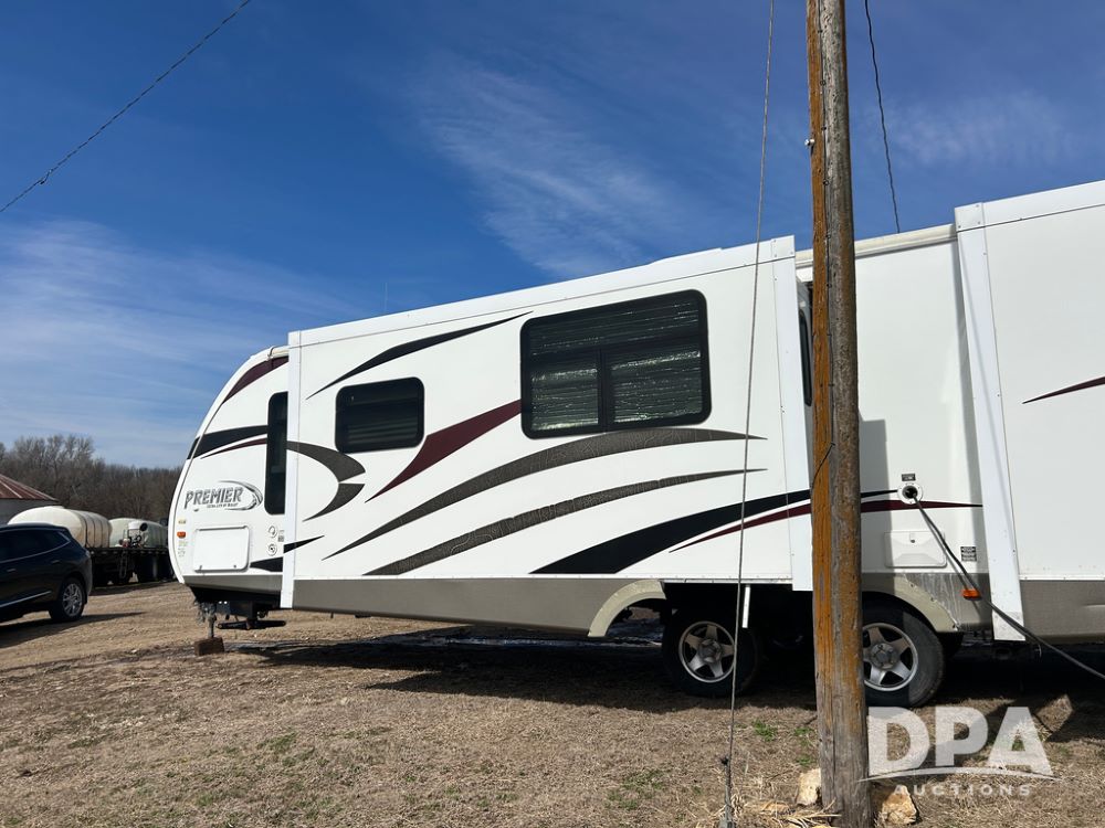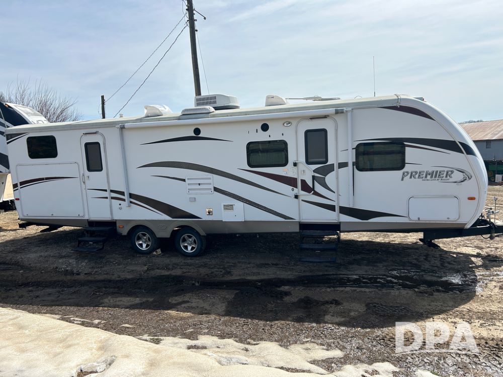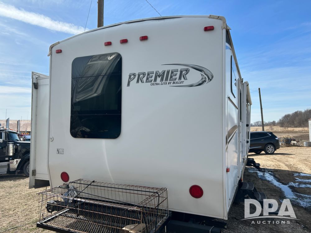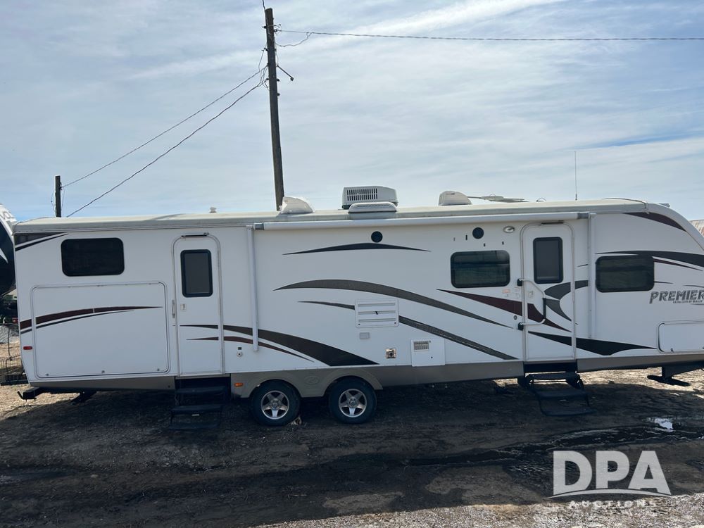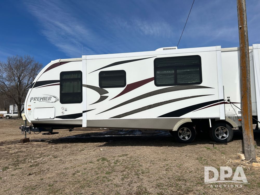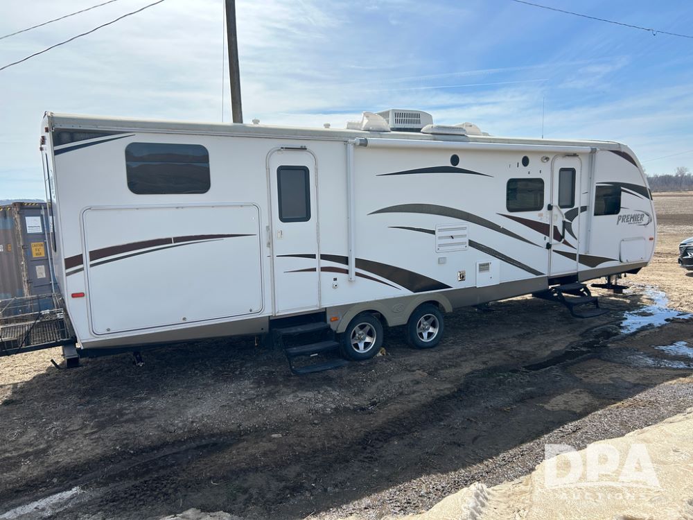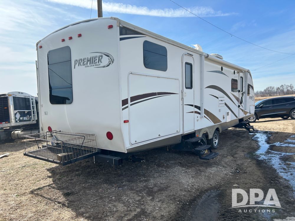 2012 Keystone Premier Ultra Camper (CP1872), Keystone Premier Ultra Camper, approx. 31' camper, GVWR 7,600 pounds, bumper hitch, (2) slide outs, spread axle, (2) outside side access doors, heat, air conditiong, power awning, outdoor shower, ST205/75R14 tires, outdoor kitchen area (door is stuck), bathroom with shower, bunk beds with fold out futon, kitchen table that converts to sleeping platform, sink, oven, microwave, fridge/freezer, full size bed, comes with equalizer hitch.