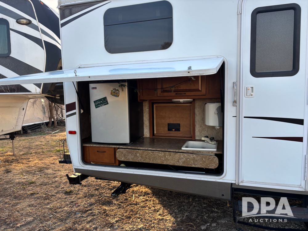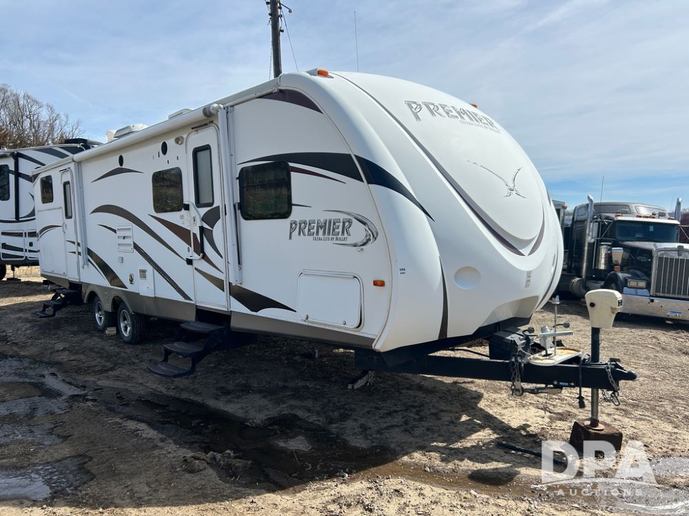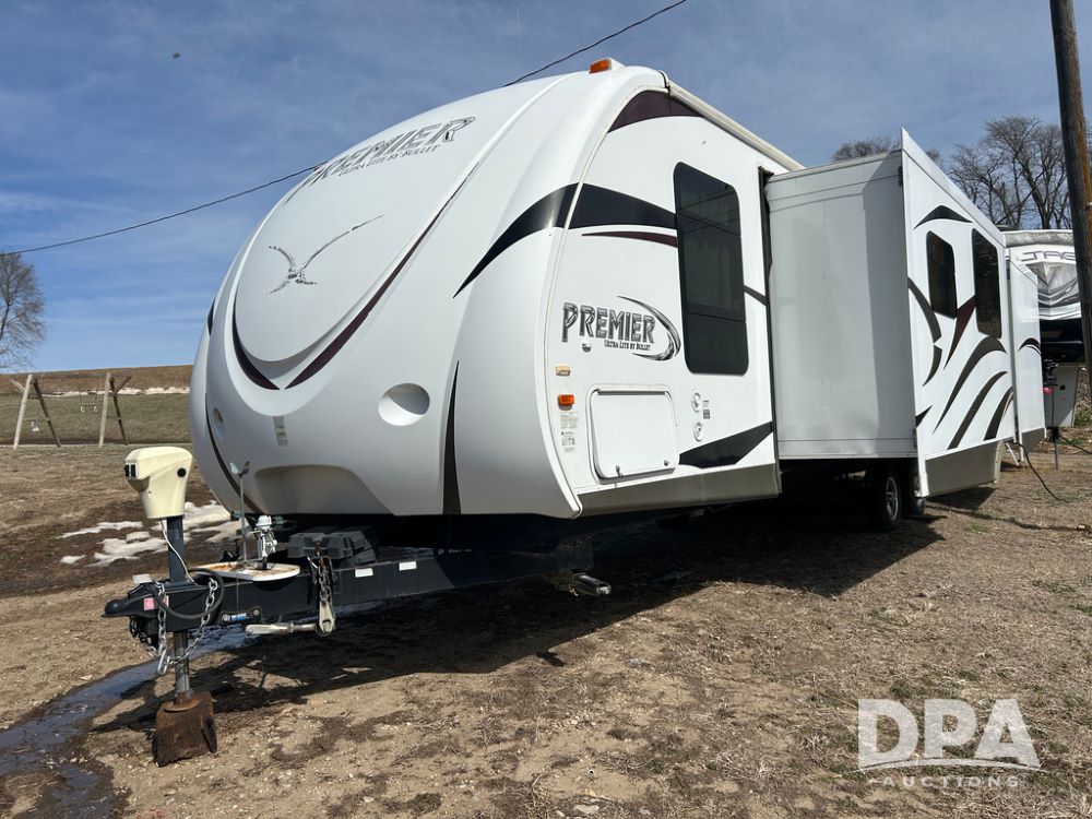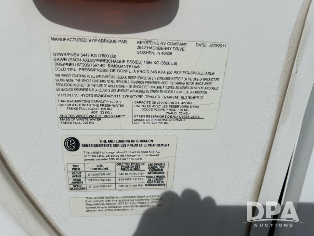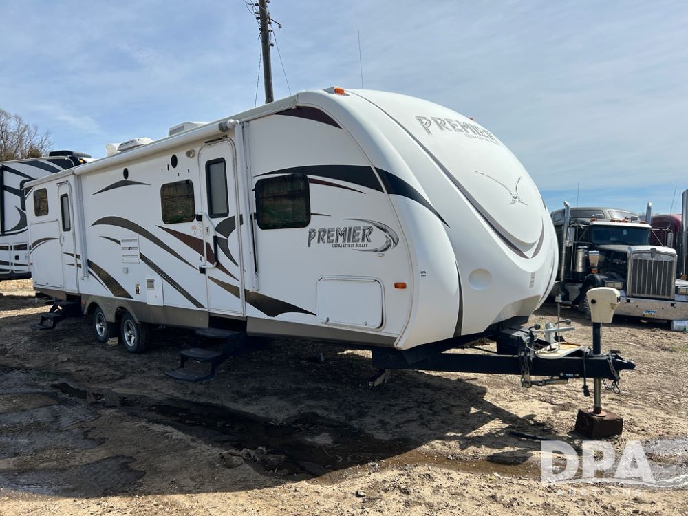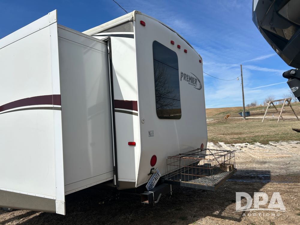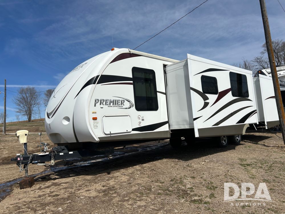 2012 Keystone Premier Ultra Camper (CP1872), Keystone Premier Ultra Camper, approx. 31' camper, GVWR 7,600 pounds, bumper hitch, (2) slide outs, spread axle, (2) outside side access doors, heat, air conditiong, power awning, outdoor shower, ST205/75R14 tires, outdoor kitchen area (door is stuck), bathroom with shower, bunk beds with fold out futon, kitchen table that converts to sleeping platform, sink, oven, microwave, fridge/freezer, full size bed, comes with equalizer hitch.