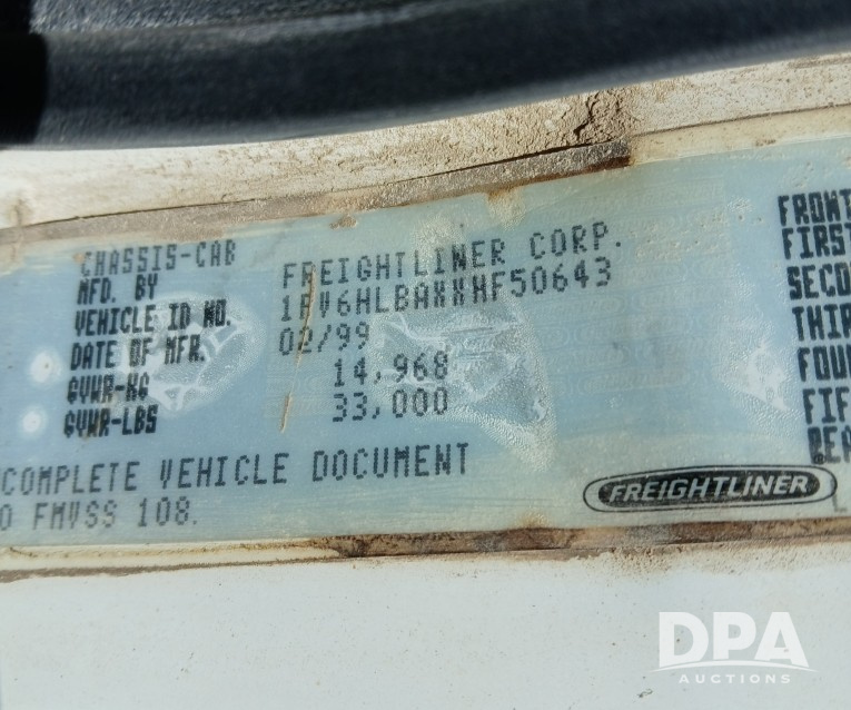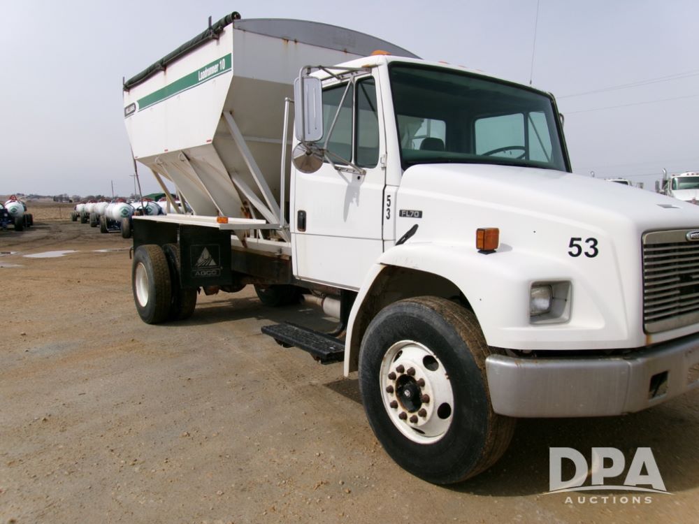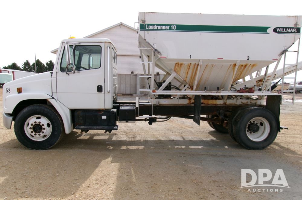 1999 Freightliner FL70 Dry Tender Truck (DB043), Cummins 8.3 engine, 6 speed transmission, heat, air conditioning (needs charged), radio, 12,000 lb. front axle, 23,000 lb. rear axle, 11 x 24.5 tires, 10 ton Willmar dry tender box, shows 331,000 miles.