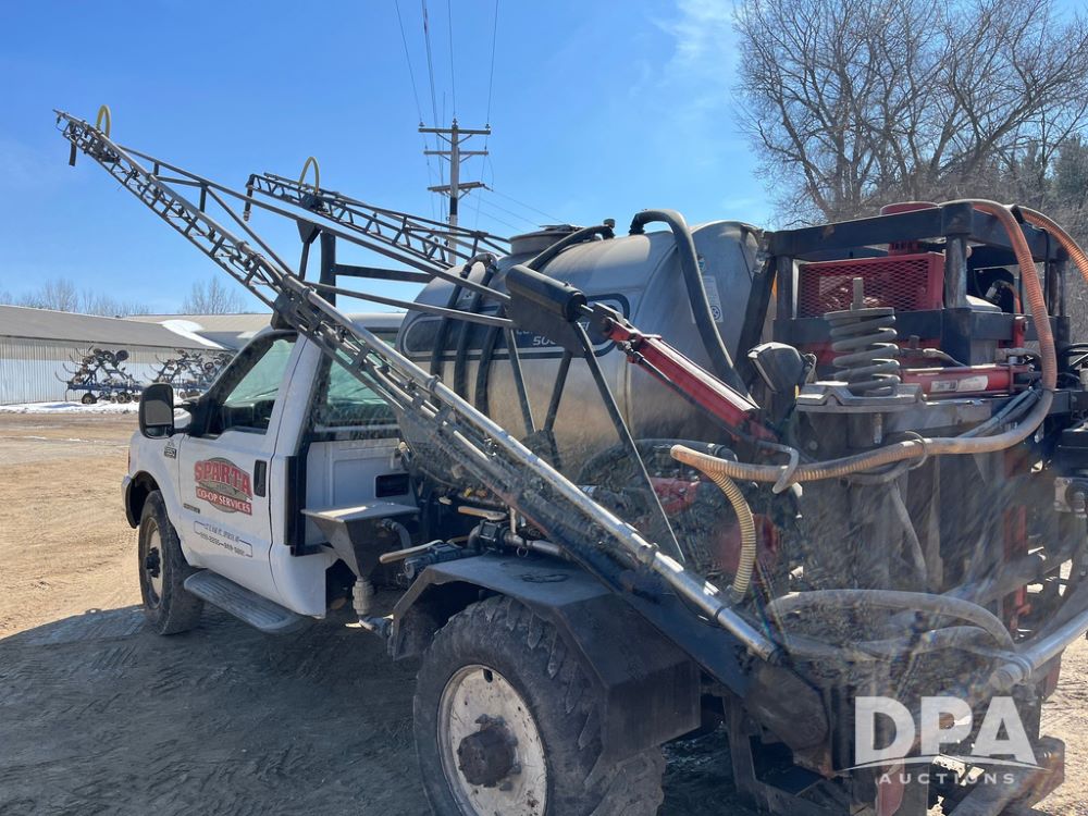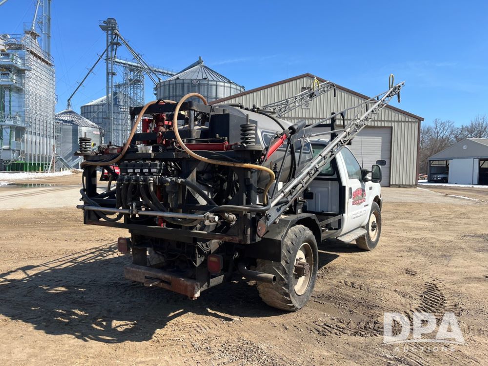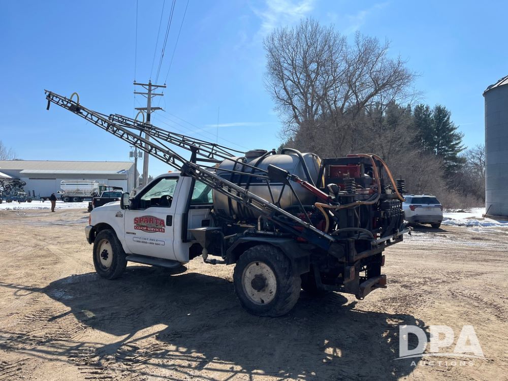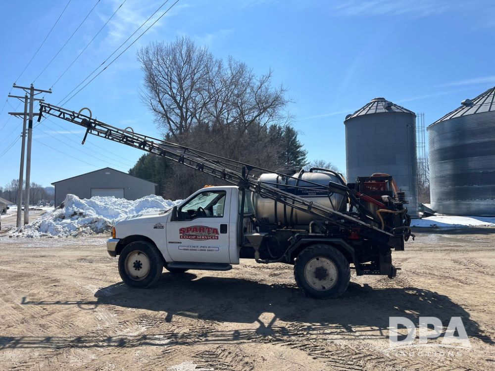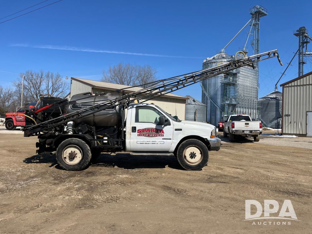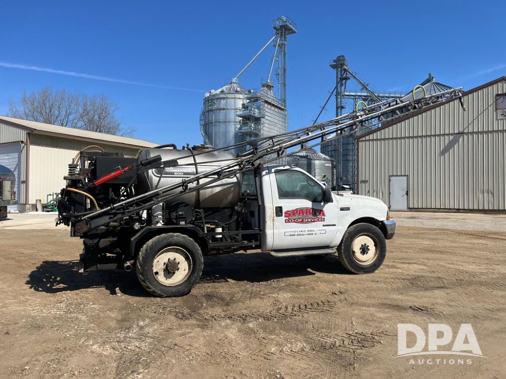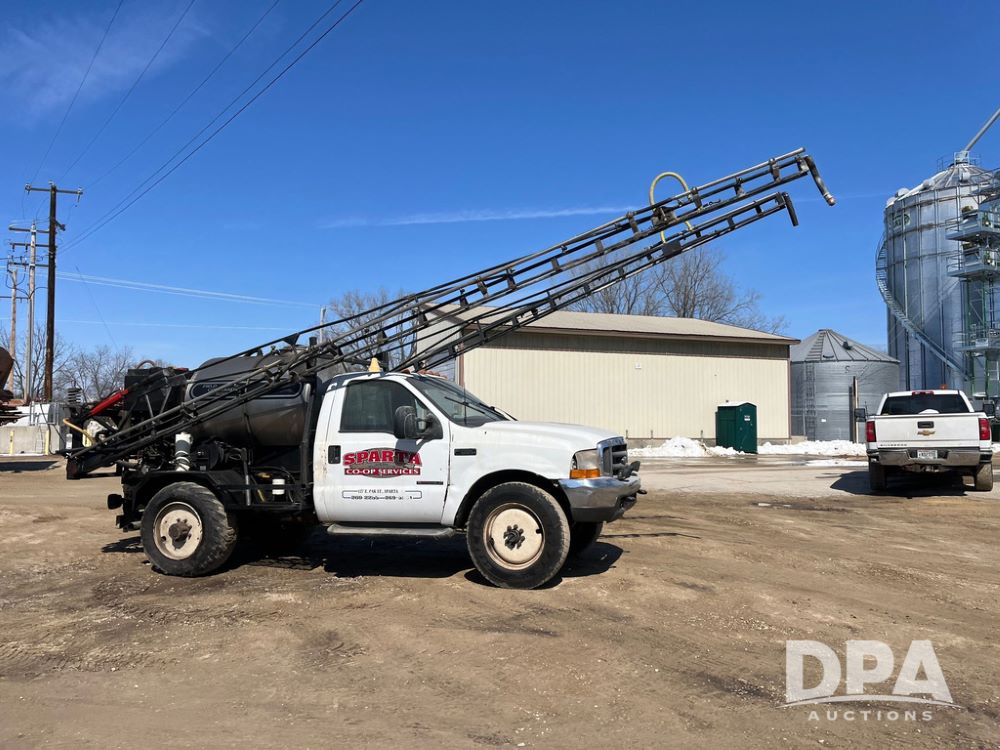 1999 Ford F-550 XLT Super Duty 4x4 Pickup Sprayer (JN4233), diesel engine, automatic transmission, heat, Am/Fm radio, power windows, locks and mirrors, cruise control, Field Commander 500 gallon stainless steel liquid system, stainless steel chemical inductor tank, foam marker, running boards, 265/75R22.5 front tires, 400/55-22.5 rear tires, Raven SCS 450 controller, shows 46,917 miles.