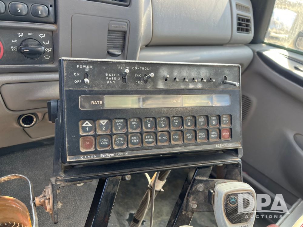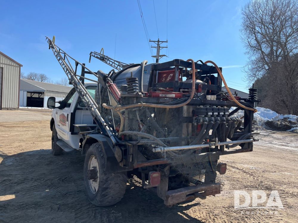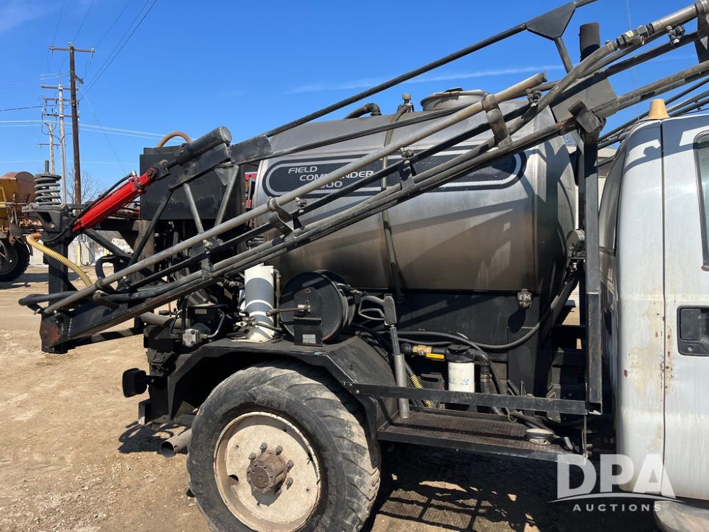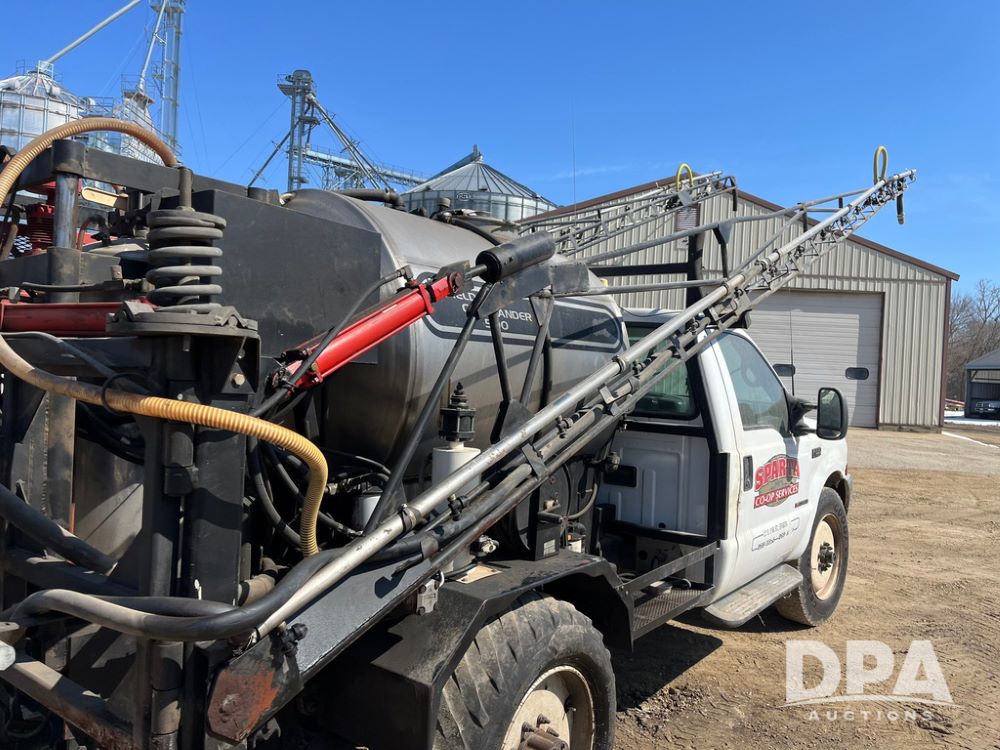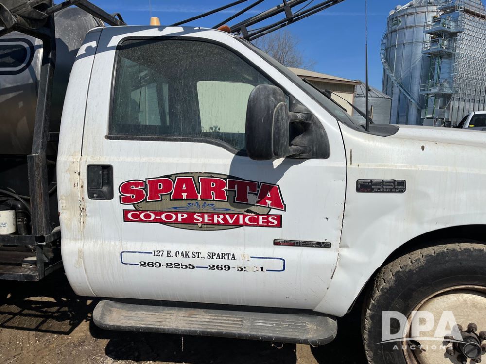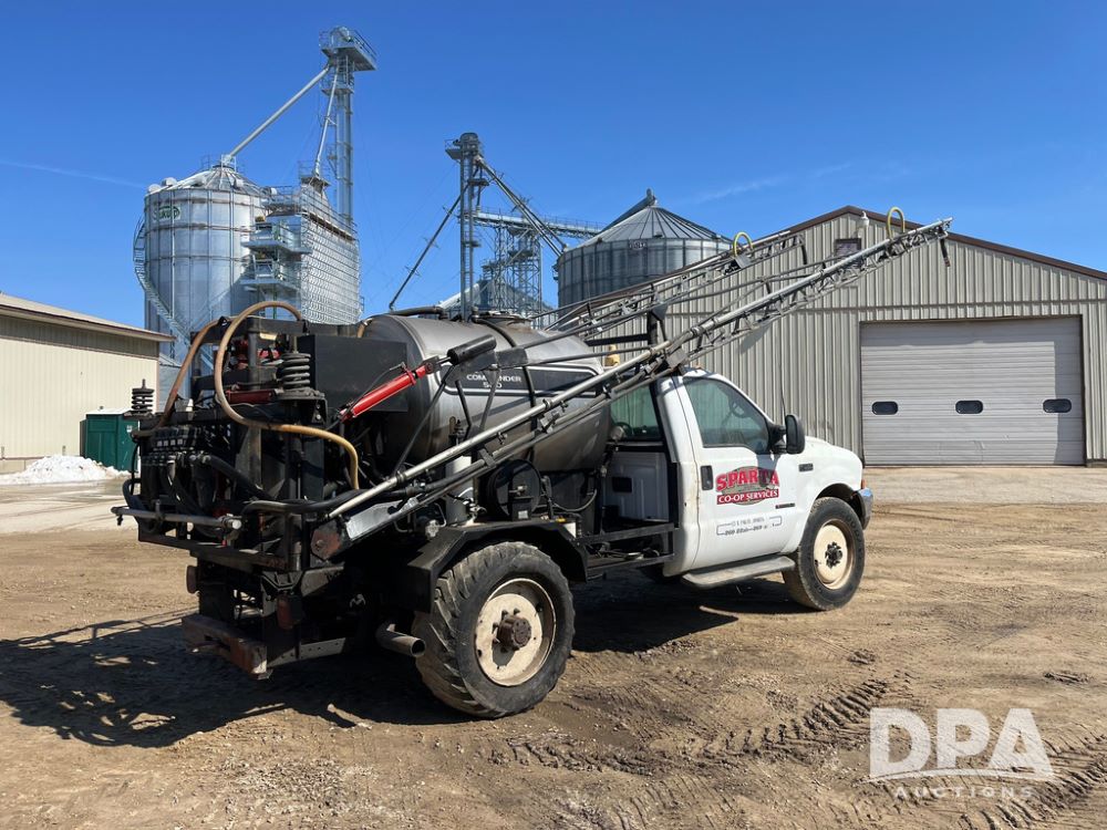 1999 Ford F-550 XLT Super Duty 4x4 Pickup Sprayer (JN4233), diesel engine, automatic transmission, heat, Am/Fm radio, power windows, locks and mirrors, cruise control, Field Commander 500 gallon stainless steel liquid system, stainless steel chemical inductor tank, foam marker, running boards, 265/75R22.5 front tires, 400/55-22.5 rear tires, Raven SCS 450 controller, shows 46,917 miles.