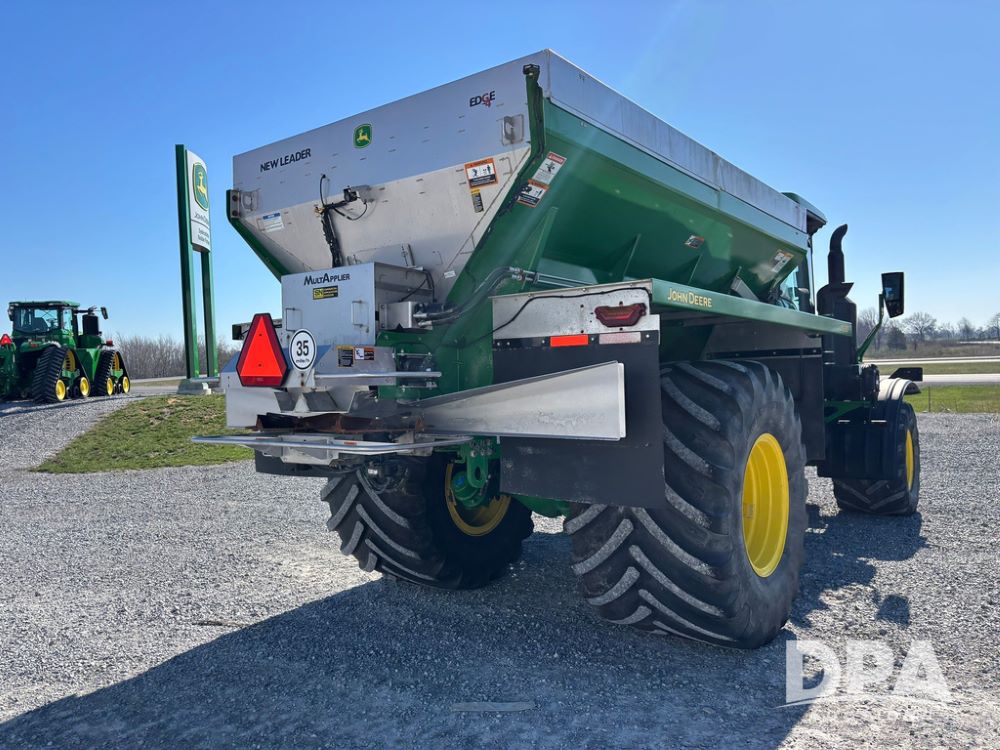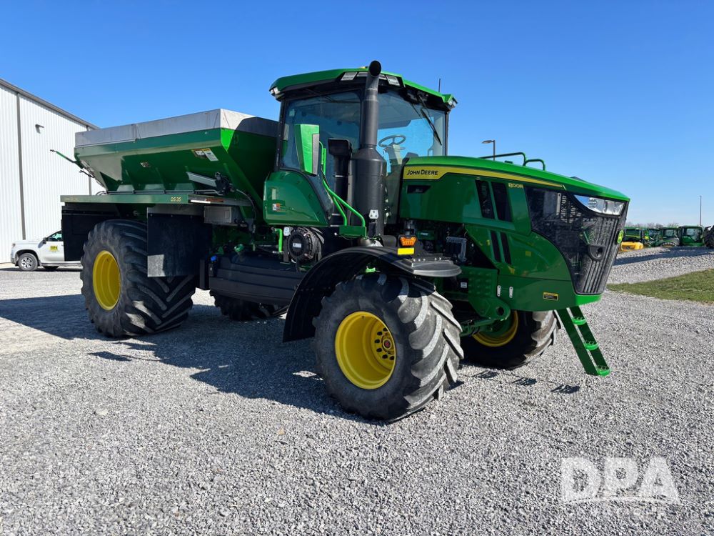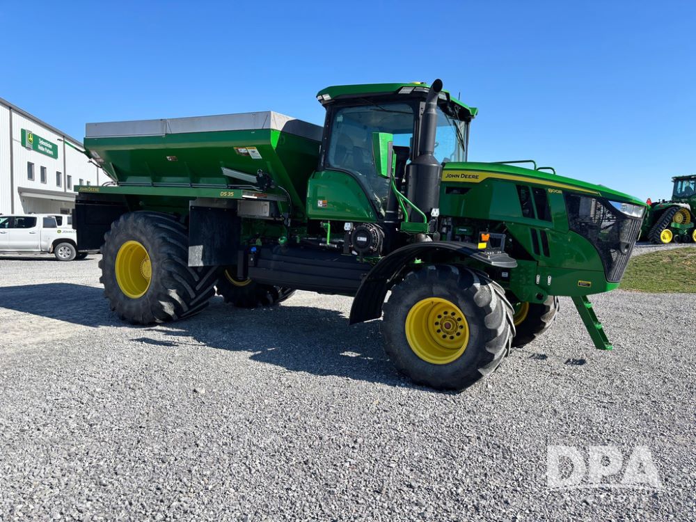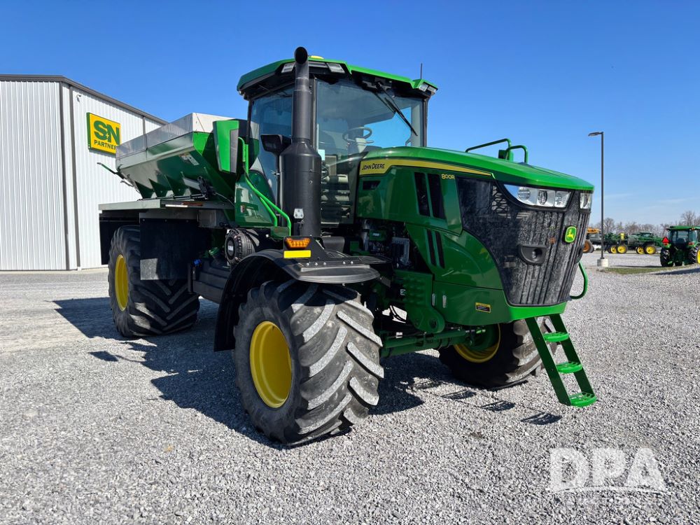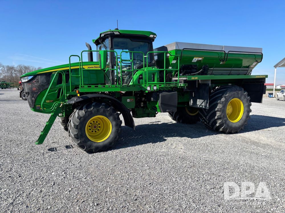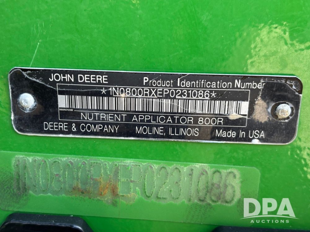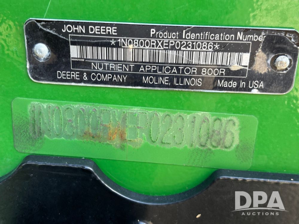 2023 John Deere 800R Dry Floater (GP12952), 9.0L - 6 cylinder turbo diesel engine - 365 HP (S/N RG6090U143706), 2 wheel drive, two speed IVT (infinitely variable transmission), 30 MPH field, 46 MPH transport, SIGNATURE EDITION, Command View III plus premium cab, ultimate comfort & convenience package, HVAC, Cat 1 cab filtration, auto temp control, cruise control, active seat II air suspension seat, folding buddy seat, premium Am/Fm radio, refrigerator, New Leader DS35-NL4500 G4.5 EDGE, 409 painted steel MultApplier dry box (AKK35814 - 14', S/N 1049055), 356 cubic feet capacity, #4 belt over chain product delivery, 11" feed gate, 8.5' x 14' hopper, 7' MultApplier 304 stainless insert (S/N 1049057), left & right Edge boundary control of dual 24" spinners, New Leader dry rate controller, electric oiler, includes L4500G4 stainless steel end gate to convert back to single product application, 750/50R26 front tires, 1050/50R32 rear tires, Command Arm integrated 10" JD Gen4 4600 display, Premium 3.0 activation (Auto Trac, Section Control, RowSense & In-Field Data Sharing Activations), JDLink MTG, ultimate visibility LED field lighting upgrade, rear view camera, LED beacon lights, 4 wheel leaf spring suspension, front rear hydraulic power steering, Integrated SF7000 global position receiver, shows 529 hours.
