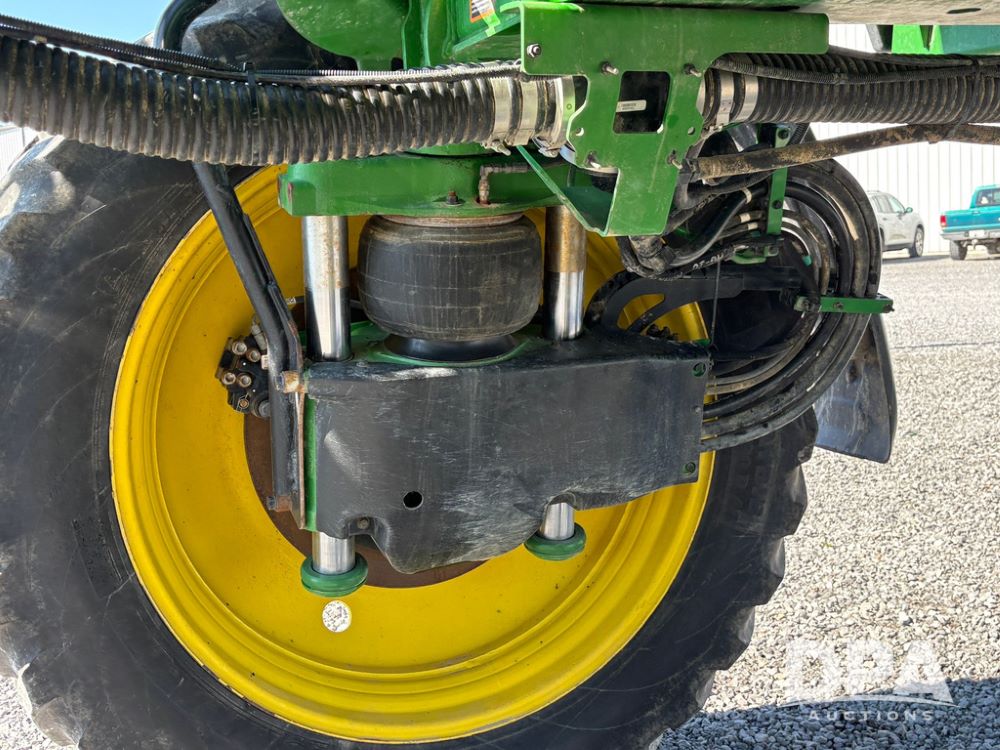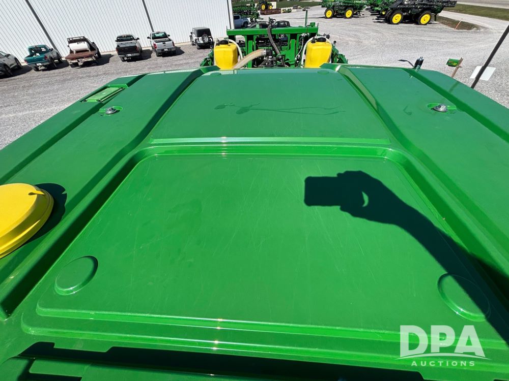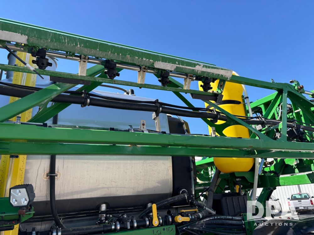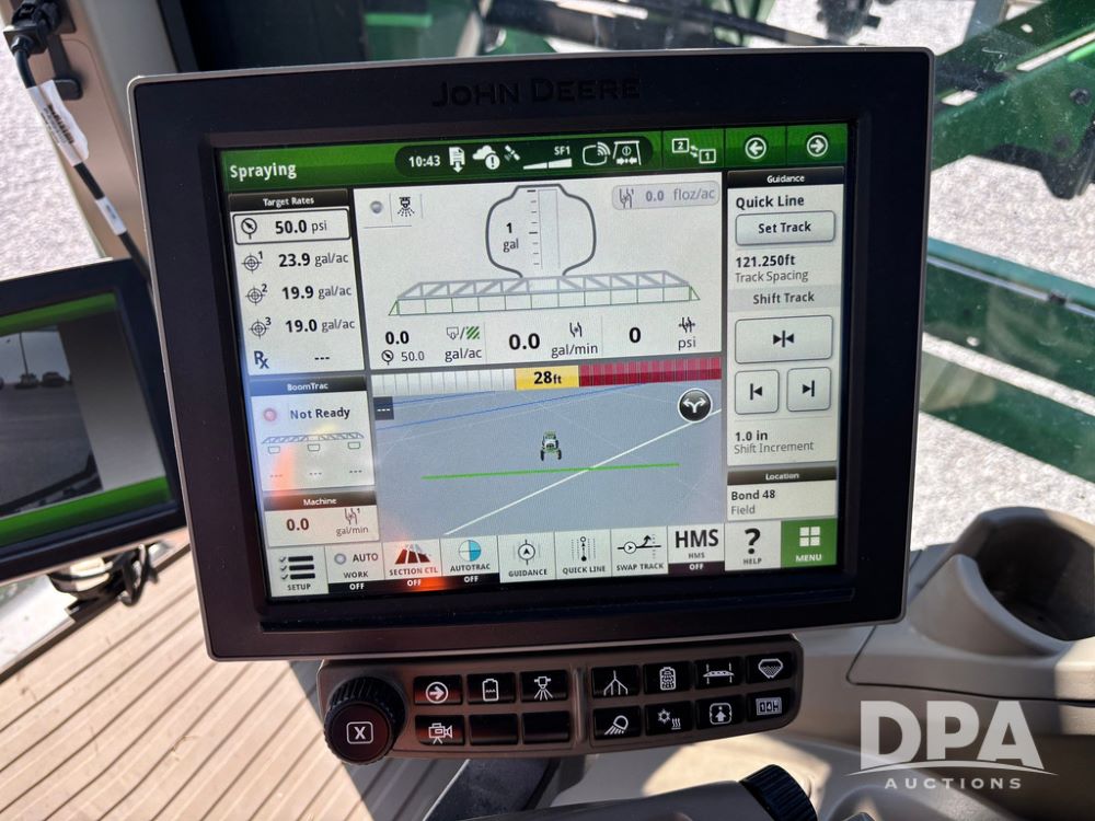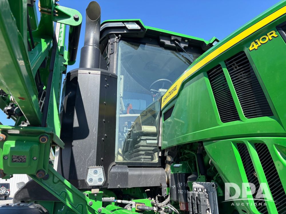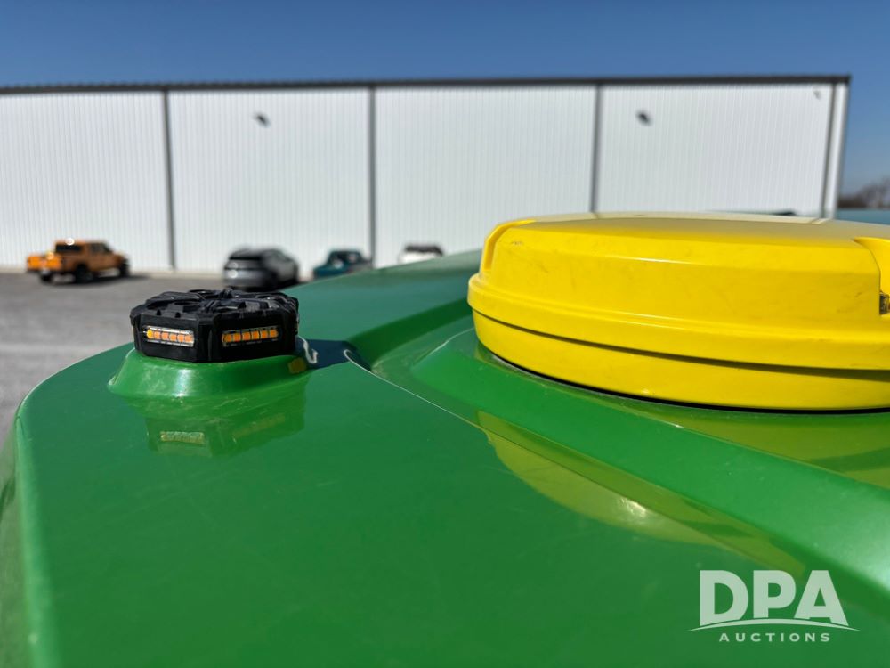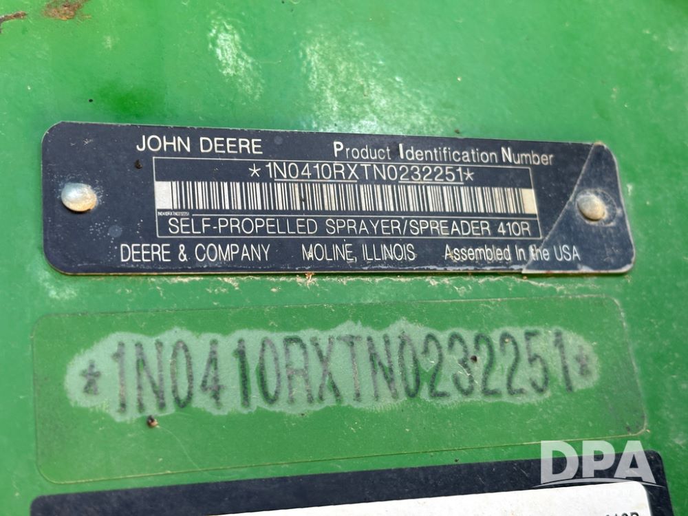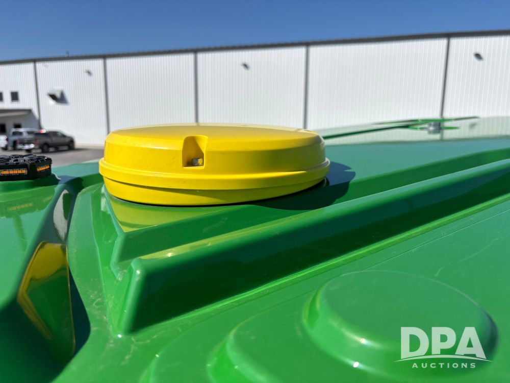 2023 John Deere 410R Sprayer (GP12953), full time 4 wheel drive with traction control, 9.0L - 6 cylinder turbo diesel engine - 310 HP (S/N RG6090U132442), dual range hydrostatic drive (25 MPH field, 35 MPH transport), JDLink MTG, CommandView 4 cab, HVAC, ultimate comfort and convenience package, auto temp control, Active II leather air suspension seat, leather buddy seat, premium touch screen Am/Fm radio, refrigerator, 1,000 gallon stainless steel liquid system, 3" left side quick fill and front fill, 120' steel boom, 1" stainless plumbing, 15" on-center spacing, (97) five position nozzle bodies, (11) section boom control valves, automatic solution control, fence row nozzles left & right, single drop foam markers, 3"x2" high flow solution pump (15 to 225 GPM), boom air purge, 5 sensor auto boom leveling, underframe crop shields, direct chemical injection system with (2) 50 gallon tanks & (1) high volume pump, hydraulic tread spacing adjustment (120-160"), auto air spring chassis leveling, on board air compressor, 380/90R46 tires, Cat 1 air filtration system, Gen 4, 4600 Command Center Gen4 GreenStar 10" color display and extended monitor, Command Center Premium 3.0 activation auto trac, section control, RowSense, Data Sync & Data Share, mechanical RowSense sensors and vision camera, premium visibility package, LED field lighting, LED beacon lights, rear view camera, Integrated SF7000 SF-1 global position receiver, shows 1,655 hours.