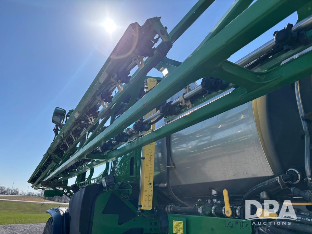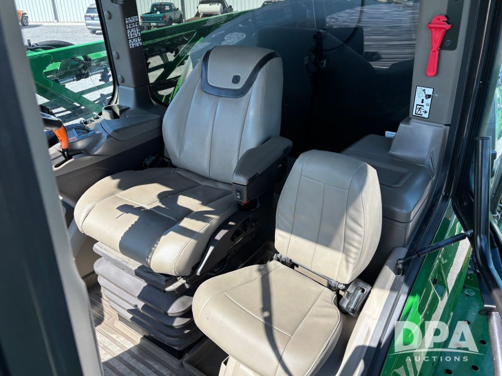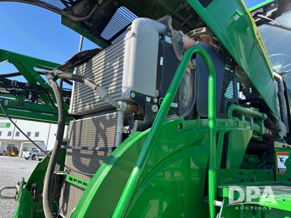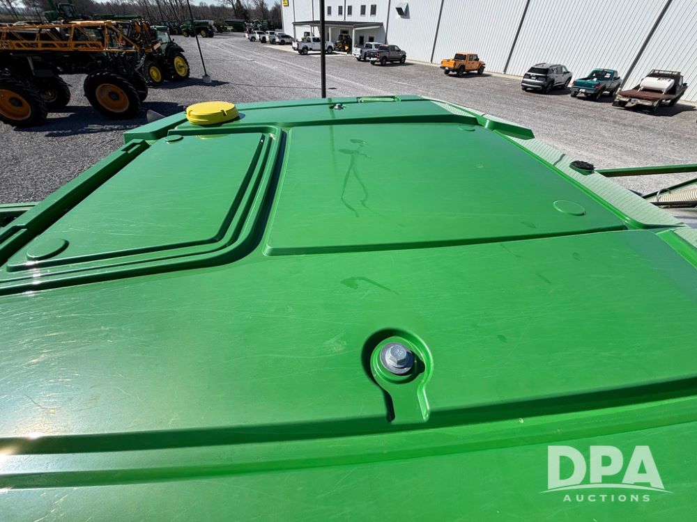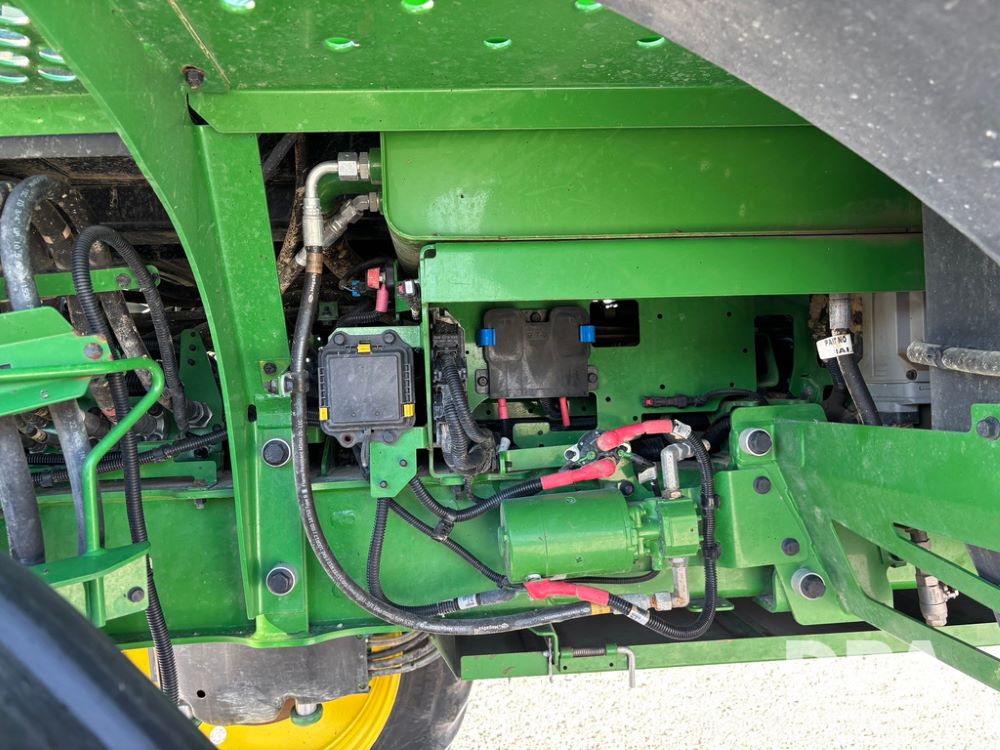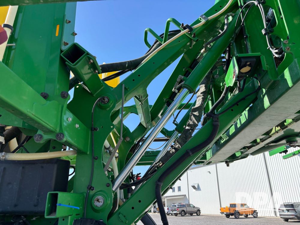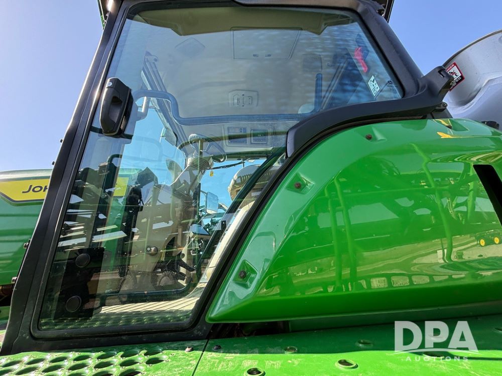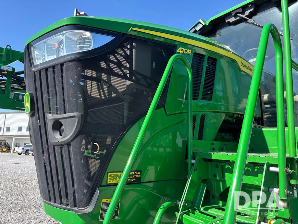 2023 John Deere 410R Sprayer (GP12953), full time 4 wheel drive with traction control, 9.0L - 6 cylinder turbo diesel engine - 310 HP (S/N RG6090U132442), dual range hydrostatic drive (25 MPH field, 35 MPH transport), JDLink MTG, CommandView 4 cab, HVAC, ultimate comfort and convenience package, auto temp control, Active II leather air suspension seat, leather buddy seat, premium touch screen Am/Fm radio, refrigerator, 1,000 gallon stainless steel liquid system, 3" left side quick fill and front fill, 120' steel boom, 1" stainless plumbing, 15" on-center spacing, (97) five position nozzle bodies, (11) section boom control valves, automatic solution control, fence row nozzles left & right, single drop foam markers, 3"x2" high flow solution pump (15 to 225 GPM), boom air purge, 5 sensor auto boom leveling, underframe crop shields, direct chemical injection system with (2) 50 gallon tanks & (1) high volume pump, hydraulic tread spacing adjustment (120-160"), auto air spring chassis leveling, on board air compressor, 380/90R46 tires, Cat 1 air filtration system, Gen 4, 4600 Command Center Gen4 GreenStar 10" color display and extended monitor, Command Center Premium 3.0 activation auto trac, section control, RowSense, Data Sync & Data Share, mechanical RowSense sensors and vision camera, premium visibility package, LED field lighting, LED beacon lights, rear view camera, Integrated SF7000 SF-1 global position receiver, shows 1,655 hours.