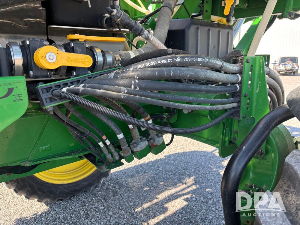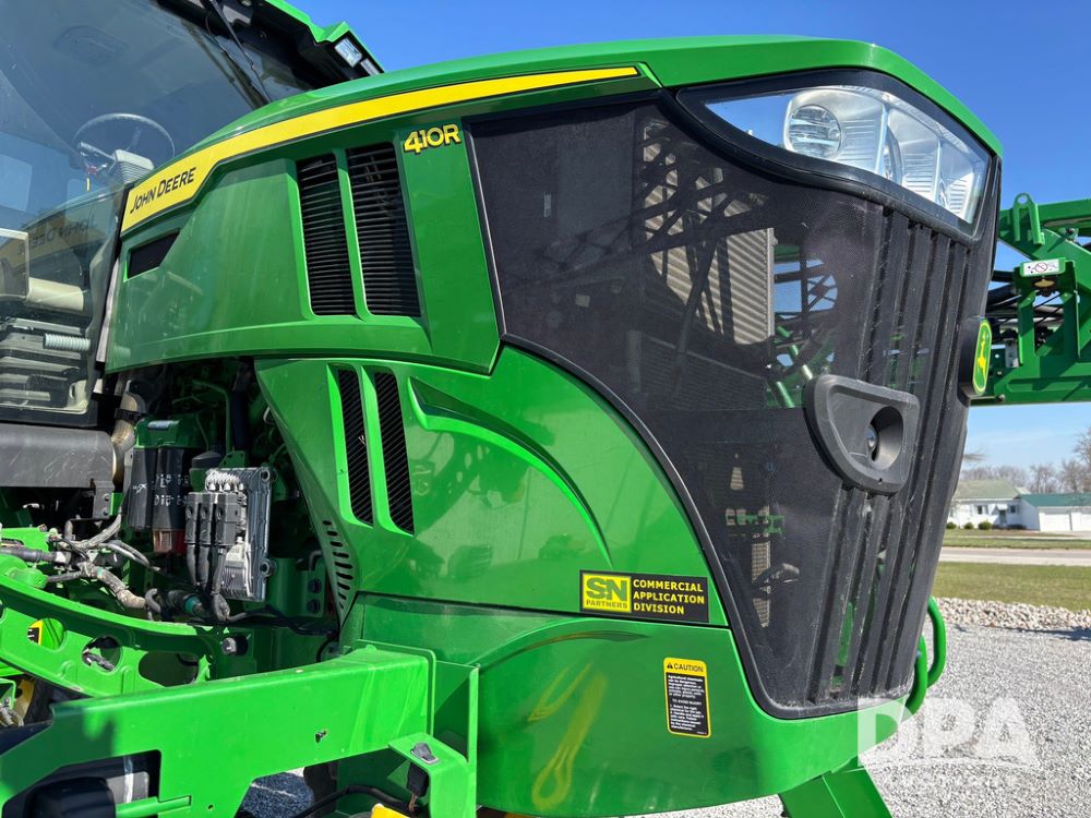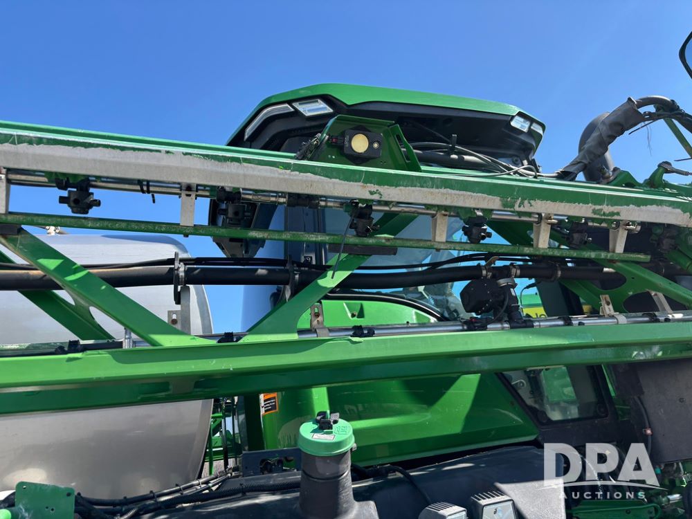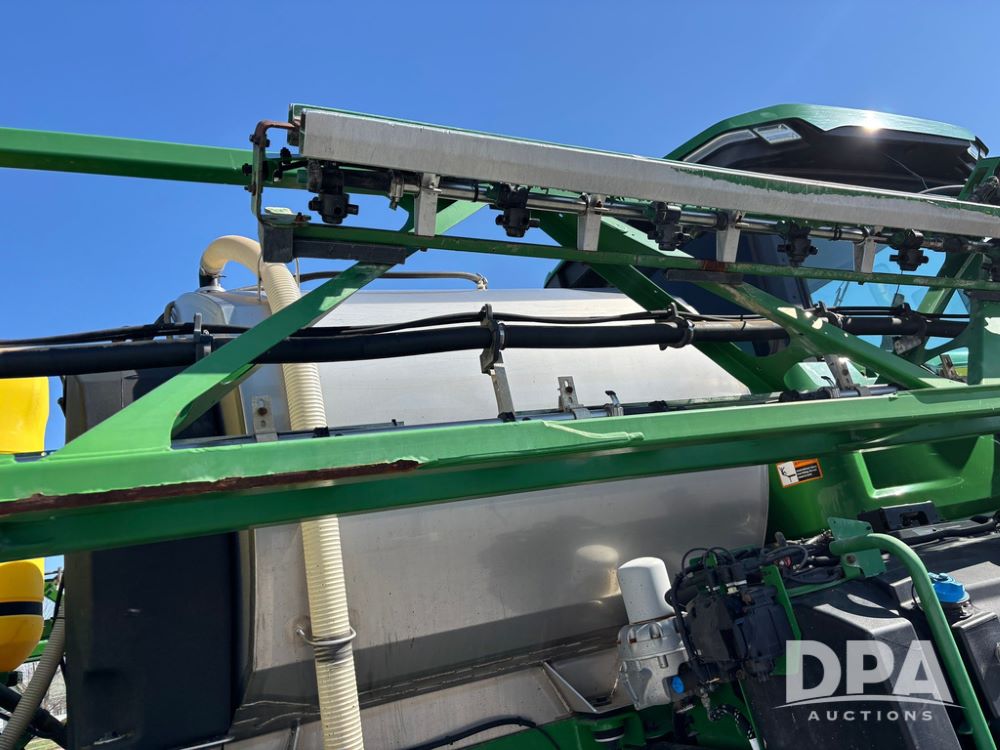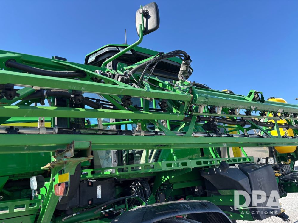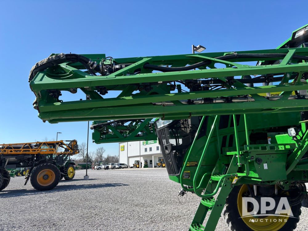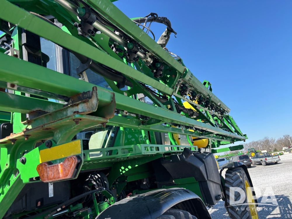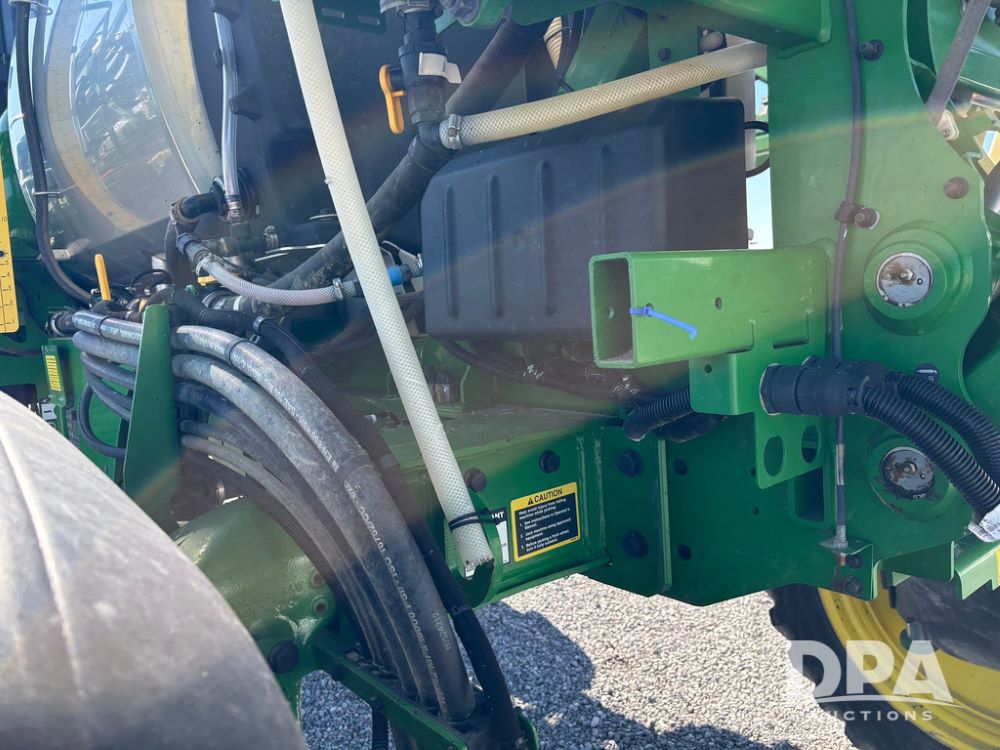 2023 John Deere 410R Sprayer (GP12953), full time 4 wheel drive with traction control, 9.0L - 6 cylinder turbo diesel engine - 310 HP (S/N RG6090U132442), dual range hydrostatic drive (25 MPH field, 35 MPH transport), JDLink MTG, CommandView 4 cab, HVAC, ultimate comfort and convenience package, auto temp control, Active II leather air suspension seat, leather buddy seat, premium touch screen Am/Fm radio, refrigerator, 1,000 gallon stainless steel liquid system, 3" left side quick fill and front fill, 120' steel boom, 1" stainless plumbing, 15" on-center spacing, (97) five position nozzle bodies, (11) section boom control valves, automatic solution control, fence row nozzles left & right, single drop foam markers, 3"x2" high flow solution pump (15 to 225 GPM), boom air purge, 5 sensor auto boom leveling, underframe crop shields, direct chemical injection system with (2) 50 gallon tanks & (1) high volume pump, hydraulic tread spacing adjustment (120-160"), auto air spring chassis leveling, on board air compressor, 380/90R46 tires, Cat 1 air filtration system, Gen 4, 4600 Command Center Gen4 GreenStar 10" color display and extended monitor, Command Center Premium 3.0 activation auto trac, section control, RowSense, Data Sync & Data Share, mechanical RowSense sensors and vision camera, premium visibility package, LED field lighting, LED beacon lights, rear view camera, Integrated SF7000 SF-1 global position receiver, shows 1,655 hours.