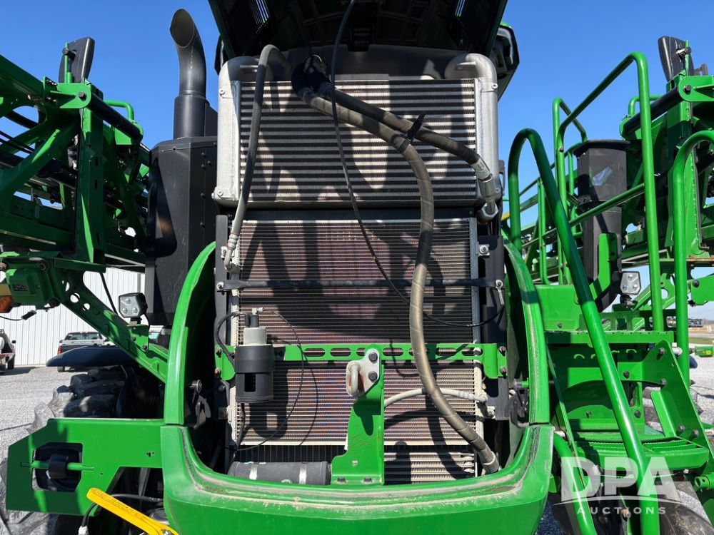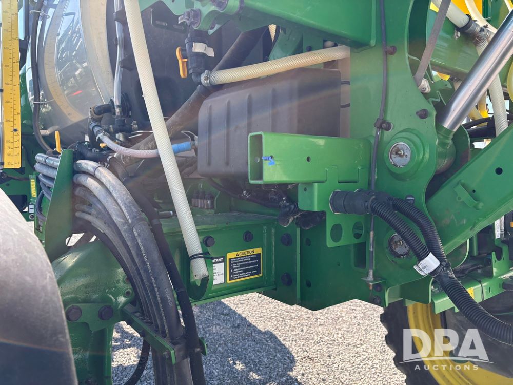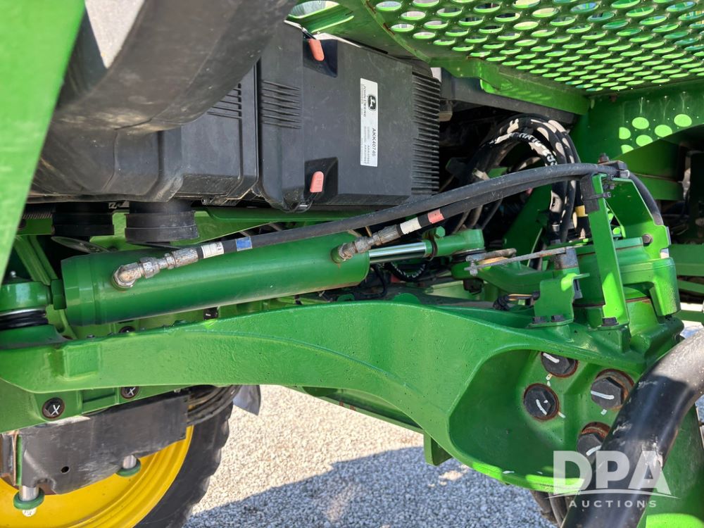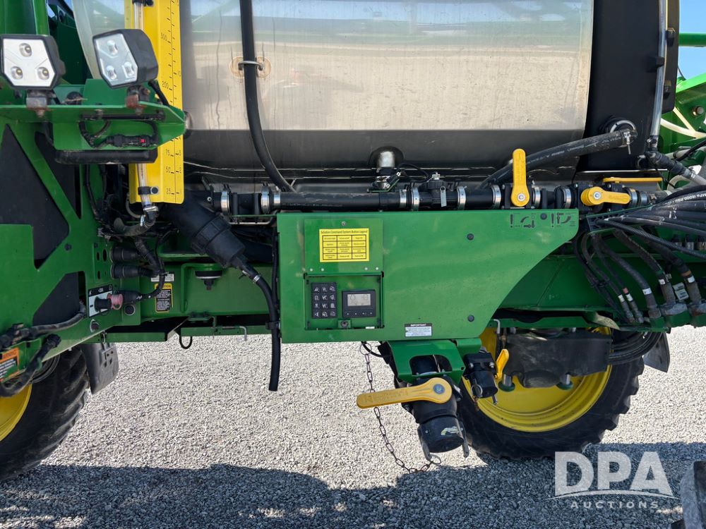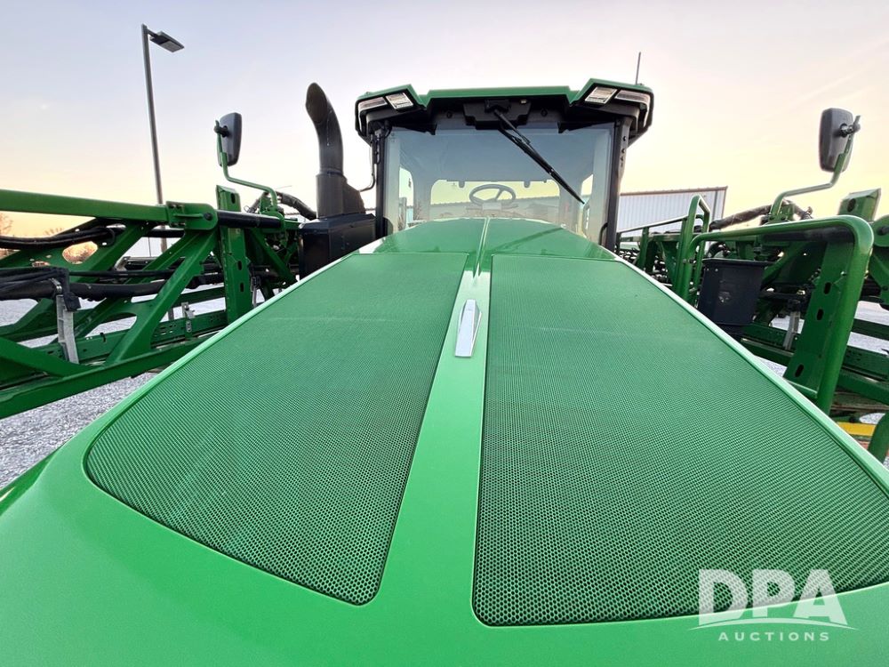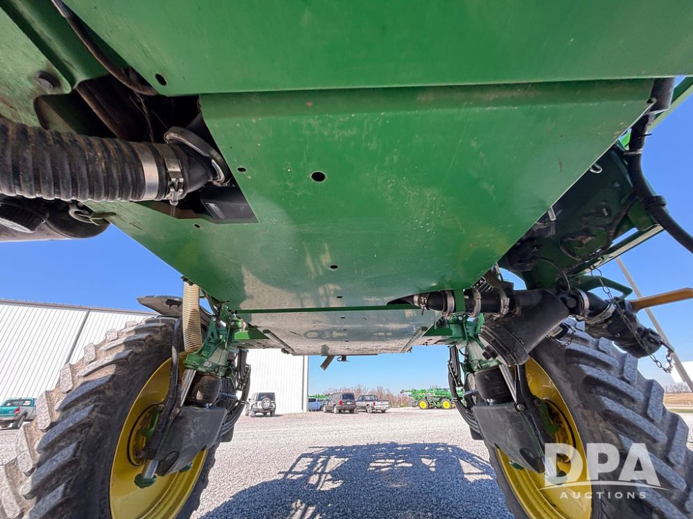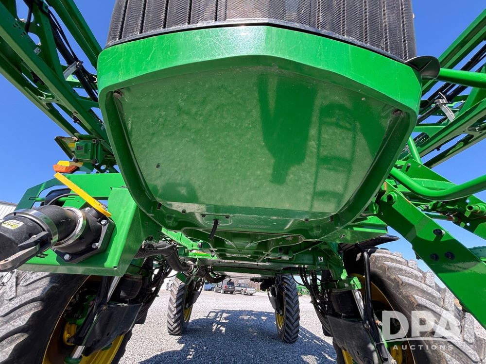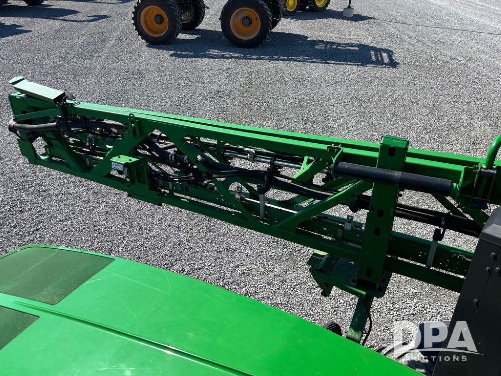 2023 John Deere 410R Sprayer (GP12953), full time 4 wheel drive with traction control, 9.0L - 6 cylinder turbo diesel engine - 310 HP (S/N RG6090U132442), dual range hydrostatic drive (25 MPH field, 35 MPH transport), JDLink MTG, CommandView 4 cab, HVAC, ultimate comfort and convenience package, auto temp control, Active II leather air suspension seat, leather buddy seat, premium touch screen Am/Fm radio, refrigerator, 1,000 gallon stainless steel liquid system, 3" left side quick fill and front fill, 120' steel boom, 1" stainless plumbing, 15" on-center spacing, (97) five position nozzle bodies, (11) section boom control valves, automatic solution control, fence row nozzles left & right, single drop foam markers, 3"x2" high flow solution pump (15 to 225 GPM), boom air purge, 5 sensor auto boom leveling, underframe crop shields, direct chemical injection system with (2) 50 gallon tanks & (1) high volume pump, hydraulic tread spacing adjustment (120-160"), auto air spring chassis leveling, on board air compressor, 380/90R46 tires, Cat 1 air filtration system, Gen 4, 4600 Command Center Gen4 GreenStar 10" color display and extended monitor, Command Center Premium 3.0 activation auto trac, section control, RowSense, Data Sync & Data Share, mechanical RowSense sensors and vision camera, premium visibility package, LED field lighting, LED beacon lights, rear view camera, Integrated SF7000 SF-1 global position receiver, shows 1,655 hours.
