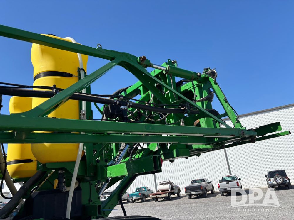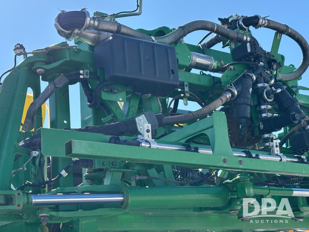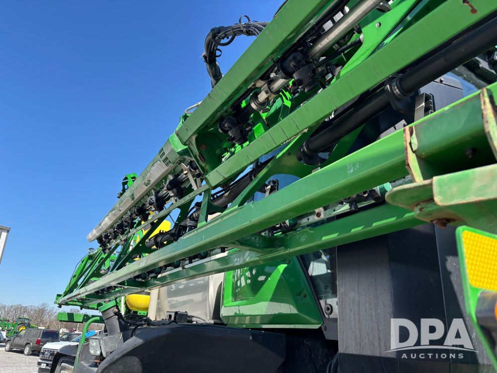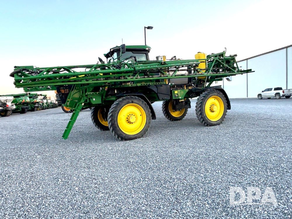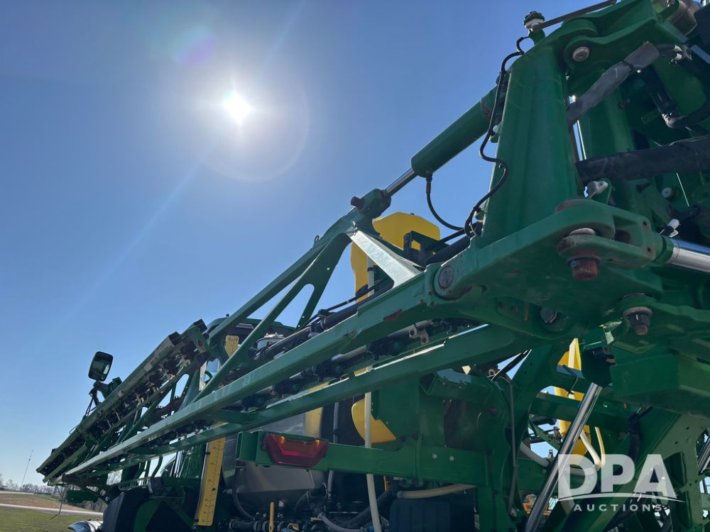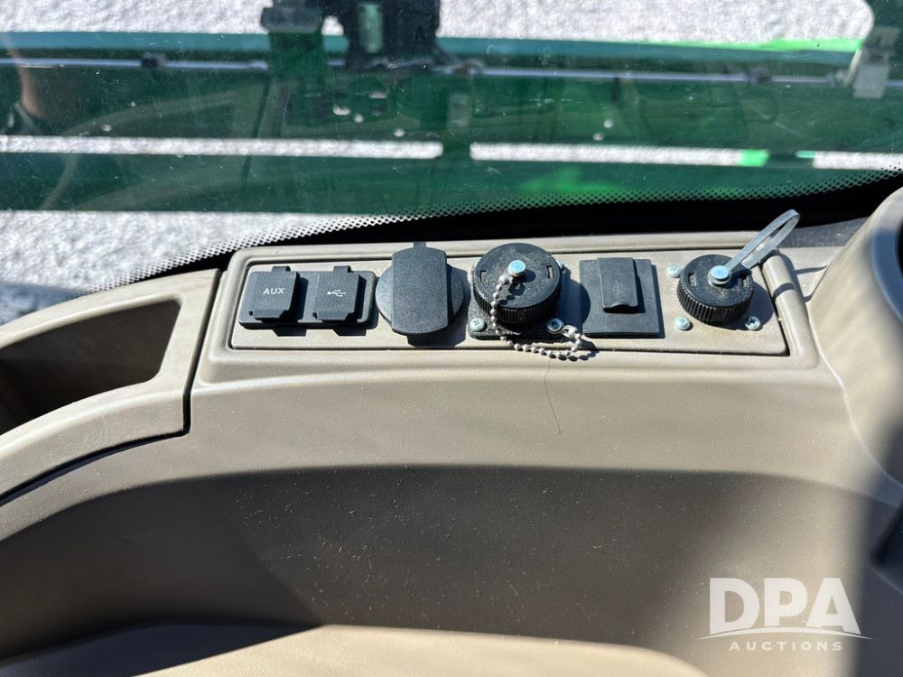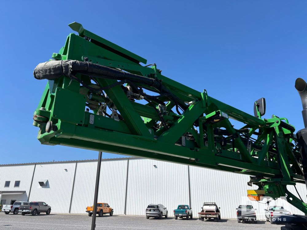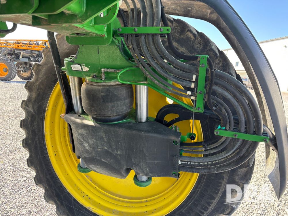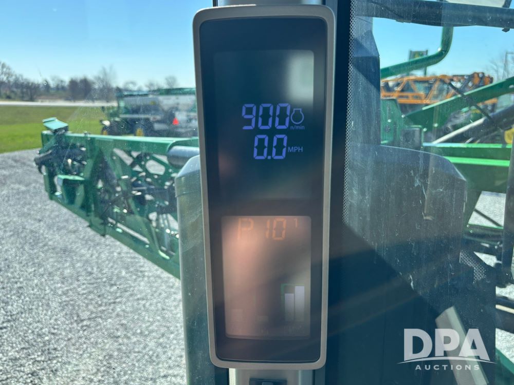 2023 John Deere 410R Sprayer (GP12953), full time 4 wheel drive with traction control, 9.0L - 6 cylinder turbo diesel engine - 310 HP (S/N RG6090U132442), dual range hydrostatic drive (25 MPH field, 35 MPH transport), JDLink MTG, CommandView 4 cab, HVAC, ultimate comfort and convenience package, auto temp control, Active II leather air suspension seat, leather buddy seat, premium touch screen Am/Fm radio, refrigerator, 1,000 gallon stainless steel liquid system, 3" left side quick fill and front fill, 120' steel boom, 1" stainless plumbing, 15" on-center spacing, (97) five position nozzle bodies, (11) section boom control valves, automatic solution control, fence row nozzles left & right, single drop foam markers, 3"x2" high flow solution pump (15 to 225 GPM), boom air purge, 5 sensor auto boom leveling, underframe crop shields, direct chemical injection system with (2) 50 gallon tanks & (1) high volume pump, hydraulic tread spacing adjustment (120-160"), auto air spring chassis leveling, on board air compressor, 380/90R46 tires, Cat 1 air filtration system, Gen 4, 4600 Command Center Gen4 GreenStar 10" color display and extended monitor, Command Center Premium 3.0 activation auto trac, section control, RowSense, Data Sync & Data Share, mechanical RowSense sensors and vision camera, premium visibility package, LED field lighting, LED beacon lights, rear view camera, Integrated SF7000 SF-1 global position receiver, shows 1,655 hours.