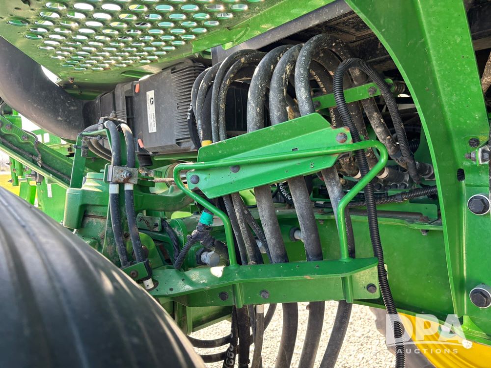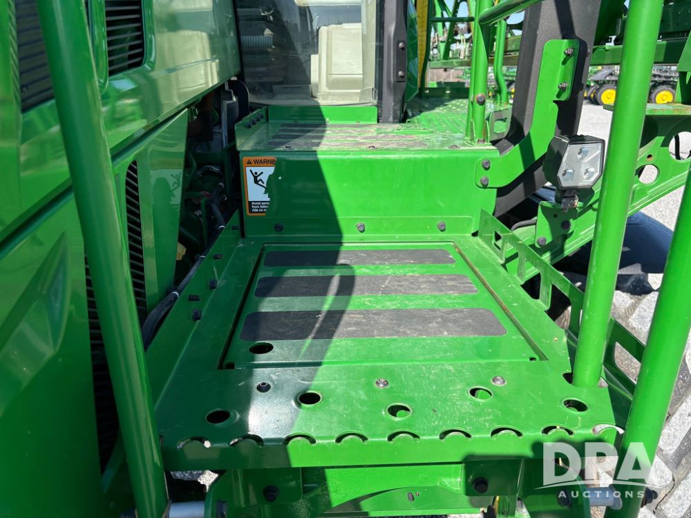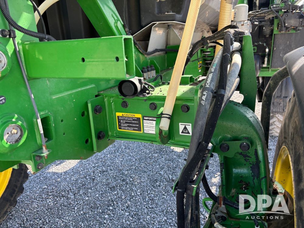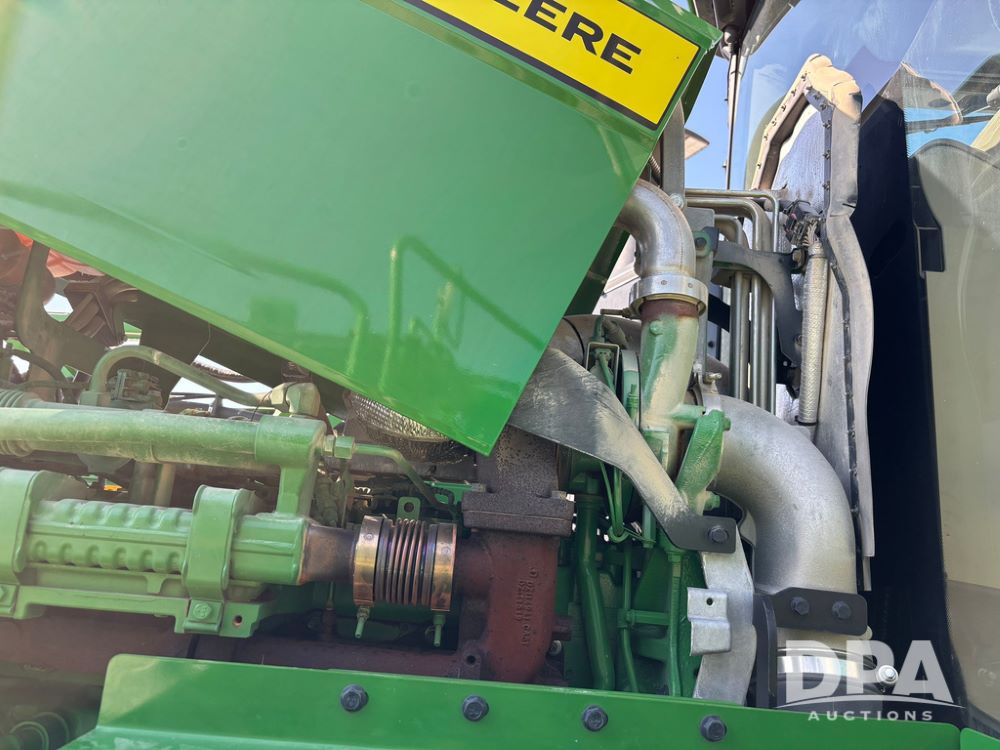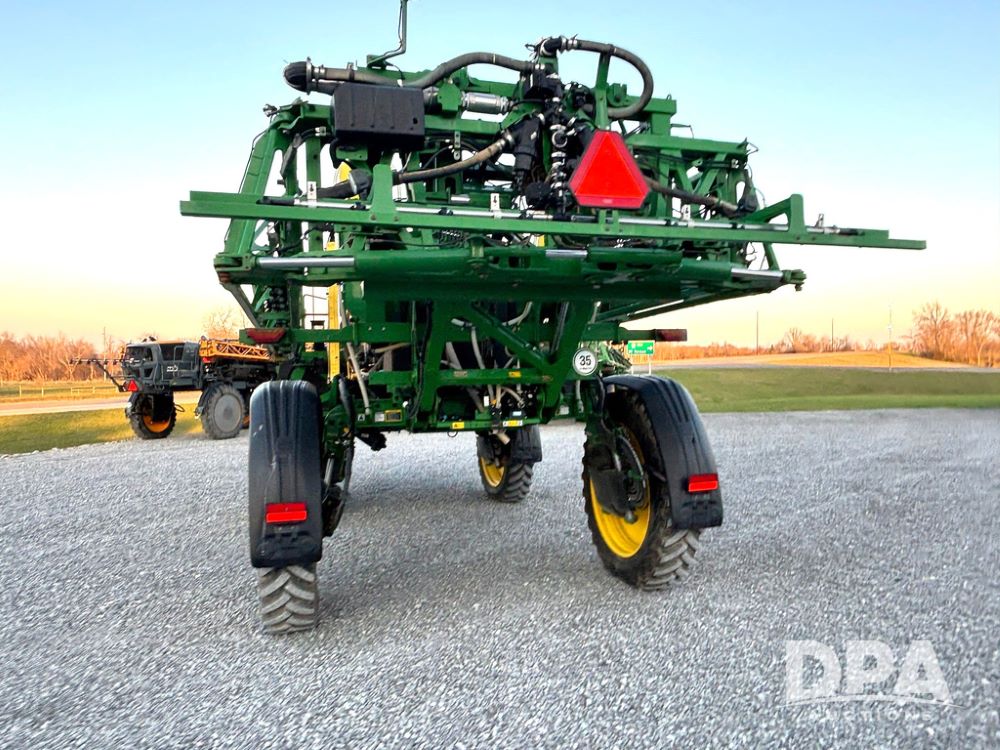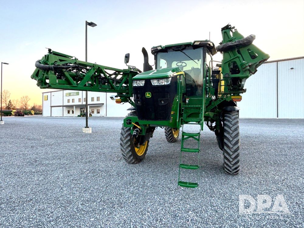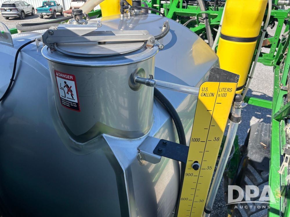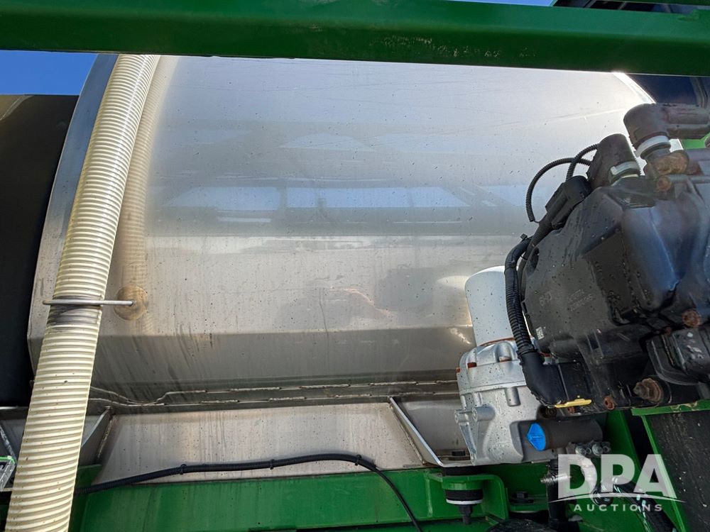2023 John Deere 410R Sprayer (GP12953), full time 4 wheel drive with traction control, 9.0L - 6 cylinder turbo diesel engine - 310 HP (S/N RG6090U132442), dual range hydrostatic drive (25 MPH field, 35 MPH transport), JDLink MTG, CommandView 4 cab, HVAC, ultimate comfort and convenience package, auto temp control, Active II leather air suspension seat, leather buddy seat, premium touch screen Am/Fm radio, refrigerator, 1,000 gallon stainless steel liquid system, 3" left side quick fill and front fill, 120' steel boom, 1" stainless plumbing, 15" on-center spacing, (97) five position nozzle bodies, (11) section boom control valves, automatic solution control, fence row nozzles left & right, single drop foam markers, 3"x2" high flow solution pump (15 to 225 GPM), boom air purge, 5 sensor auto boom leveling, underframe crop shields, direct chemical injection system with (2) 50 gallon tanks & (1) high volume pump, hydraulic tread spacing adjustment (120-160"), auto air spring chassis leveling, on board air compressor, 380/90R46 tires, Cat 1 air filtration system, Gen 4, 4600 Command Center Gen4 GreenStar 10" color display and extended monitor, Command Center Premium 3.0 activation auto trac, section control, RowSense, Data Sync & Data Share, mechanical RowSense sensors and vision camera, premium visibility package, LED field lighting, LED beacon lights, rear view camera, Integrated SF7000 SF-1 global position receiver, shows 1,655 hours.